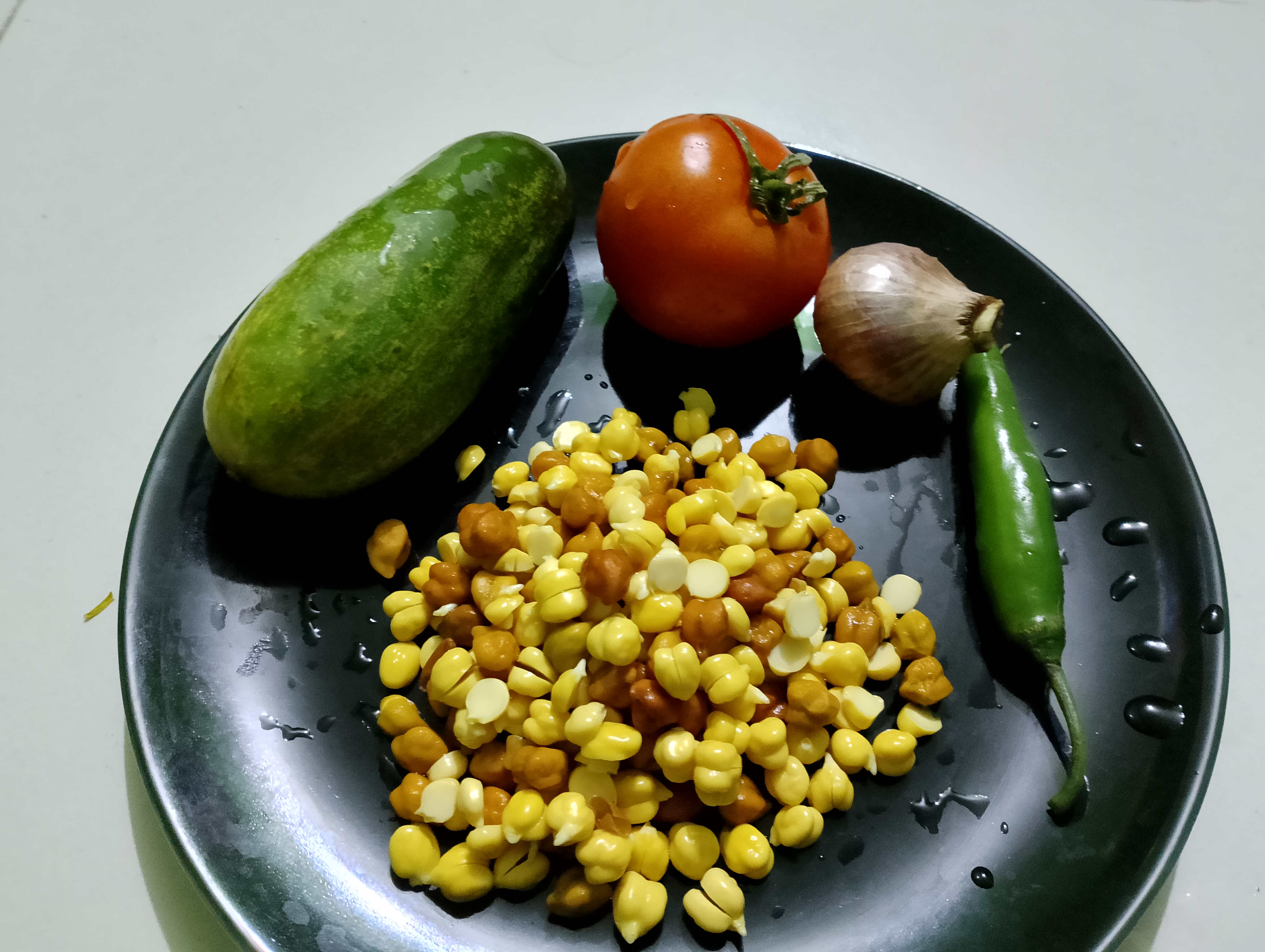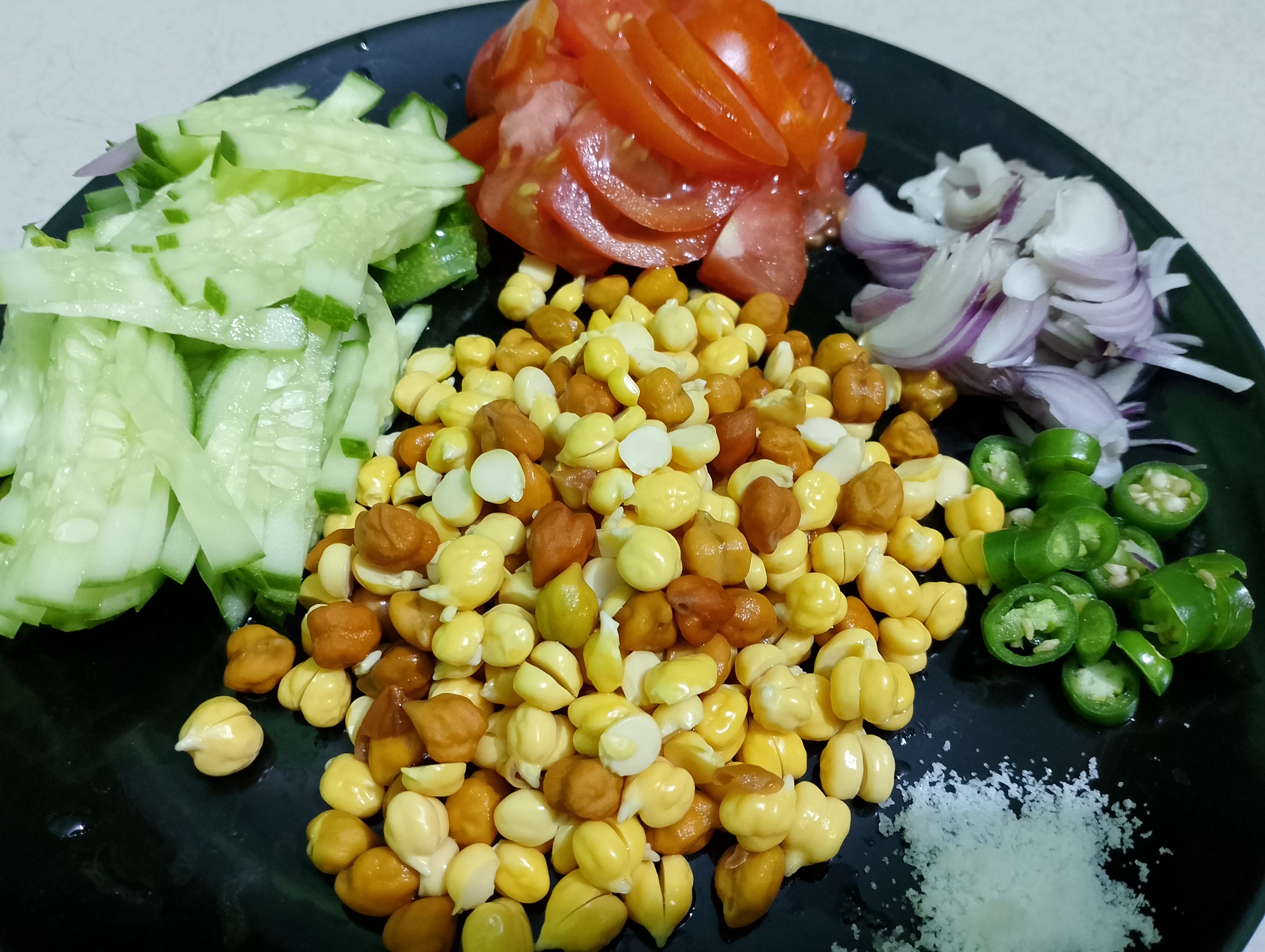 সকাল বেলা অথবা সেহরি খাওয়া শেষ করে দু-মুঠো ছোলা পানিতে ভিজিয়ে রাখতে হবে। তারপর ইফতারের কিছুক্ষণ আগে ছোলা গুলো পরিষ্কার পানি দিয়ে ধুয়ে একটি পাত্রে রাখতে হবে। যদি ছোলার চামড়া সহ খেতে পারেন, তাহলে ভালো আর যদি চামড়া ফেলে দেন, তাহলে সেটাও করতে পারেন। তারপর খিরা, পেঁয়াজ, কাঁচা মরিচ কেটে কুচি কুচি করে নিতে হবে।