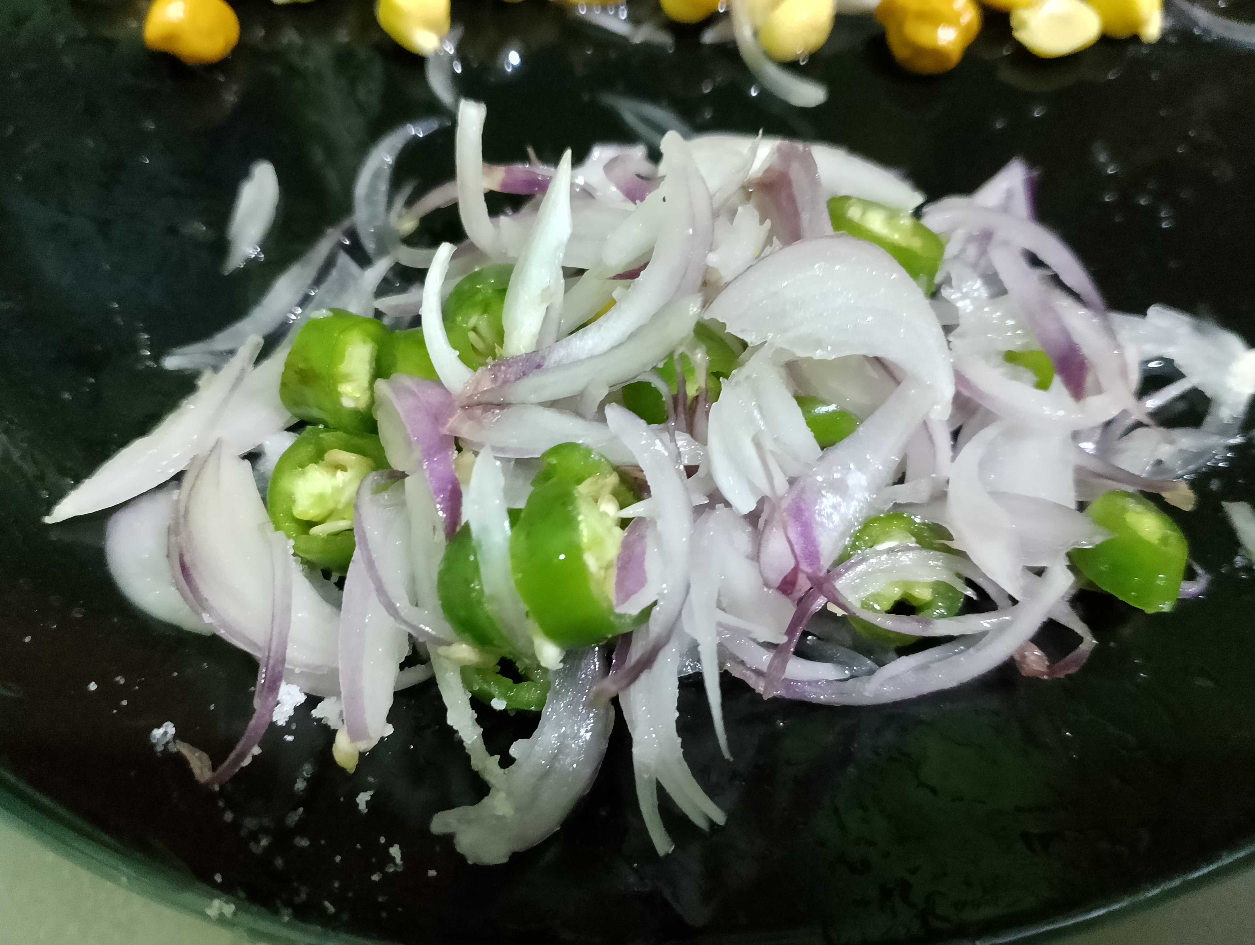 এই পর্যায়ে পেঁয়াজ কুচি, কাঁচা মরিচ, লবন ও তেল দিয়ে ভালো ভাবে মাখিয়ে নিলাম।