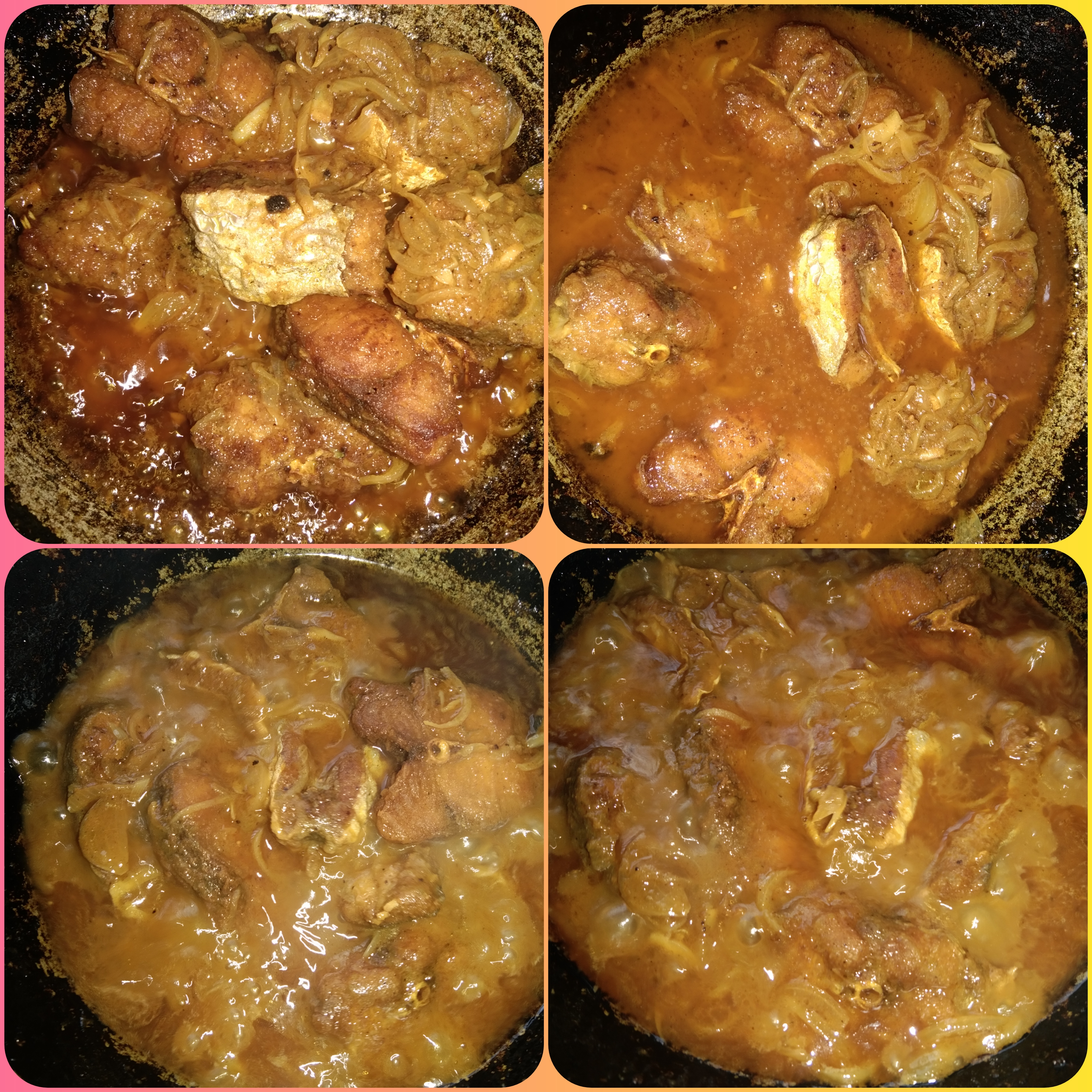 - মাছ গুলো কে দেওয়ার পর ভালো করে নেড়ে চেড়ে নিলাম। তার পরে ভালো করে কষিয়ে নিলাম। এবার আমি পরিমাণ মতো পানি দিয়ে ঢাকনা দিয়ে ঢেকে রাখলাম। কিছুক্ষণ পর ঢাকনা খুলে নেড়েচেড়ে নিলাম। আর দেখলাম ঝোল শুকিয়ে গেছে। এই পর্যায়ে আমি এখানেই রান্না শেষ করলাম।