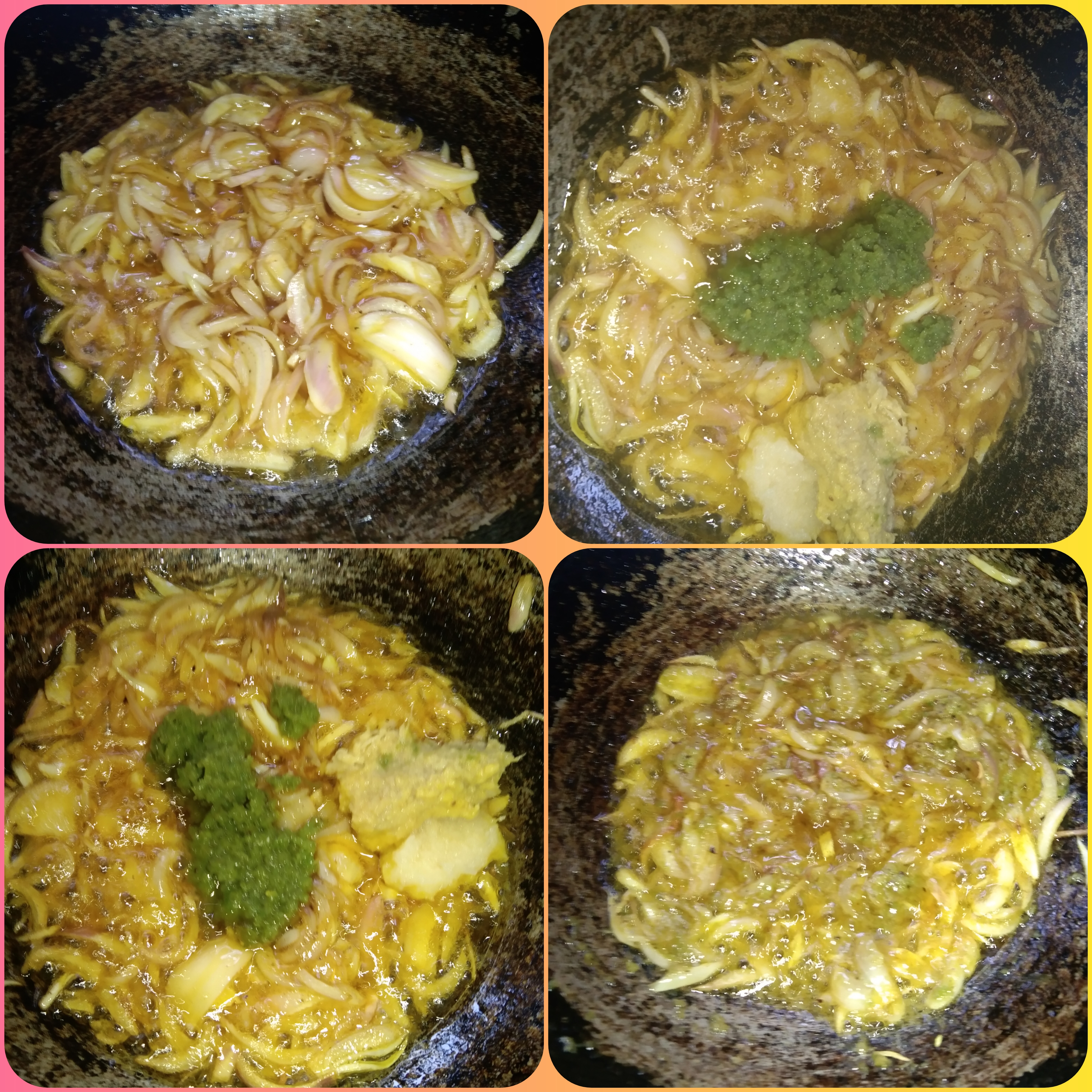 - এবার আমি পেঁয়াজ কুচি দিয়ে হালকা করে ভেজে নিলাম। তার পরে কাঁচা মরিচ বাটা,আদা বাটা, রসুন বাটা দিয়ে ভালো করে মিশিয়ে নিলাম। কিছুক্ষণ ভালো করে নেড়ে চেড়ে দিলাম।