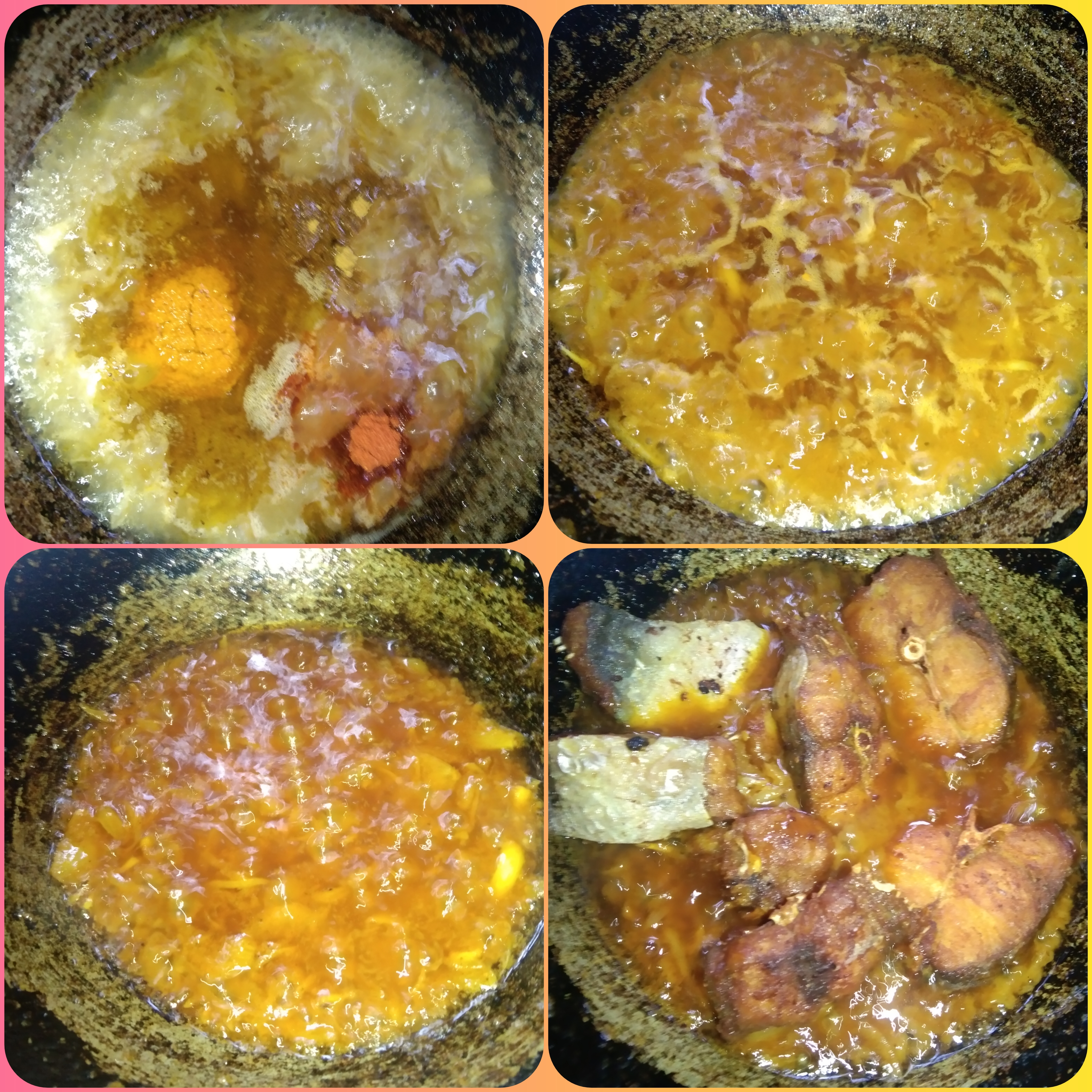 - এবার আমি সামান্য পরিমাণ পানি দিয়ে দিলাম। ভালো করে মিশিয়ে নিলাম। এবার আমি সমস্ত গুঁড়া মসলা দিয়ে ভালো করে মিশিয়ে নিলাম। তার পরে মসলা গুলোকে ভালো করে কষিয়ে নিলাম। এবার আমি ভেজে রাখা মাছ গুলো কে দিয়ে দিলাম।