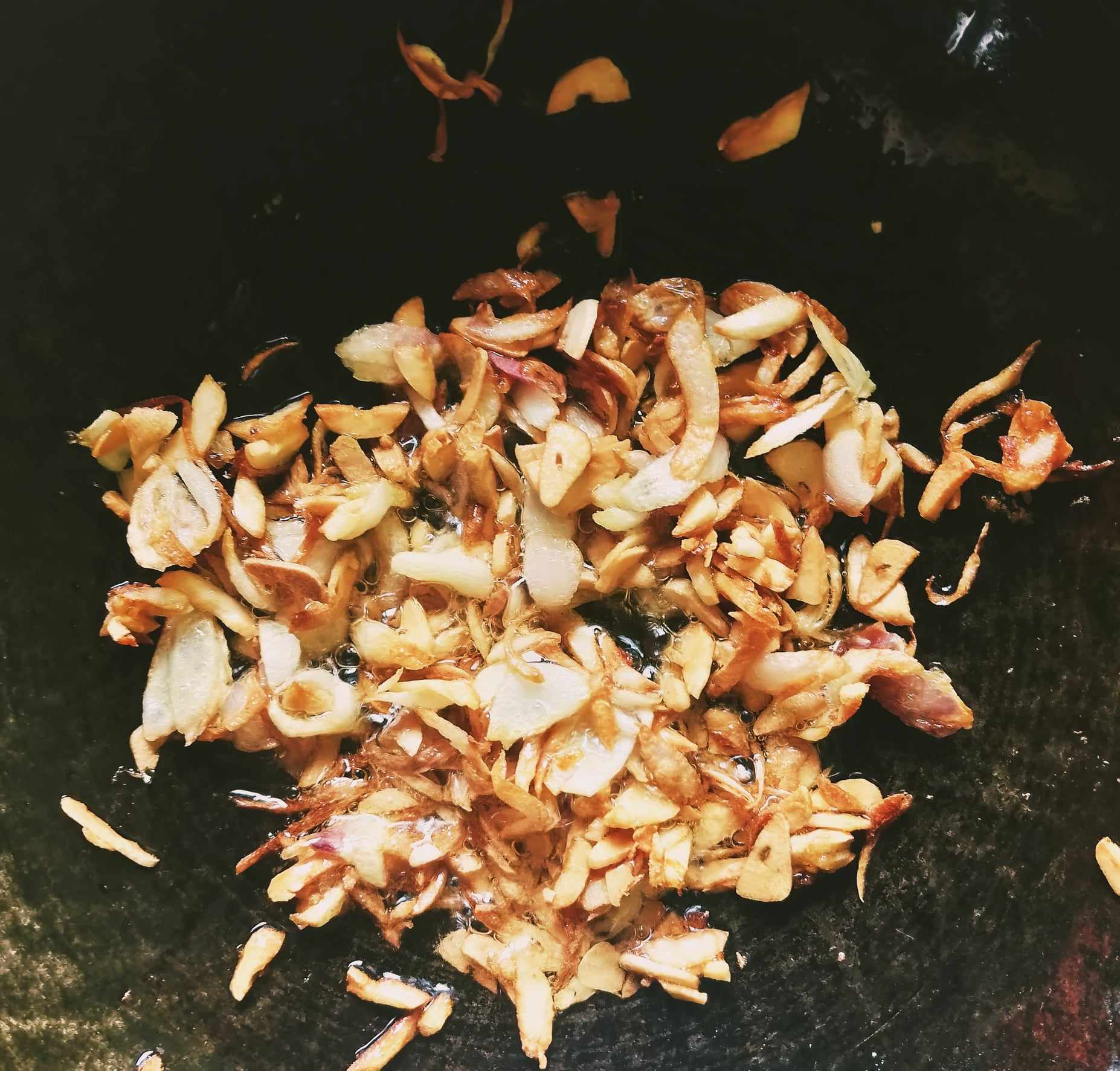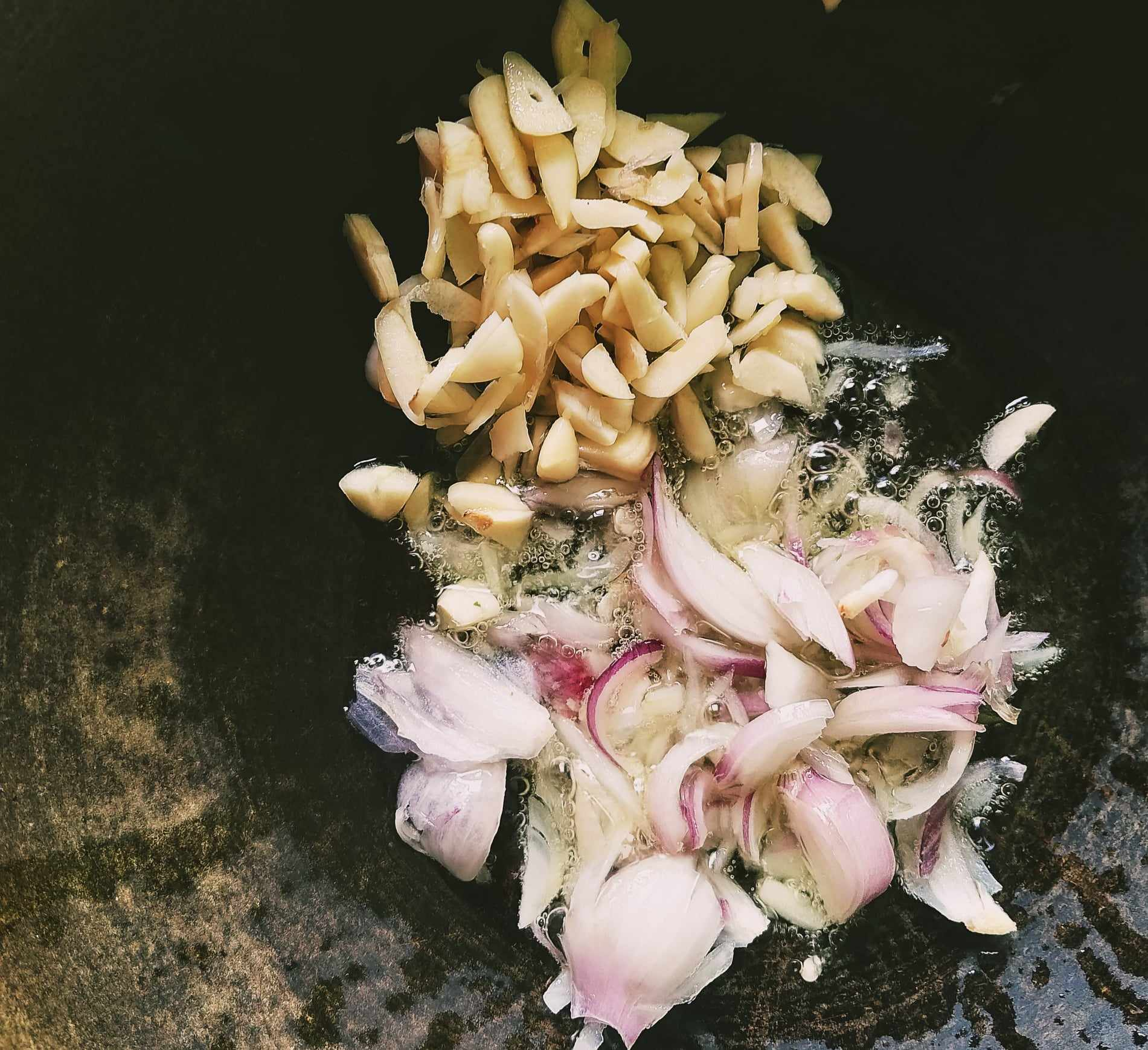 এবার তেল একটু গরম হলে তার মধ্যে পেঁয়াজ কুচি ও রসুন কুচি দিয়ে একটু ভেজে নিতে লাল করে নিতে হ হবে।
