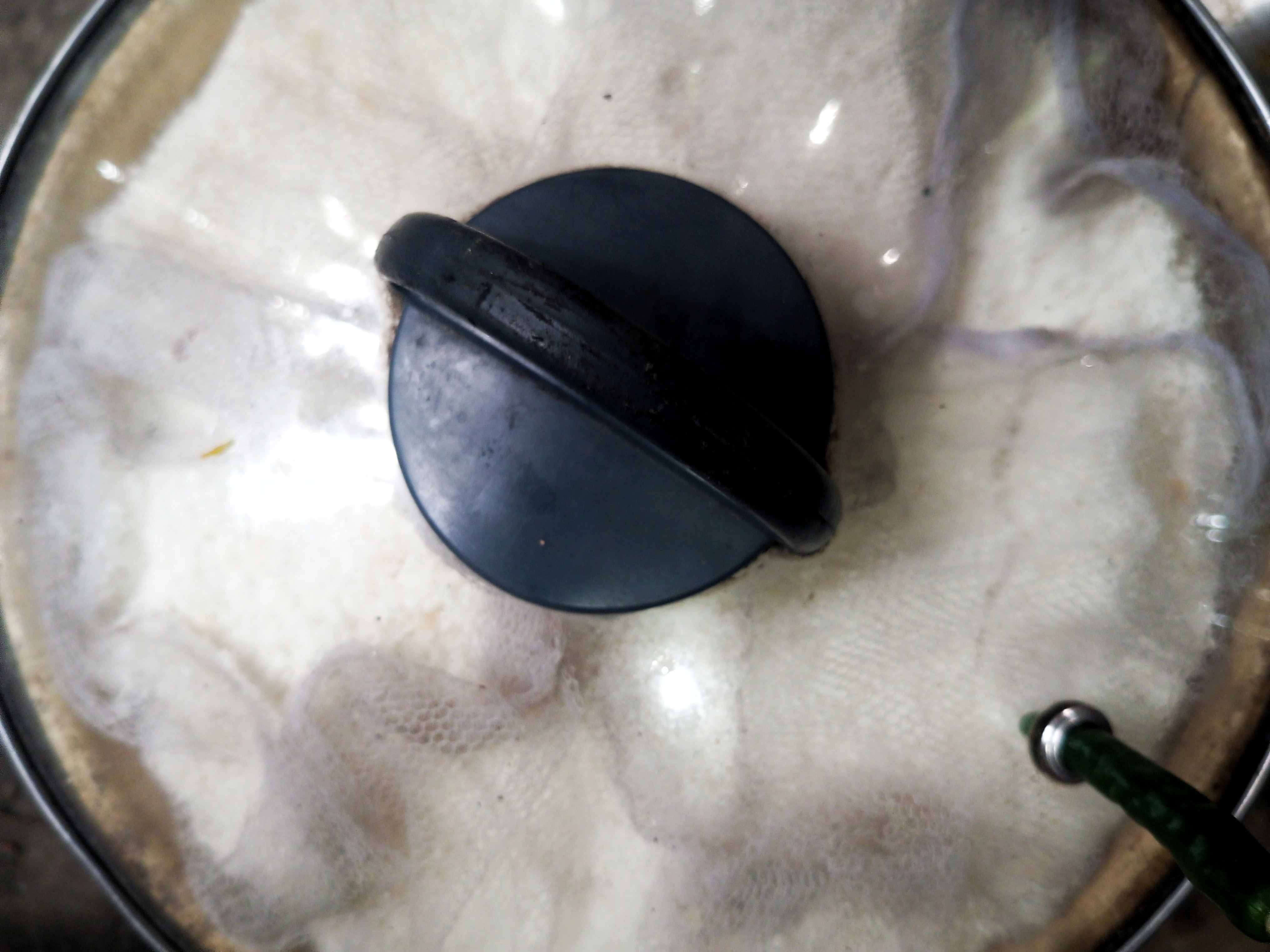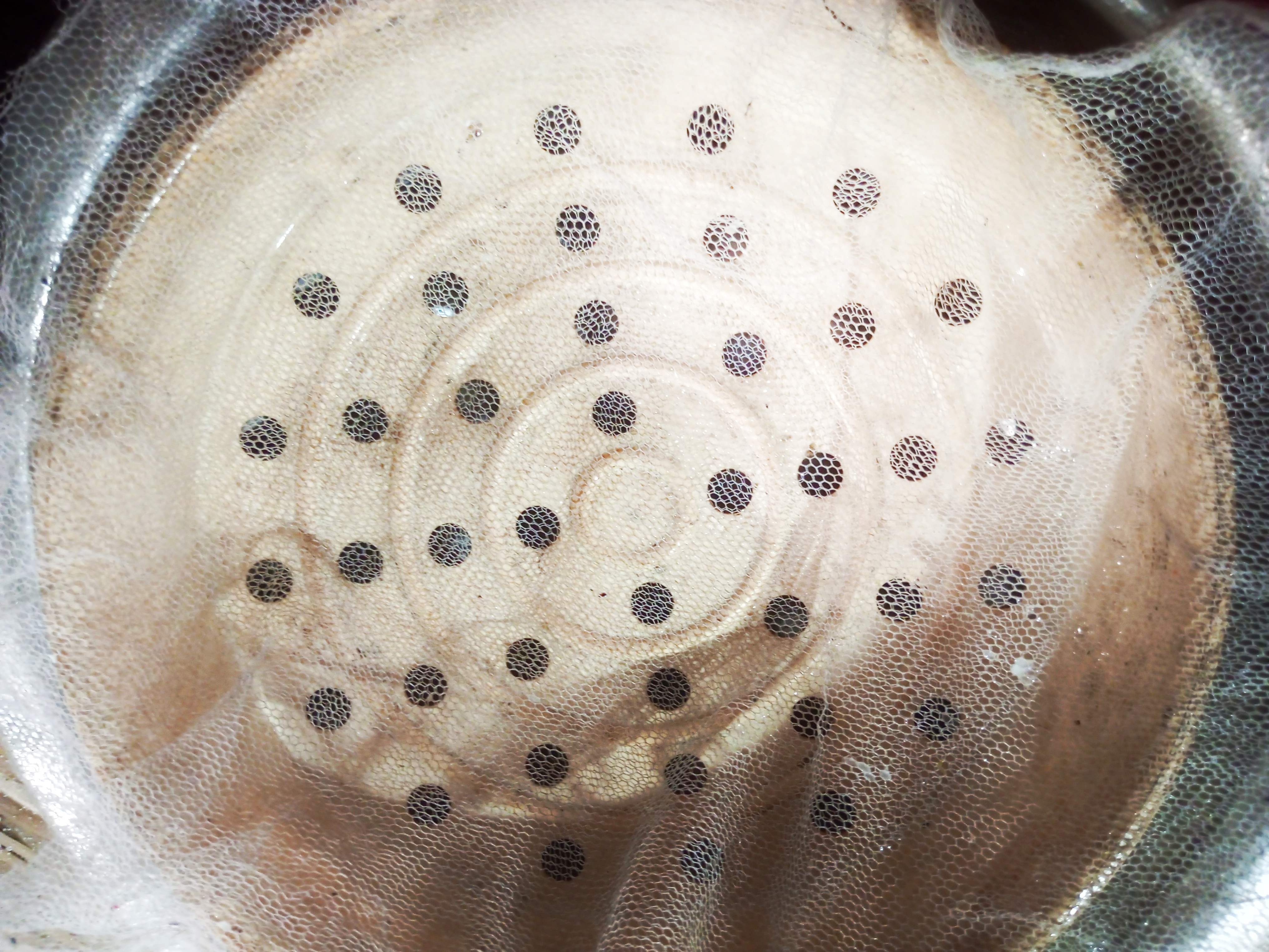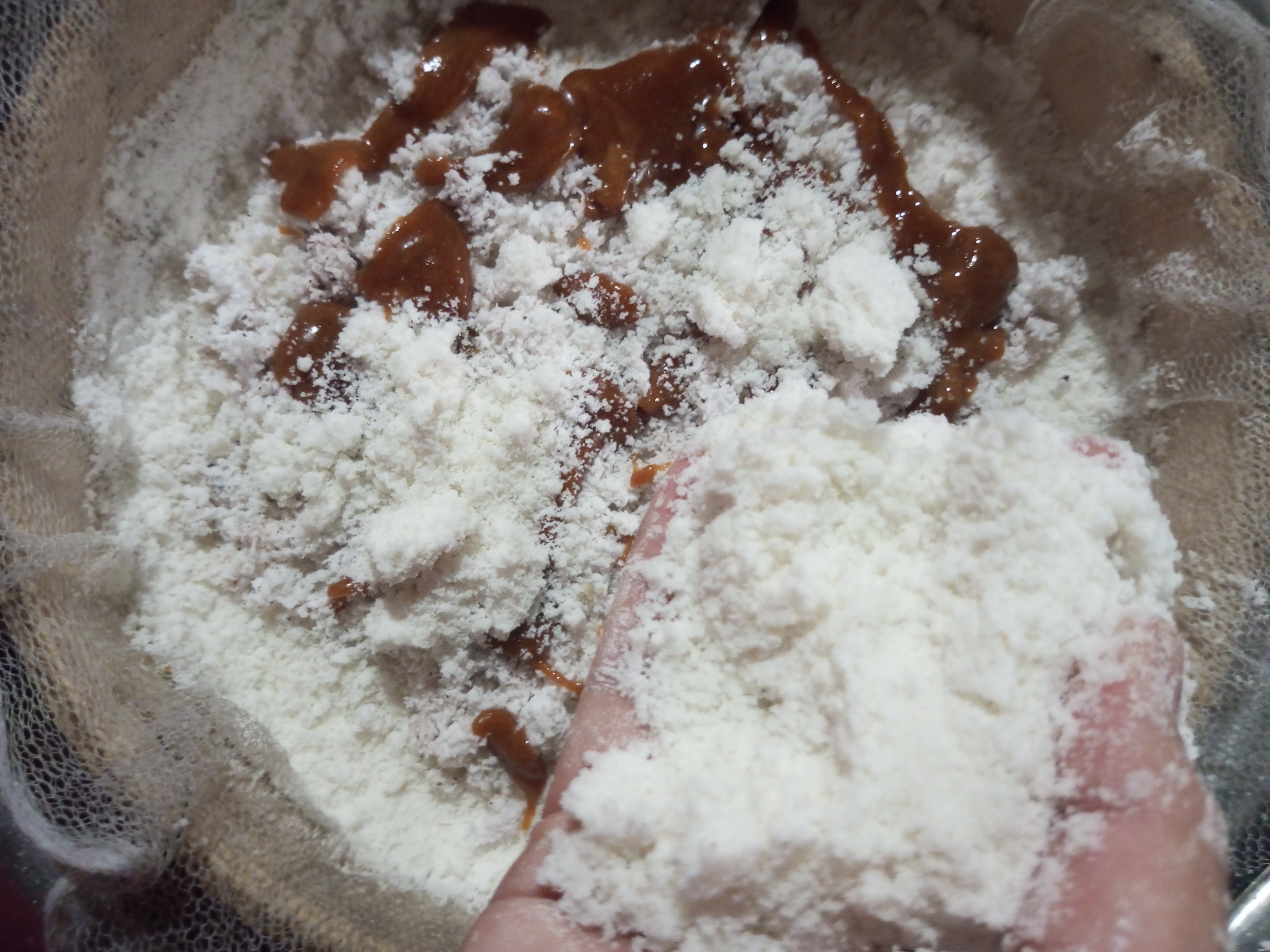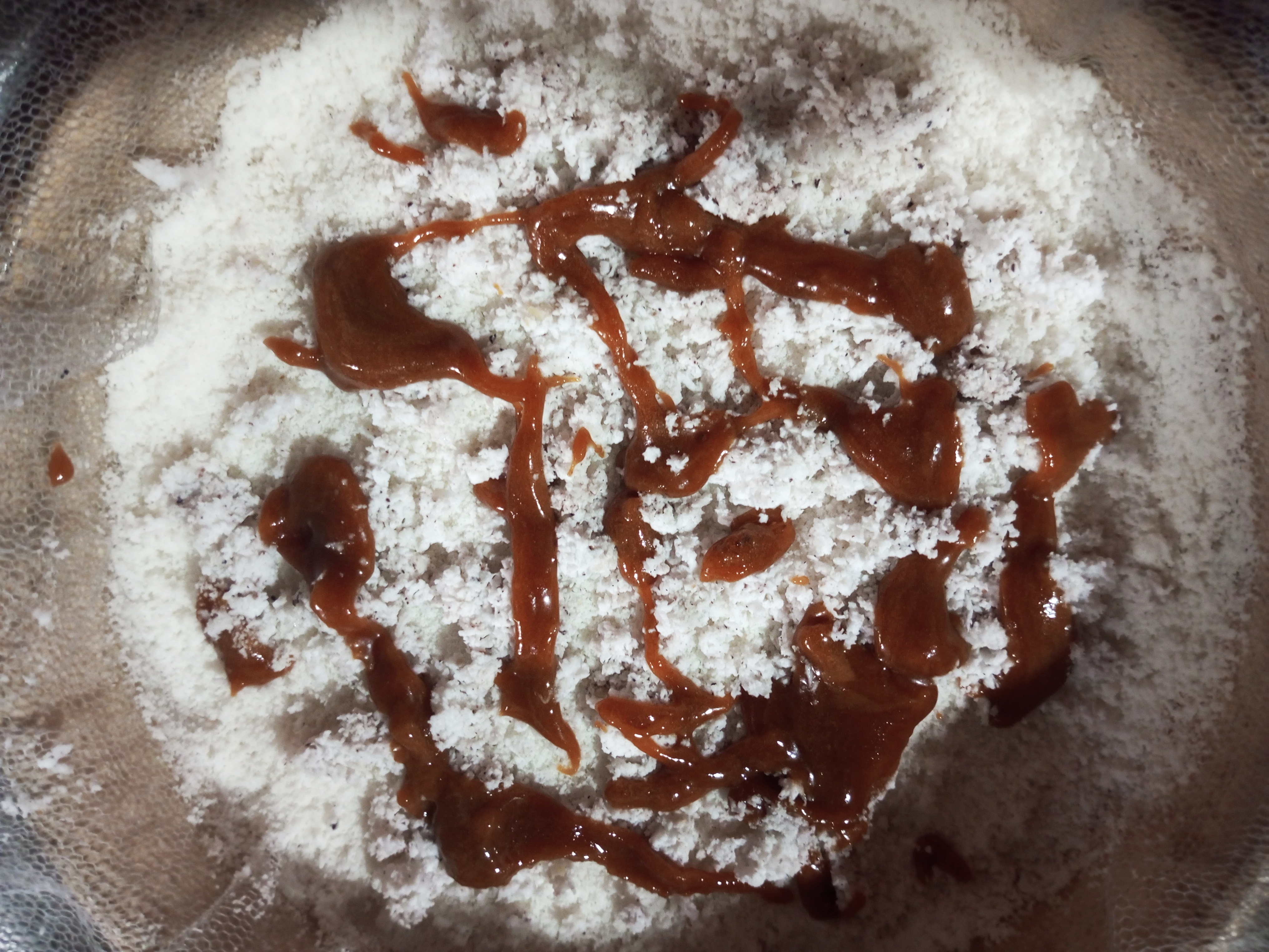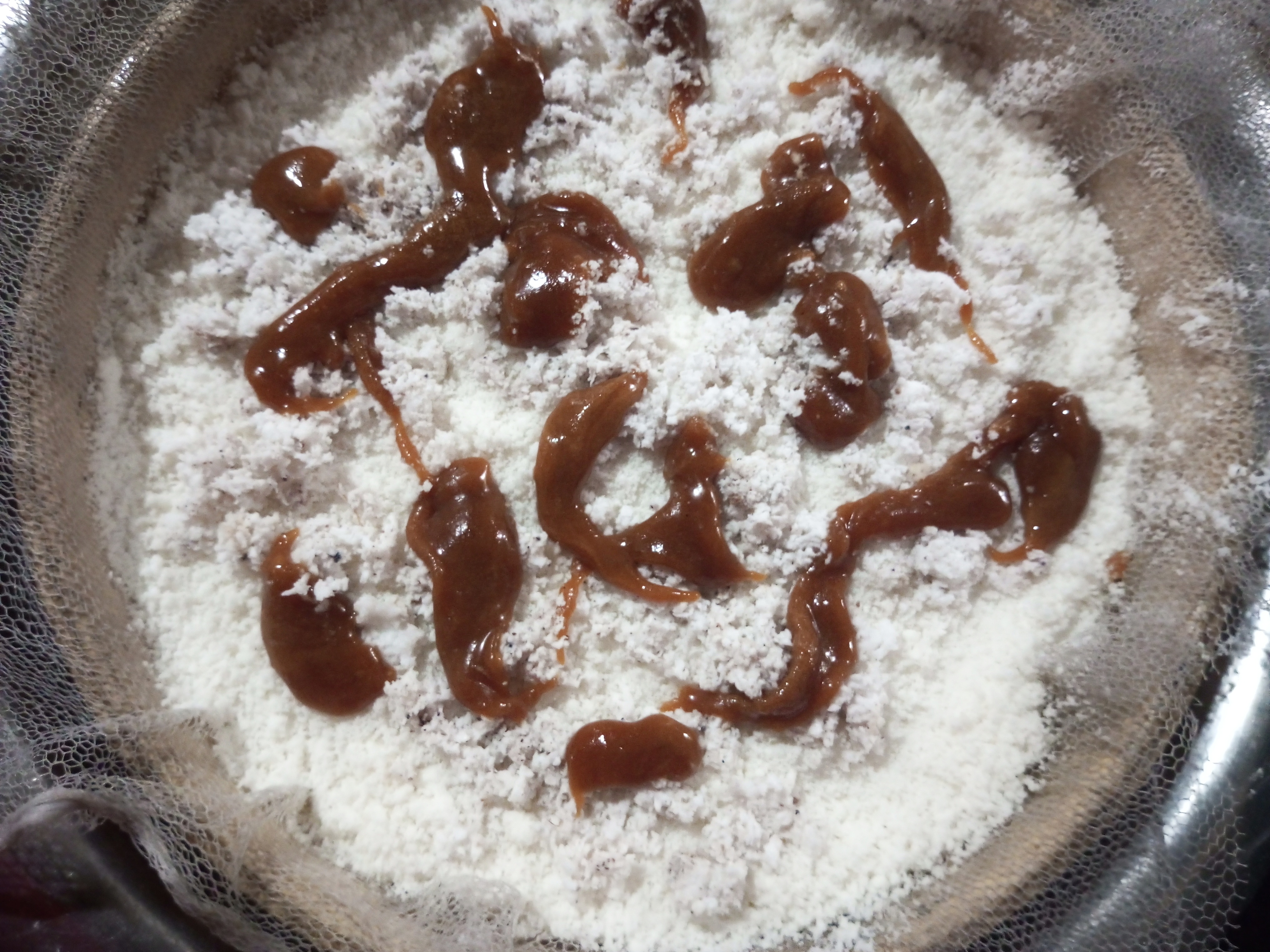 এখন রাইস কুকারে যে ছিদ্র বাটিটা থাকে সেটা নিয়ে নিয়েছি। পাত্রটার উপর একটি পরিষ্কার নেট বিছিয়ে নিয়েছি। এখন এই পাত্রটার উপর মিক্সড করা চালের গুড়া পাতলা করে ছড়িয়ে দিব। এরপর দিয়ে দিব নারকেল। নারকেলের উপর দিয়ে দিব খাঁটি খেঁজুরের গুড়।
