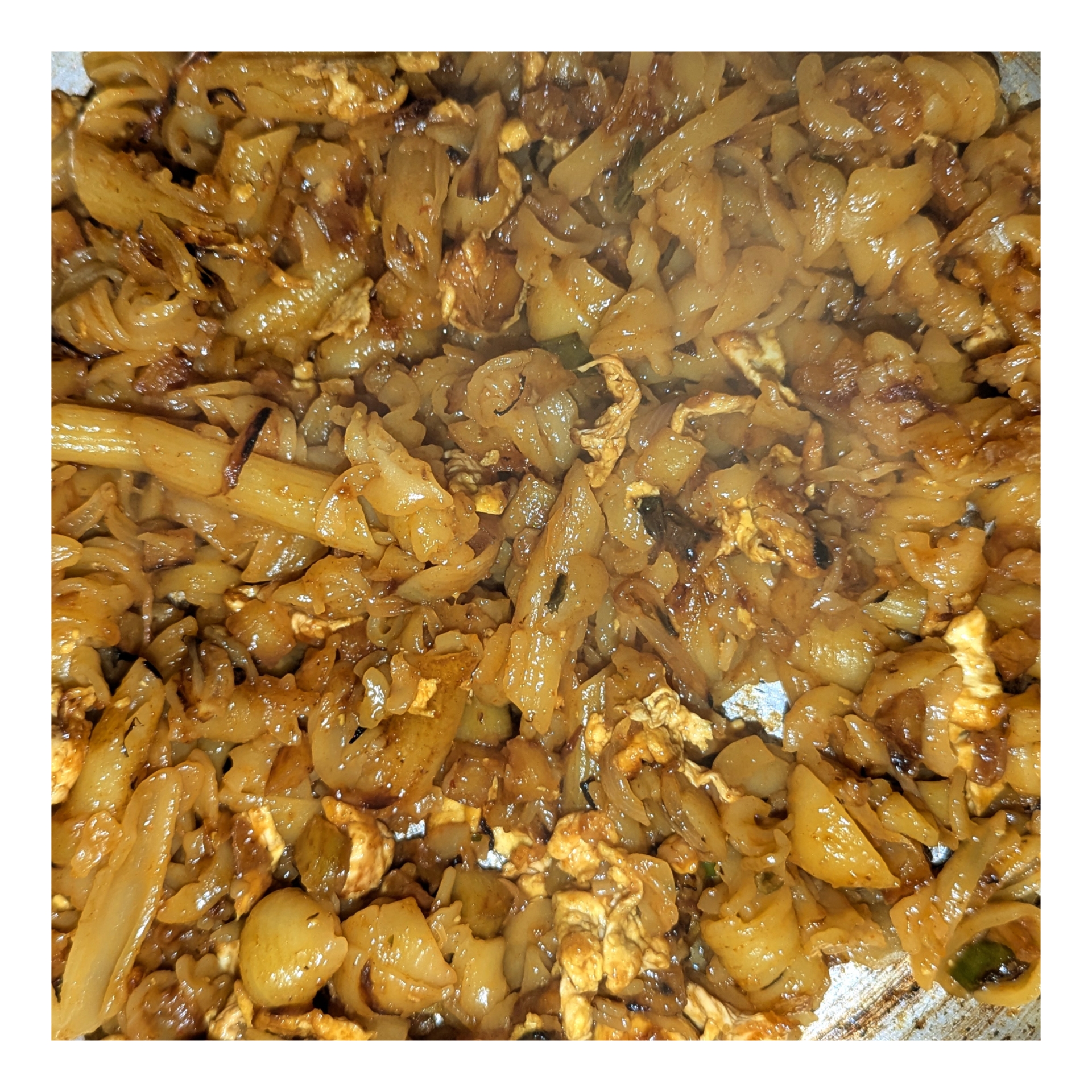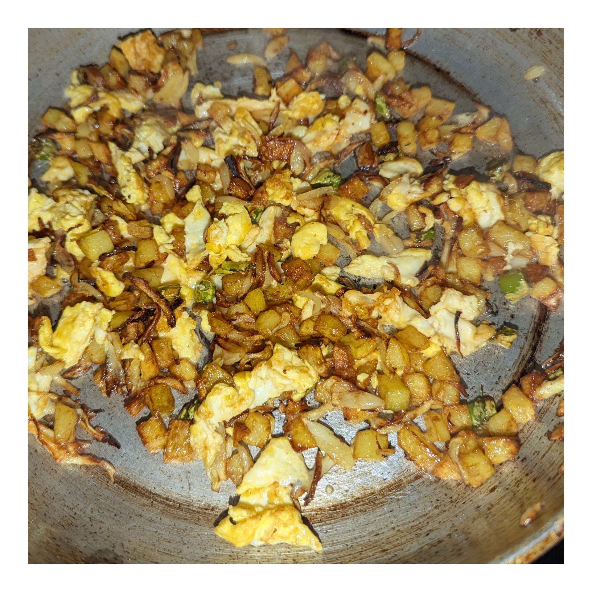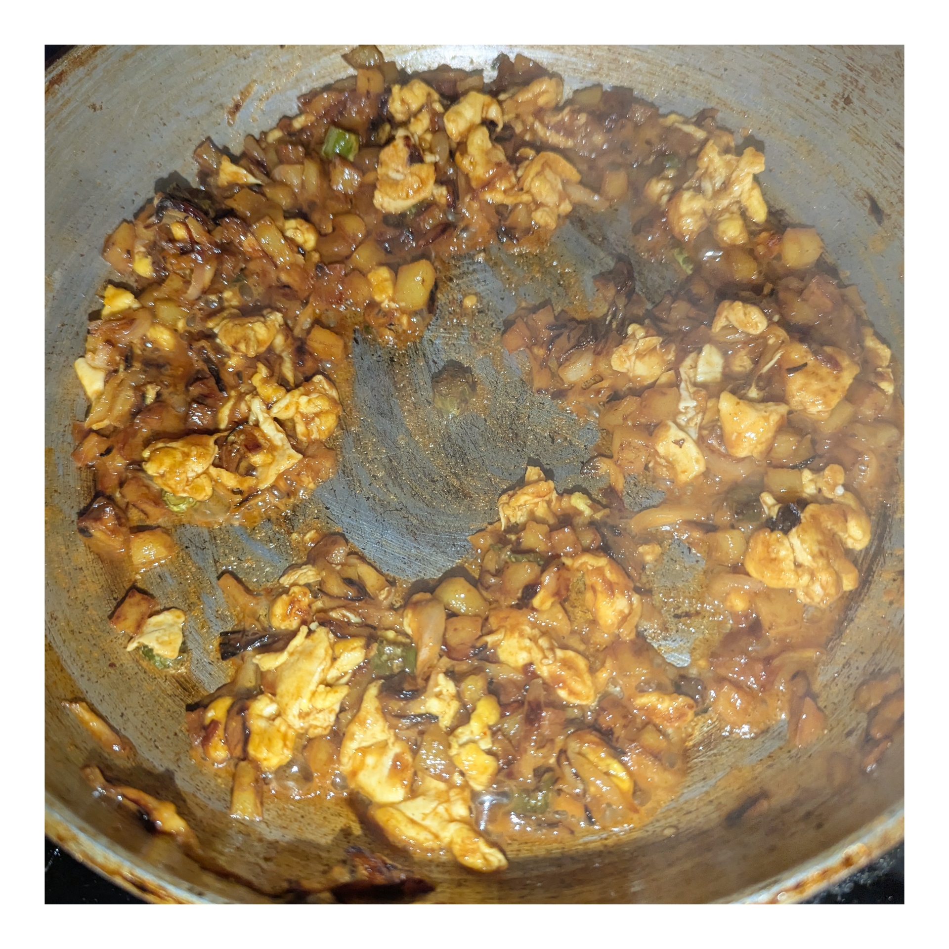 আলু এবং পেঁয়াজগুলো ভাজা হয়ে গেলে কড়াই এর একপাশে ডিম ভেজে নিয়েছি। তারপরে ডিম এবং আলু পেয়াজ ভাজি মিশিয়ে নিয়েছি।