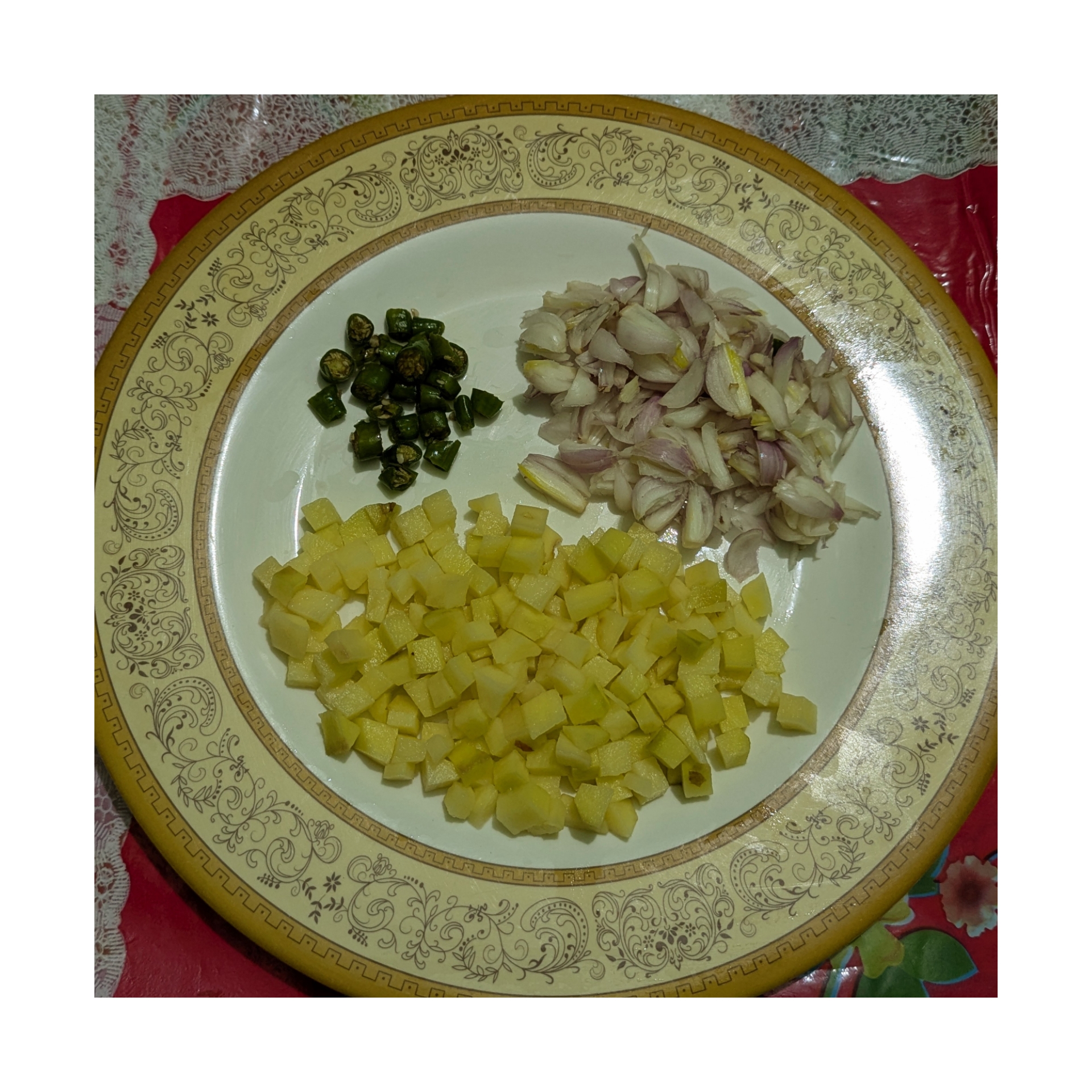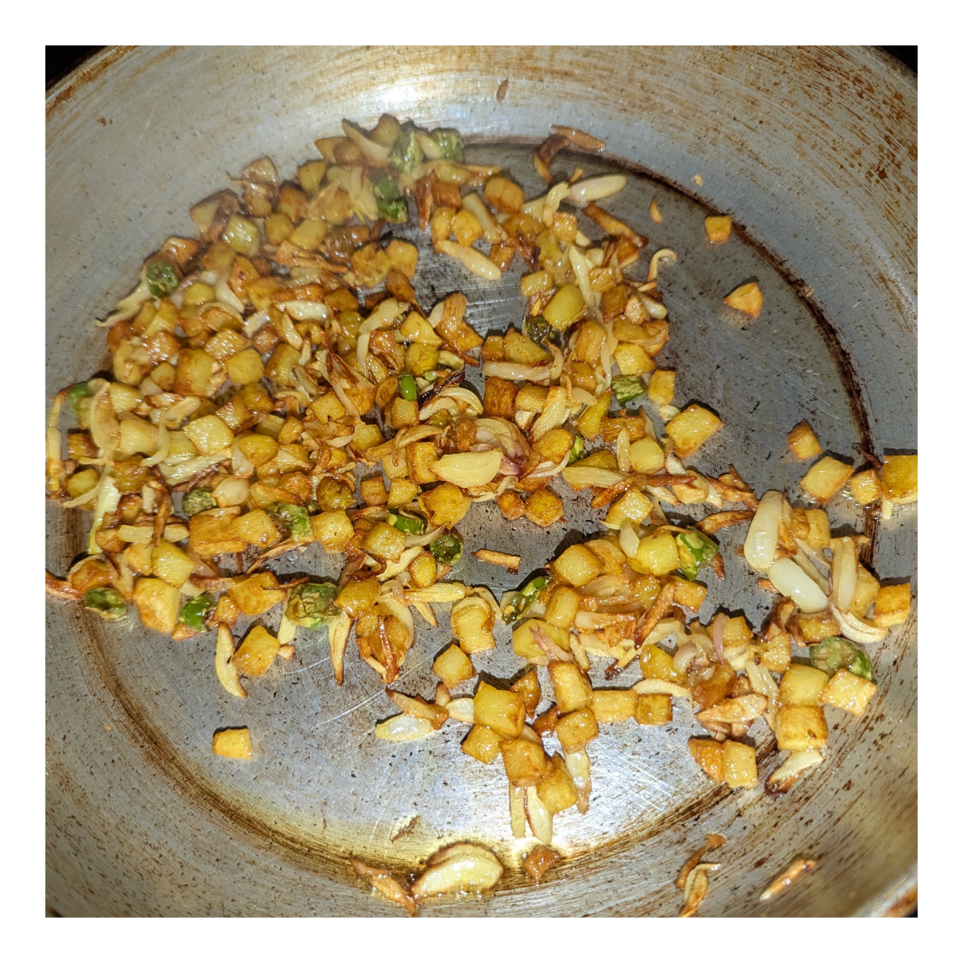 আলুগুলো ভাজা হয়ে গেলে এরমধ্যে মরিচ কুচি এবং পেঁয়াজ কুচি দিয়ে নিয়েছি। পেঁয়াজগুলো হালকা লাল লাল করে আলুর সঙ্গে ভেজে নিয়েছি।