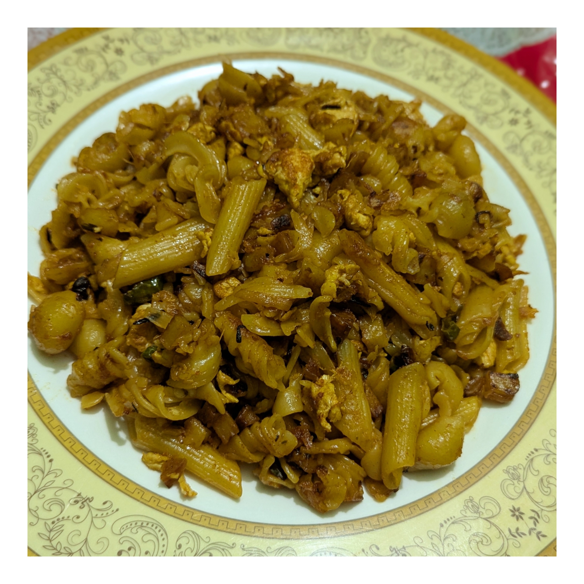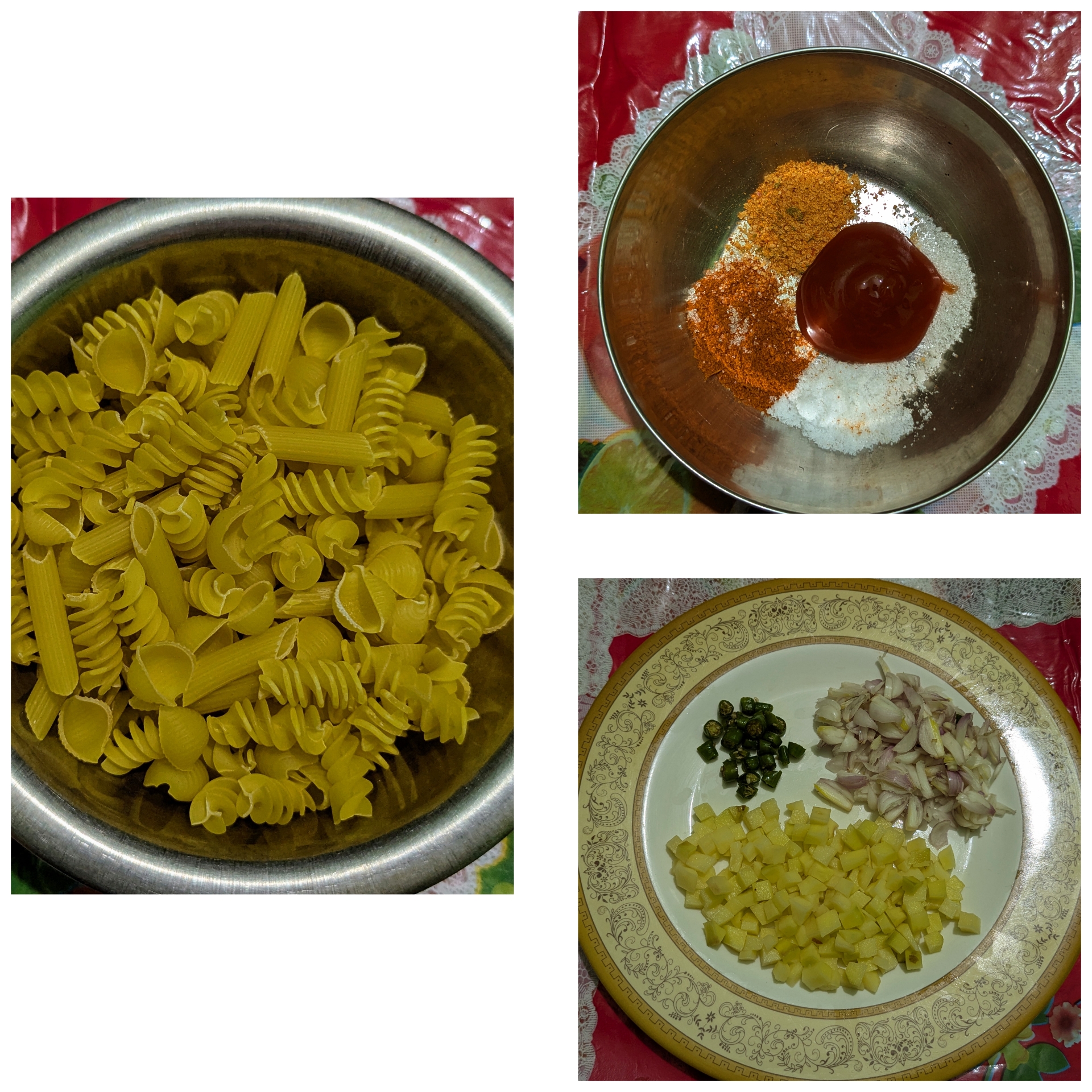 প্রথমে পরিমাণ মতো পাস্তাগুলোকে ফুটন্ত গরম জলে কিছু সময় সিদ্ধ করে নিয়েছি। লবণ, পাস্তা মসলা, চিনি, ঝালের গুড়া এবং টমেটোর সসেস একসাথে মিশিয়ে পরিমাণ মতো পানি দিয়ে একটি পেস্ট তৈরি করে নিয়েছি। পেঁয়াজ, মরিচ এবং আলু গুলোকে কেটে ধুয়ে পরিষ্কার করে নিয়েছি।