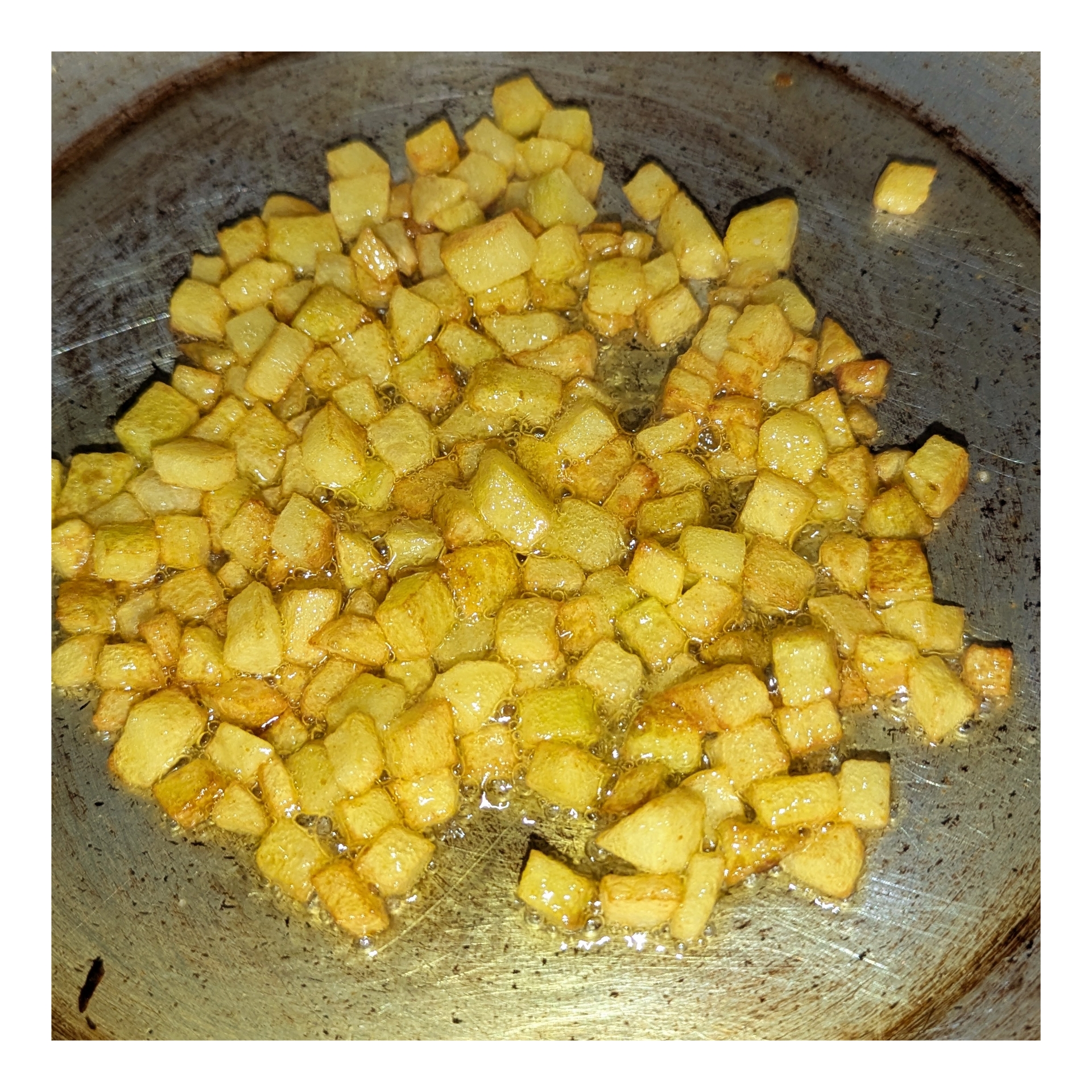 প্রথম ধাপে চুলা জ্বালিয়ে দিয়ে কড়াই বসিয়ে নিয়েছি। তারপর পরিমাণ মতো তেল দিয়ে গরম করে নিয়েছি। কেটে রাখা আলুগুলোকে কড়াইয়ের মধ্যে দিয়ে ভেজে নিয়েছি।
