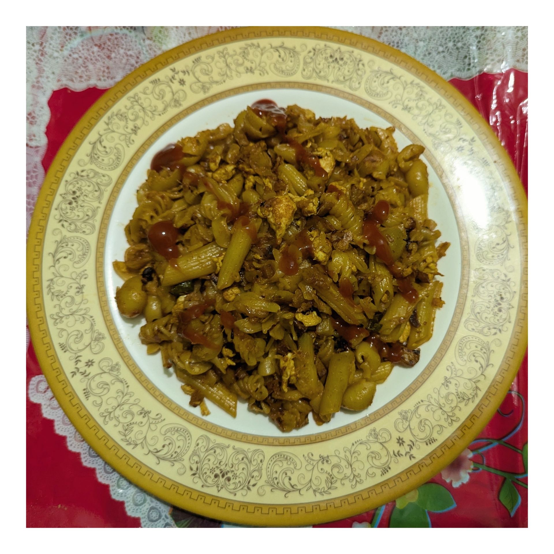 সর্বশেষে আমি একটি পাত্রে পাস্তা রান্না পরিবেশন করে নিয়েছি। এ পর্যায়ে পাস্তার উপরে সামান্য পরিমাণ টমেটো সস দিয়েছি। এই ছিলো আমার আজকের রান্না।
