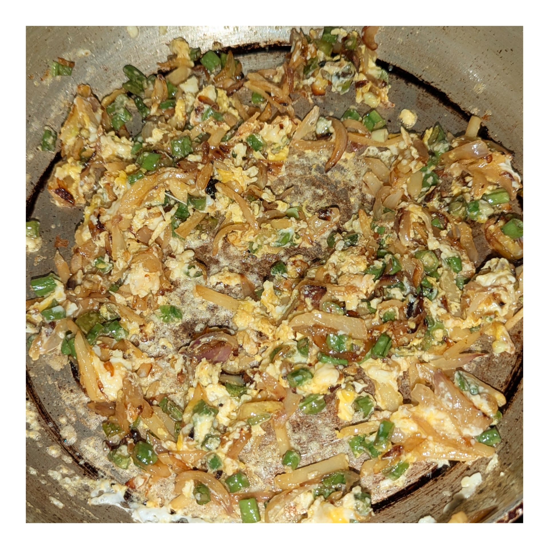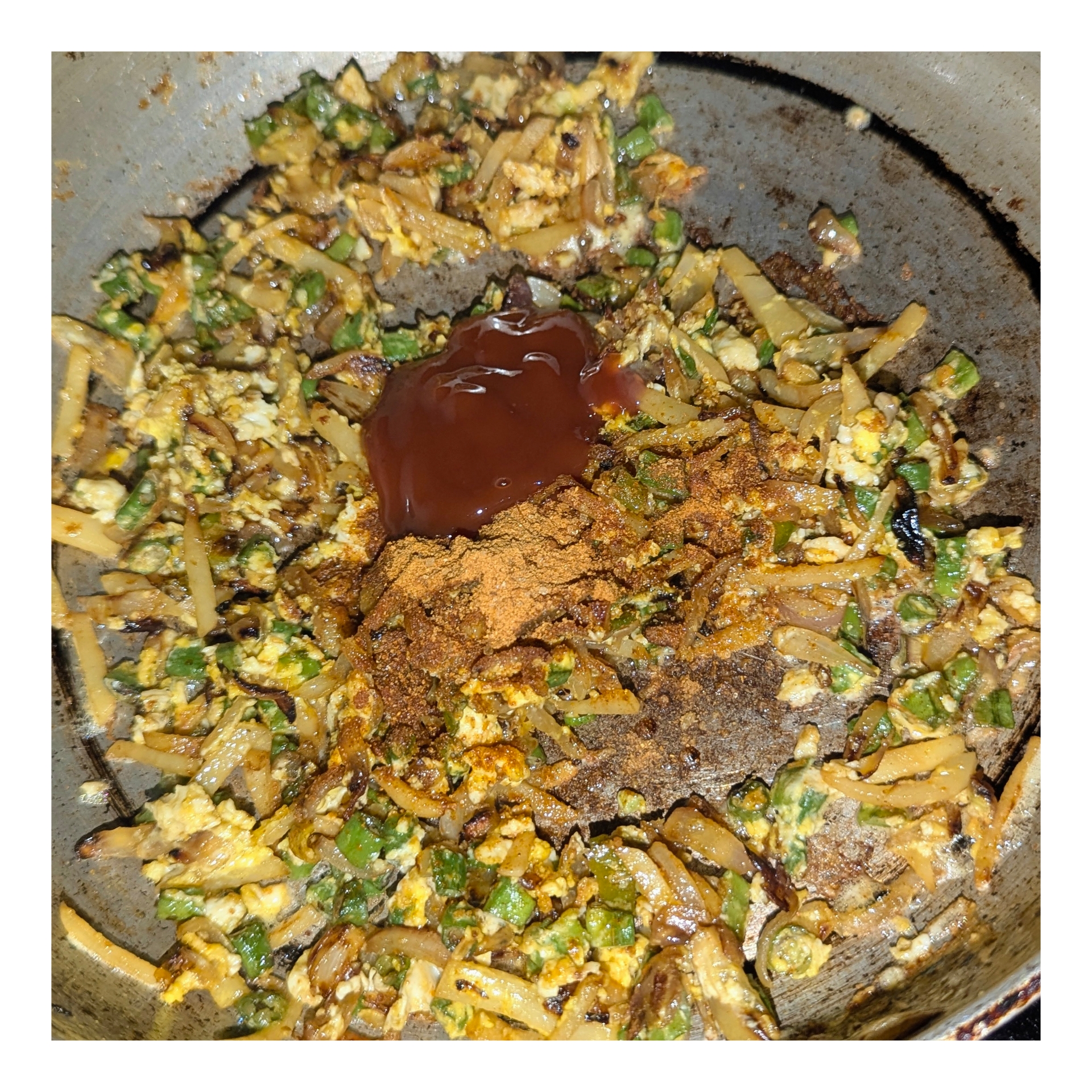 এক চিমটি লবণ দিয়ে আলু বরবটি ভাজা হয়ে গেলে এর মধ্যে একটি ডিম ভেঙ্গে দিয়ে ভেজে নিয়েছি।