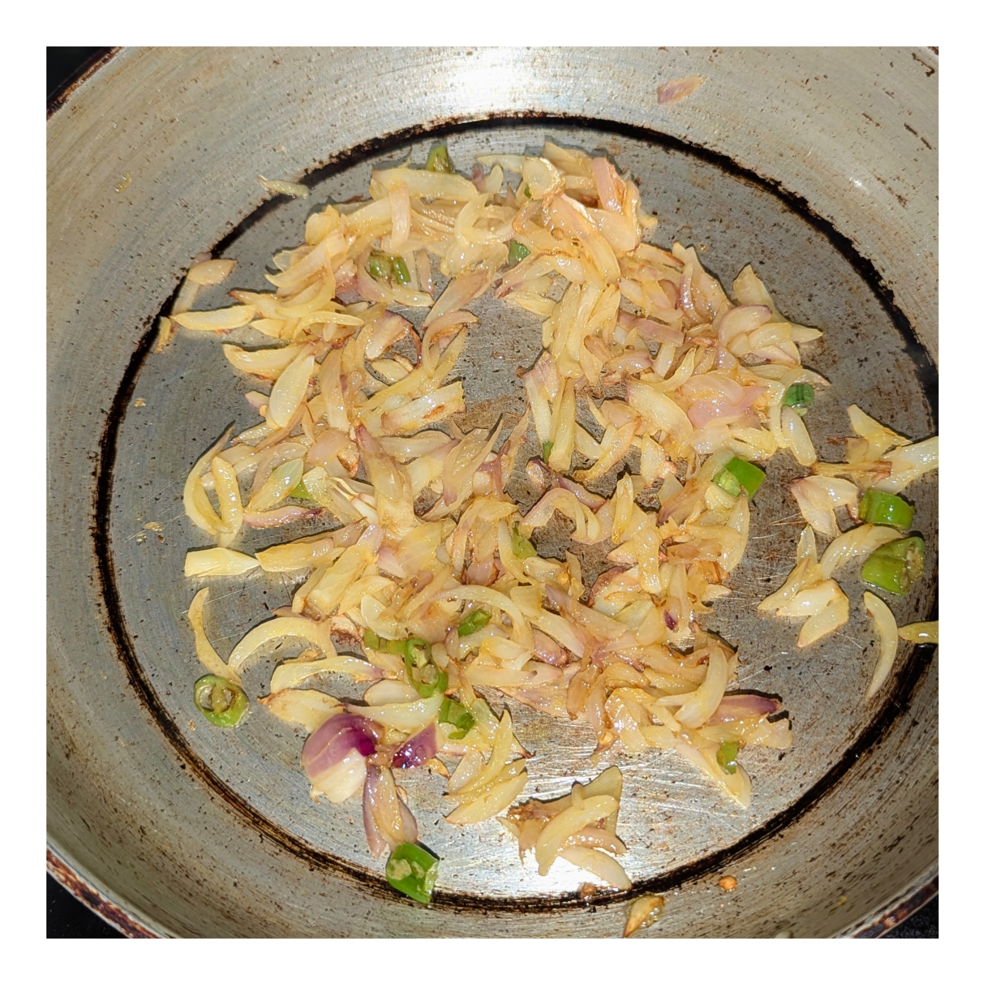 প্রথম ধাপে চুলায় কড়াই বসিয়ে তেল দিয়ে গরম করে নিয়েছি। প্রথমে পেঁয়াজএবং মরিচ তেলে ভেজে নিয়েছি।