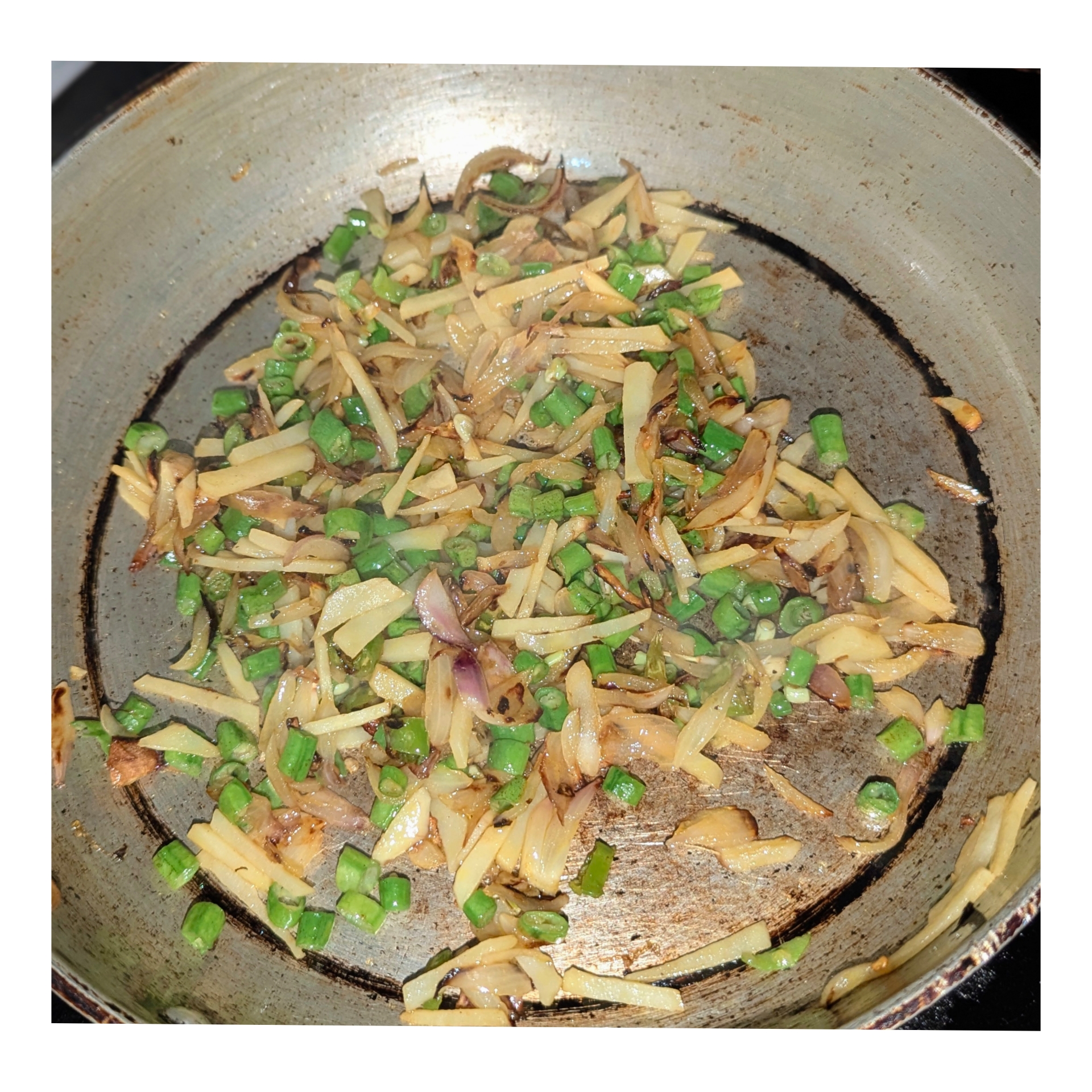 তারপর এর মধ্যে বরবটি এবং আলু দিয়ে নিয়েছি। তারপর কিছু সময় নিয়ে ভেজে নিয়ে।