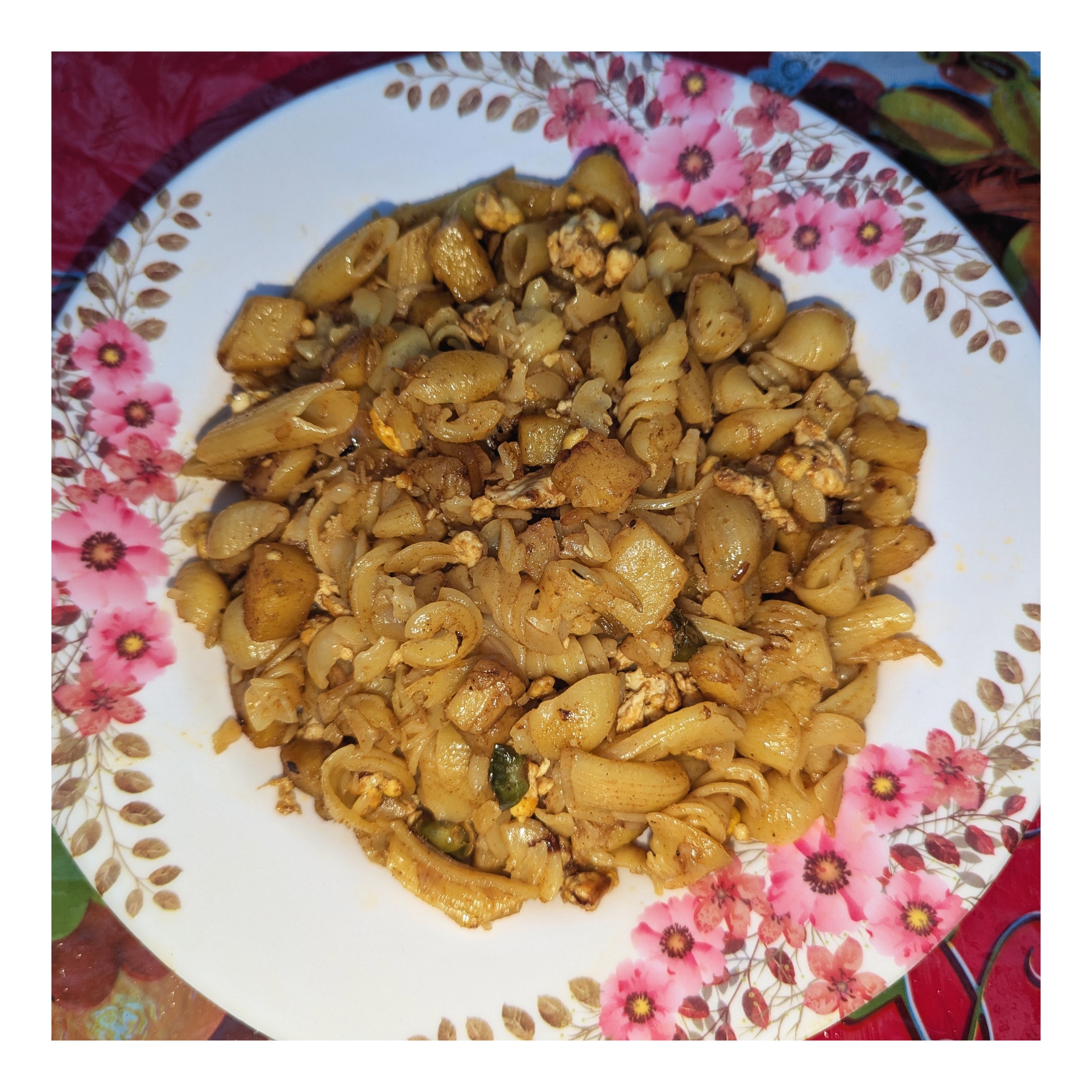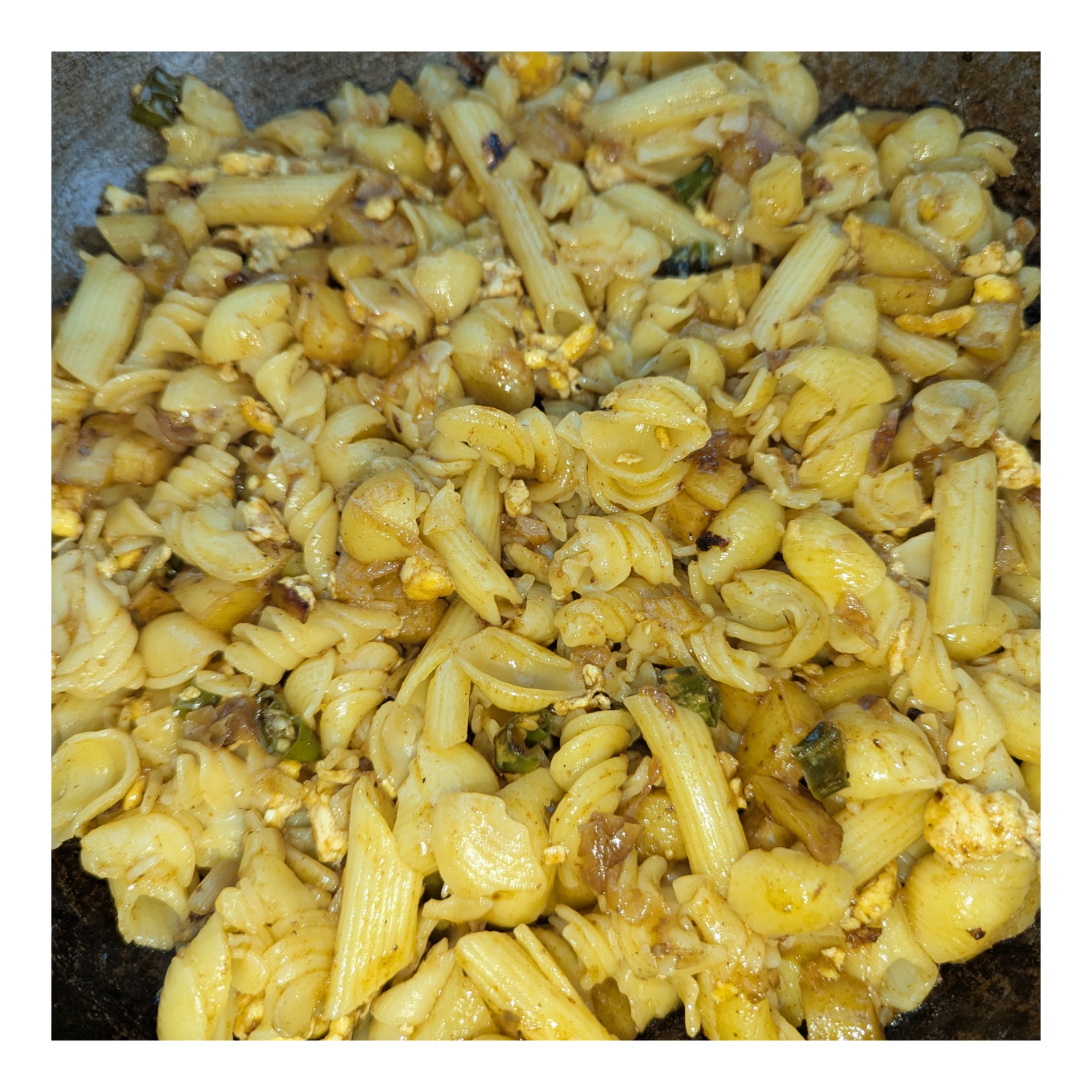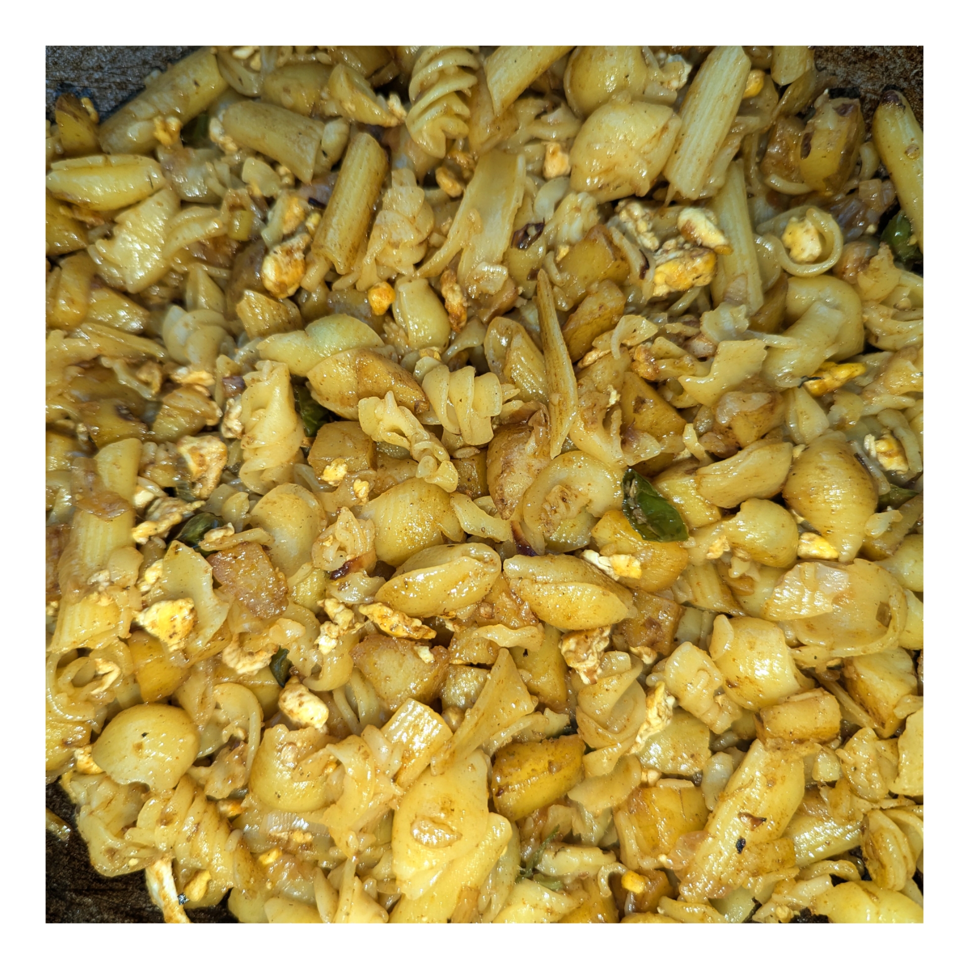 ডিমের টুকরো গুলো মসলা এবং আলুর সাথে ভালো করে মিশিয়ে নেওয়ার পর সিদ্ধ করে রাখা পাস্তা এর মধ্যে দিয়ে নিয়েছি।