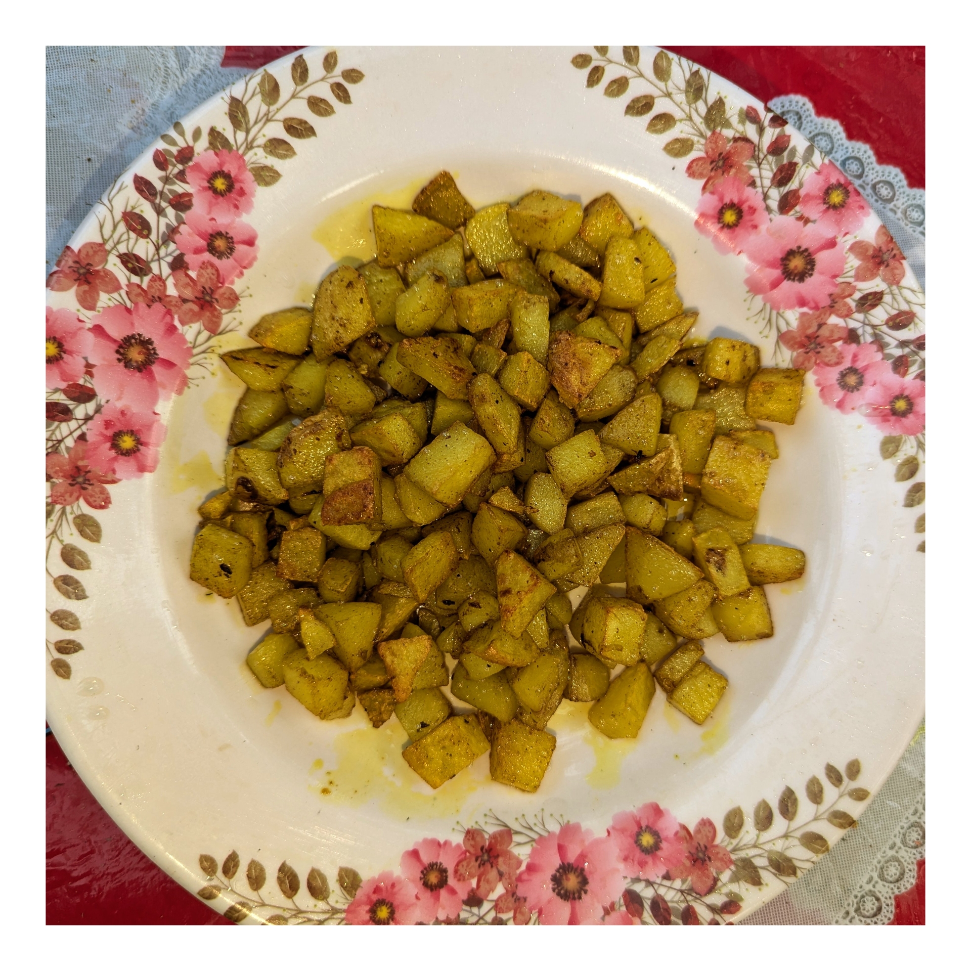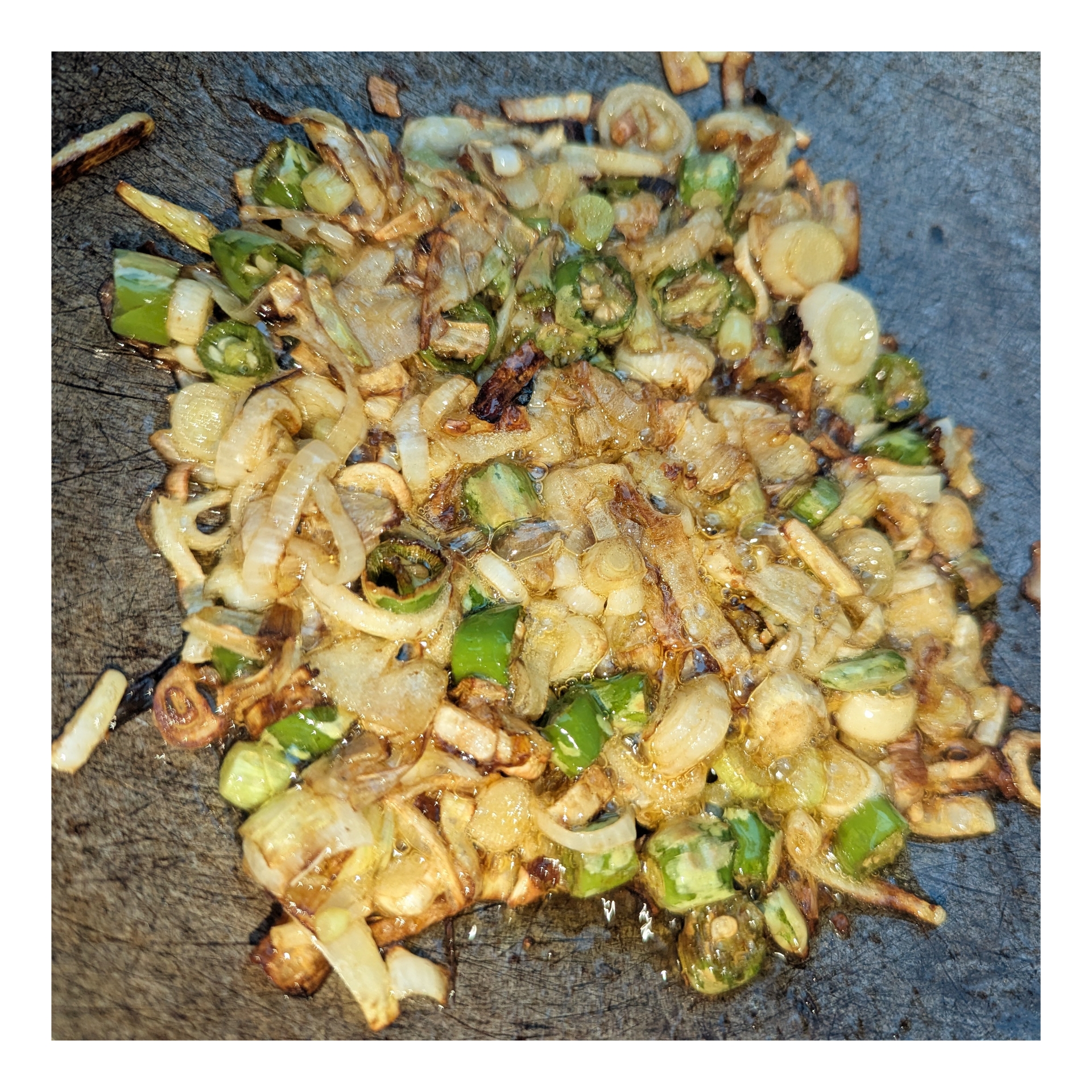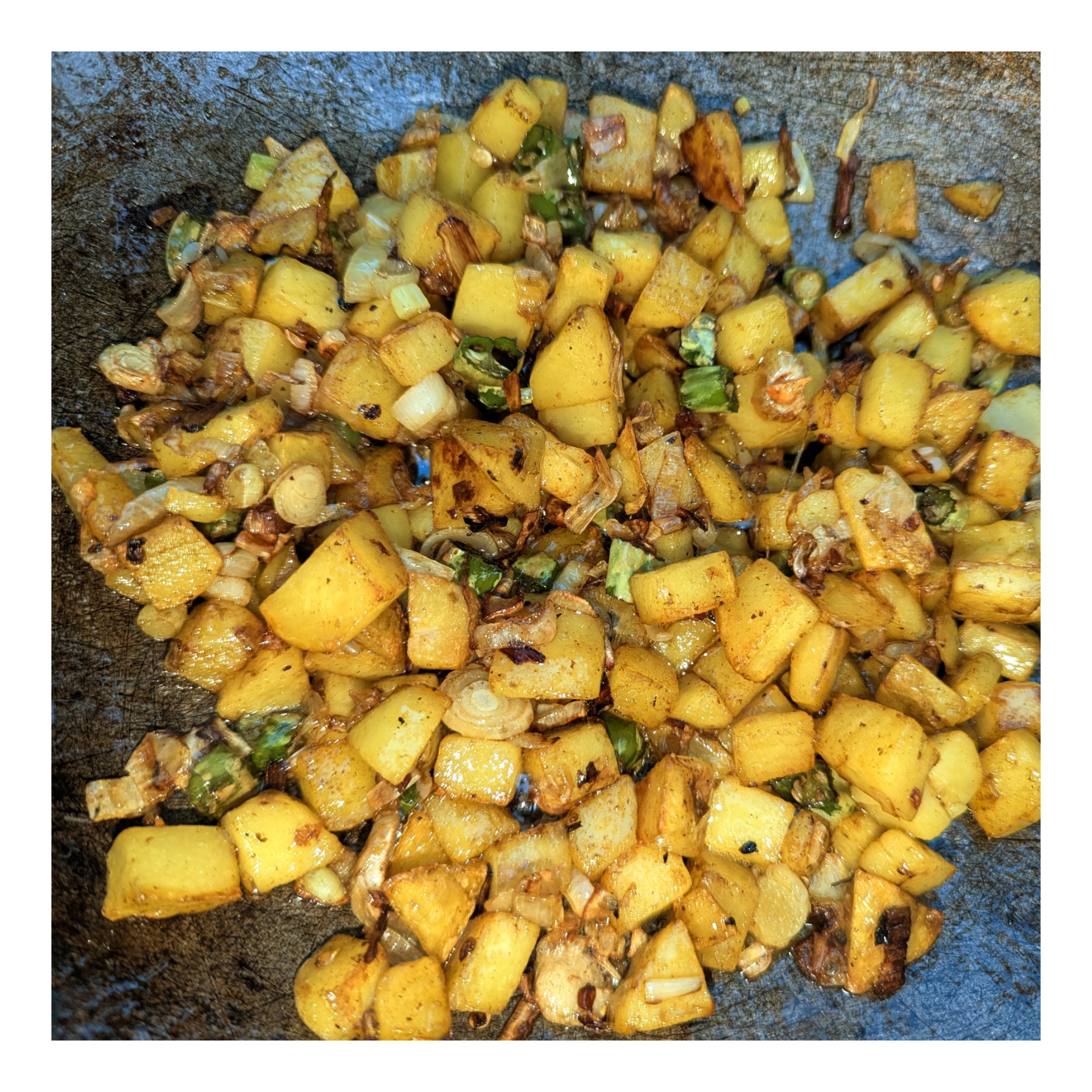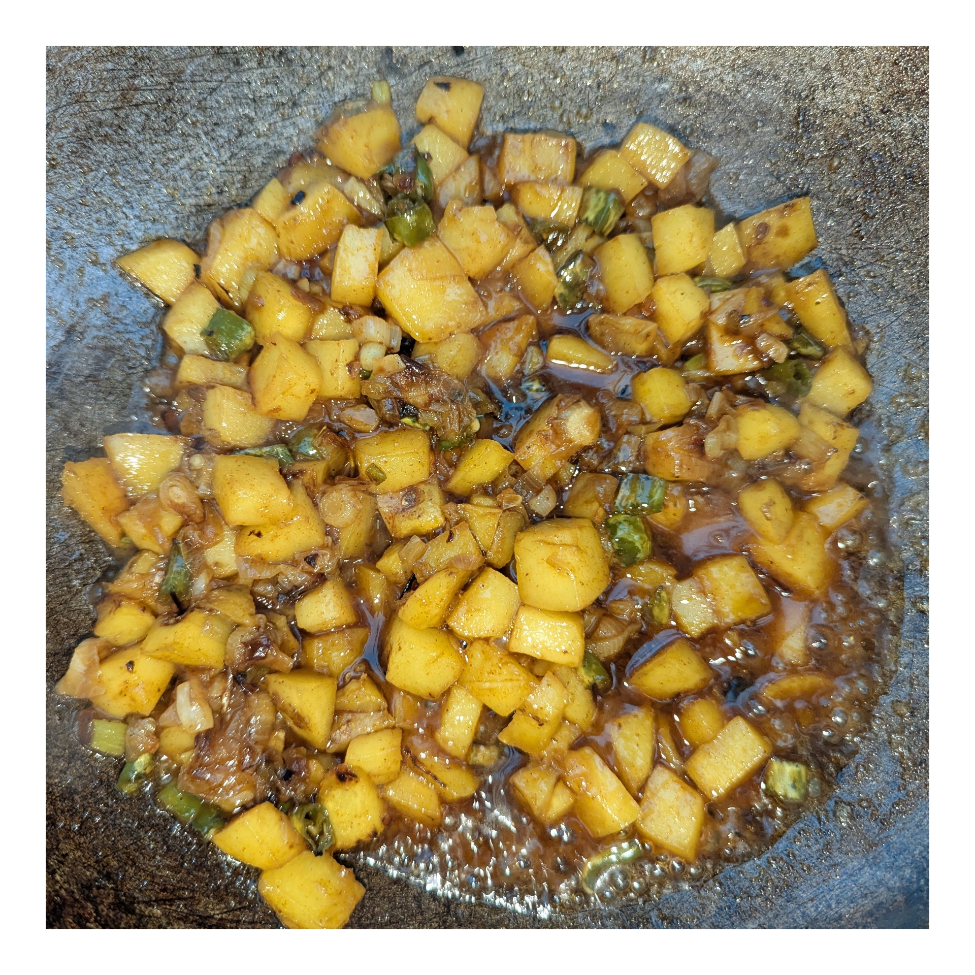 কড়াই সামান্য তেল দিয়ে পেঁয়াজ এবং মরিচ ভালো করে ভেজে নিয়েছি। তারপর এর মধ্যে ভেজে রাখা আলু গুলোকে দিয়ে নিয়েছি। তারপর ভালো করে সবকিছু একসাথে মিশিয়ে নিয়েছি।