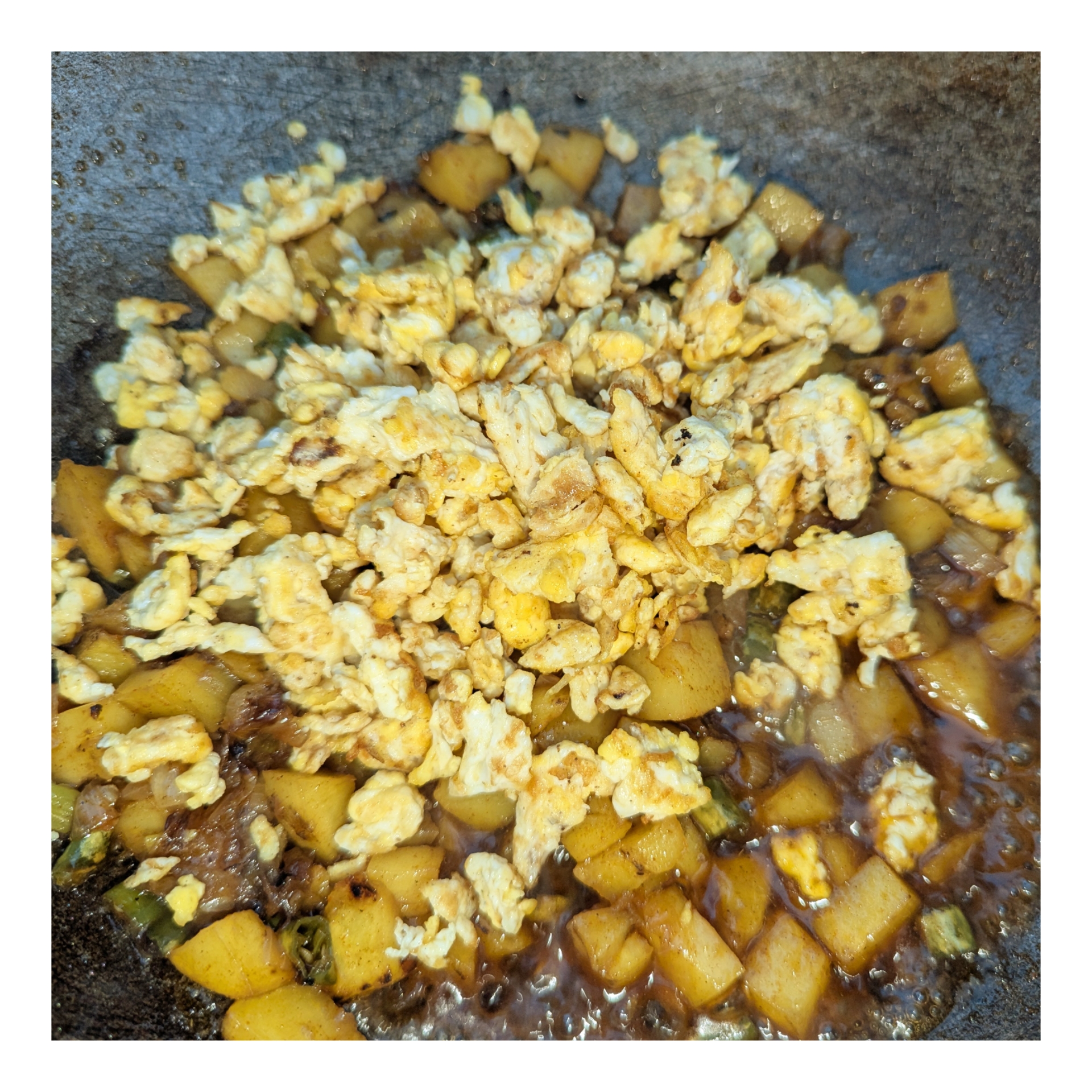 আলু গুলো ভালো করে মেশানো হয়ে গেলে তৈরি করে রাখা মসলার পেস্ট এর মধ্যে দিয়ে নিয়েছি। ভালোভাবে নেড়েচেড়ে বেশ কিছুক্ষণ জ্বাল করে জল শুকিয়ে নিয়েছি। তারপর এরমধ্যে ভেজে রাখা ডিমের টুকরোগুলো দিয়ে নিয়েছি।