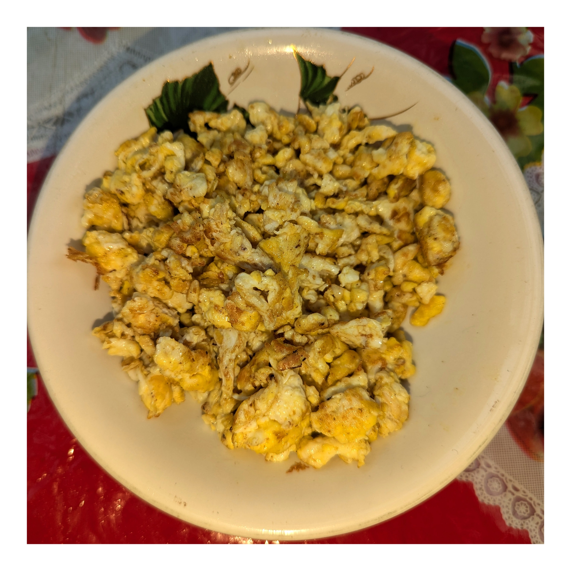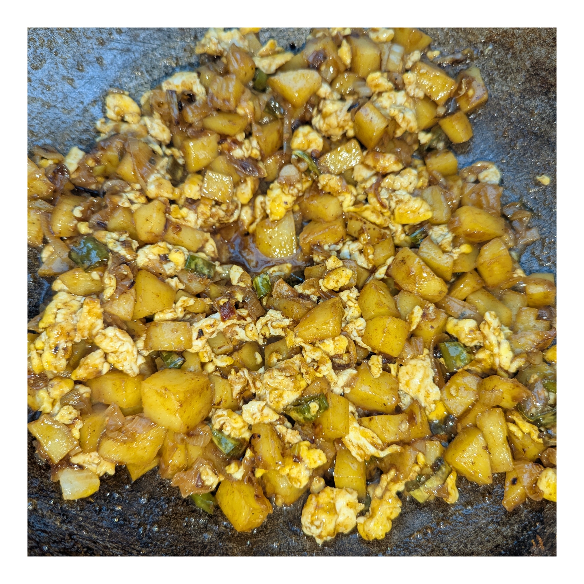 আলু ভেজে উঠিয়ে নেওয়ার পর দুইটি ডিম ফেটিয়ে সামান্য তেলে ভেজে উঠিয়ে নিয়েছি।