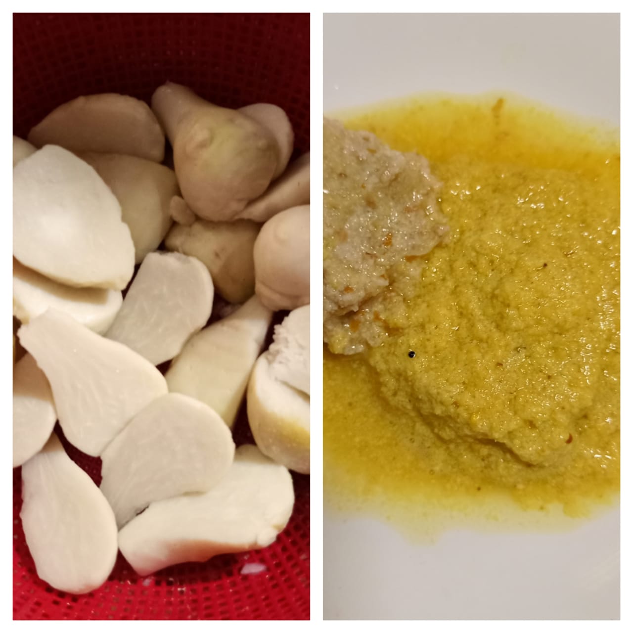 এখানে আমি বাদাম বাটা, সরিষা বাটা ও কচুর মুখী নিয়েছি। কচুর মুখী আমি আগে থেকে পরিস্কার করে কেটে নিয়ে সিদ্ধ করে নিয়েছি।