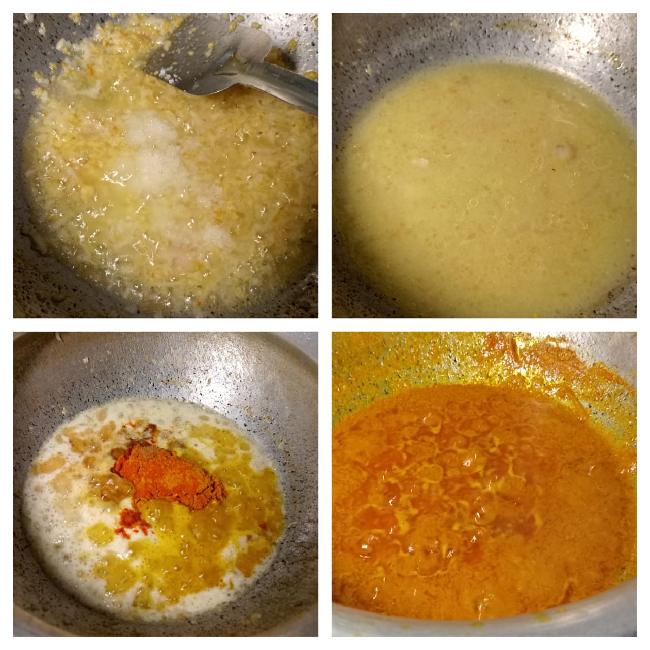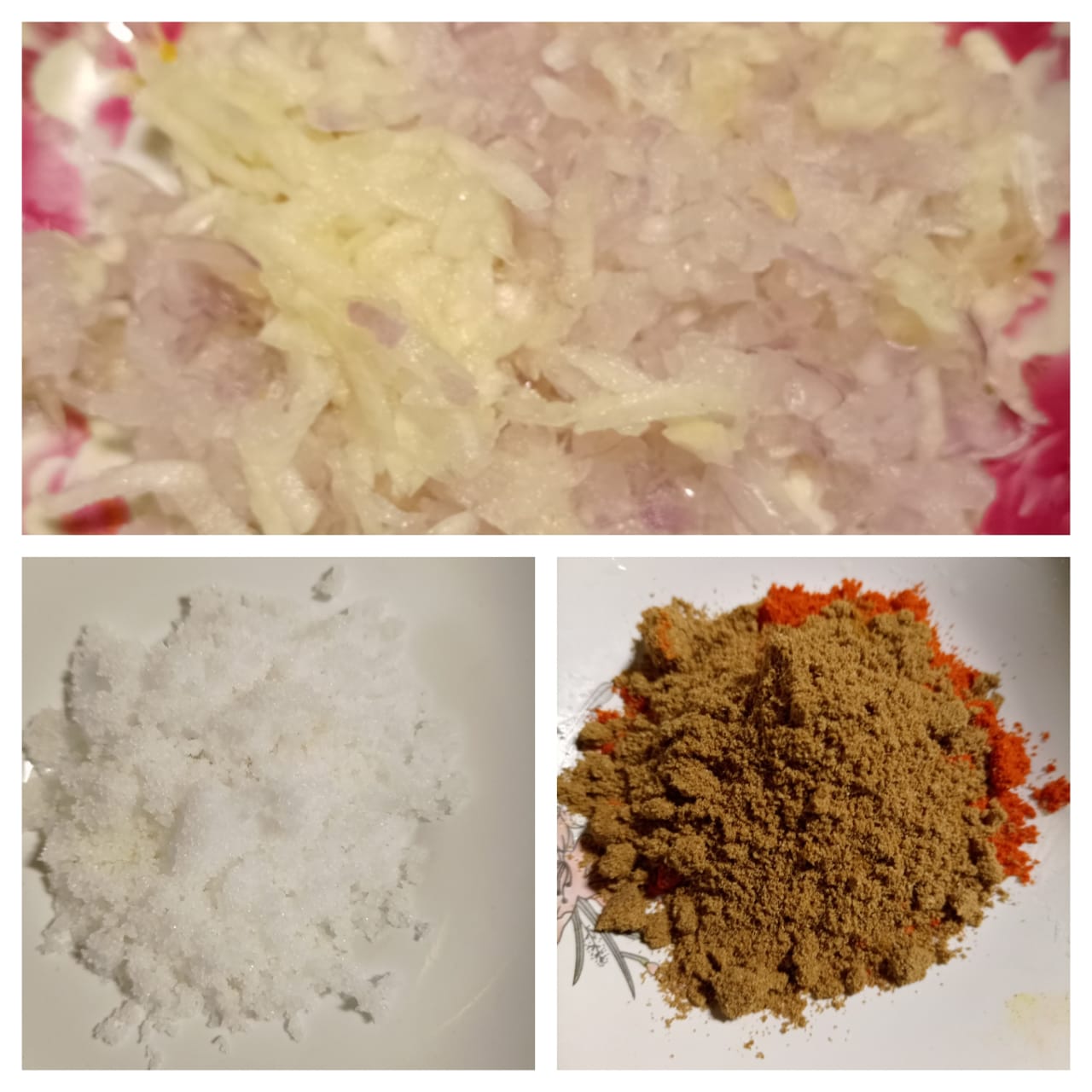 এই ধাপে আমি পেঁয়াজ, রসুন, লবণ, মরিচের গুড়া, হলুদের গুঁড়া, জিরা গুঁড়া, ধনিয়ার গুঁড়া নিয়েছি।