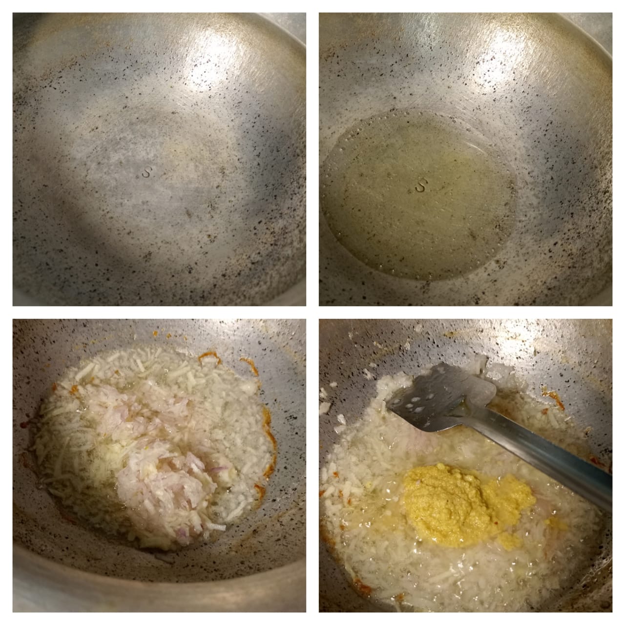 এই ধাপে আমি একটি রান্নার জন্য পাত্র নিয়েছি। পাত্রটি আমি চুলায় দিয়ে দিছি এবং তাপ মিডিয়াম আচে দিছি। পাত্রটি গরম হয়ে আসলে পরিমাণ মত তেল দিয়ে দিবো। তেল গরম হয়ে আসলে তাতে পেঁয়াজ ও রসুন দিয়ে দিবো।আমি পেঁয়াজ-রসুনের সাথে বাতাম বাটা ও সরিষা বাটা দিয়ে দিবো।