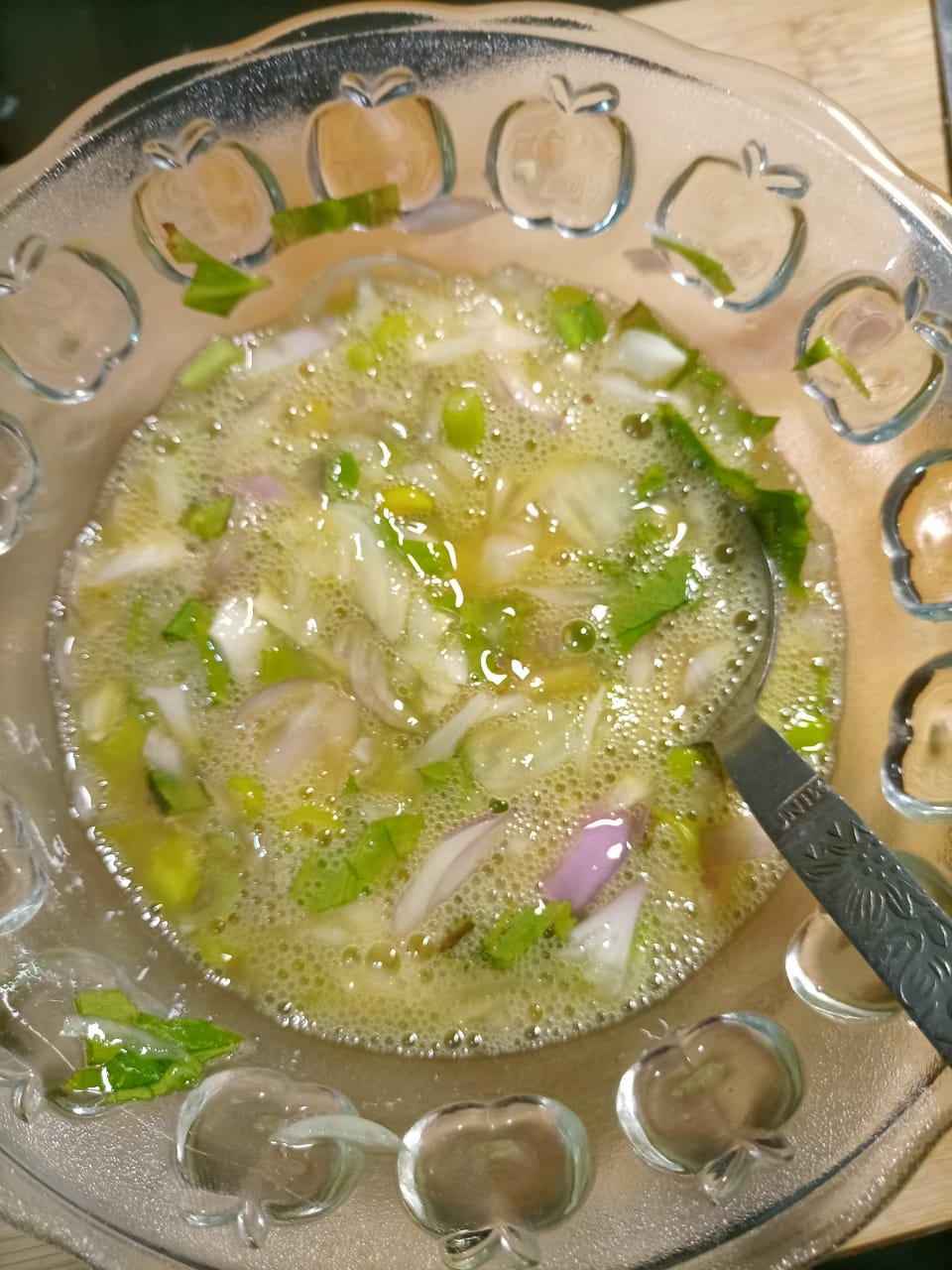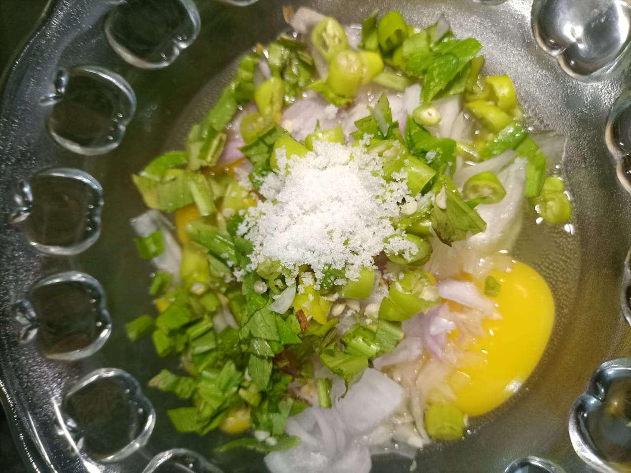 পেয়াজ, ধনে পাতা কুচি, মরিচ কুচি, লবণ একসাথে দিয়ে চামচের সাহায্যে বা হাতে ভাল করে মিক্স করে নিতে হবে।