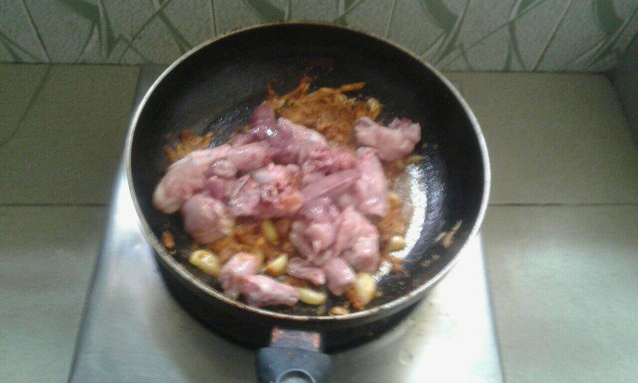 এবার মুরগির মাংস দিয়ে একটু নাড়াচাড়া করে ঢাকনা দিয়ে ঢেকে রান্না বসিয়ে দিলাম।যাতে মাংস ভালো ভাবে সিদ্ধ হয়।