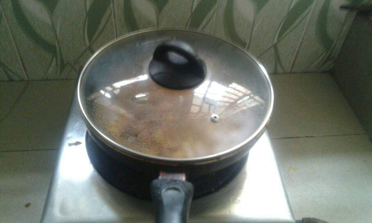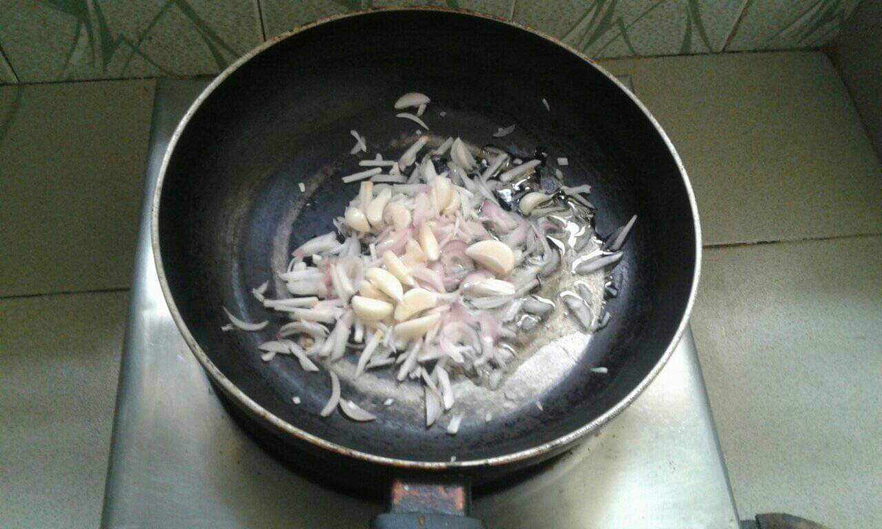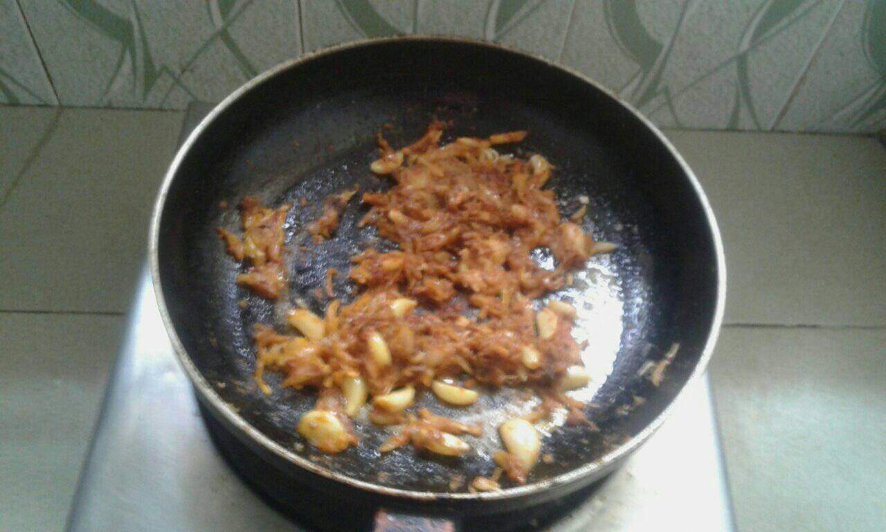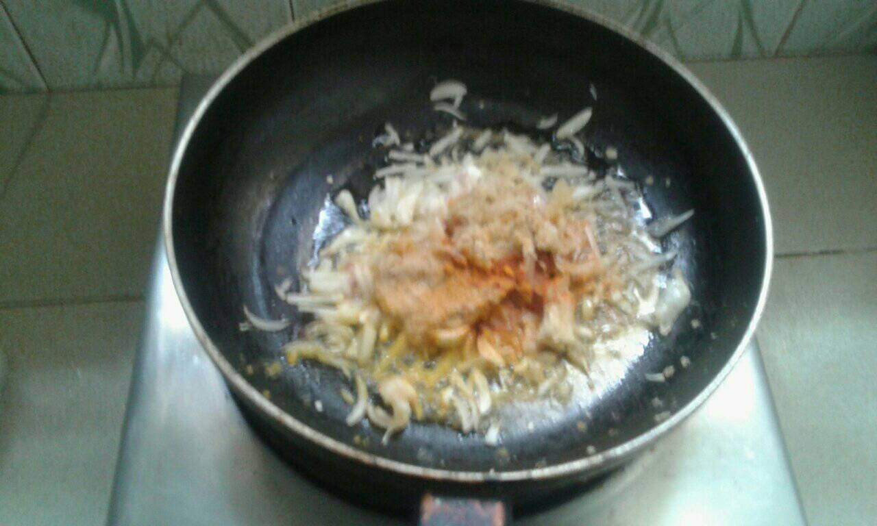 এবার ফ্রাইপেনে পেঁয়াজ কুঁচি,মরিচ, হলুদ গুঁড়ো,জিরা গুঁড়ো,লবণ,সাদা এলাচ,কালো এলাচ,আদা গুঁড়ো, রসুন এবং তৈল দিয়ে একটু কষিয়ে নিলাম।