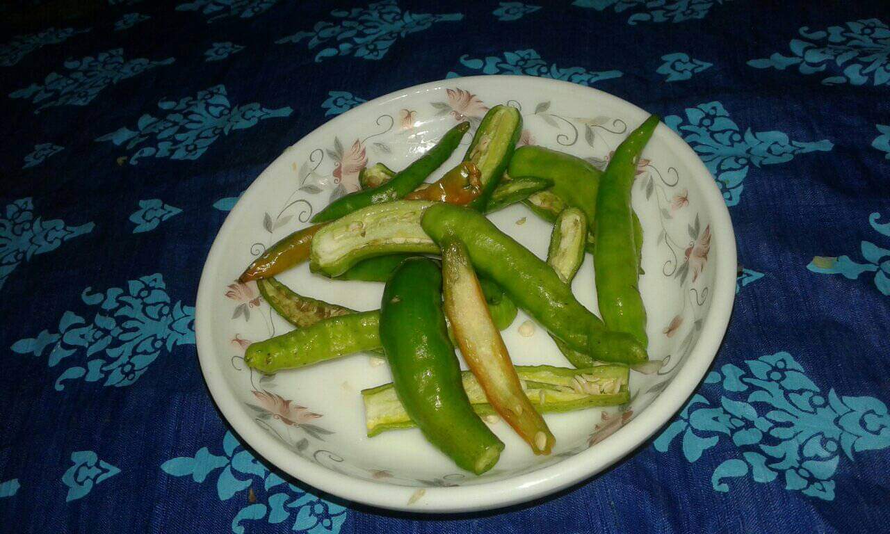 কাঁচামরিচ গুলো সুন্দর করে পানি দিয়ে পরিষ্কার করে নিয়ে মরিচগুলো মাঝ দিয়ে চিড়ে নিয়েছি।