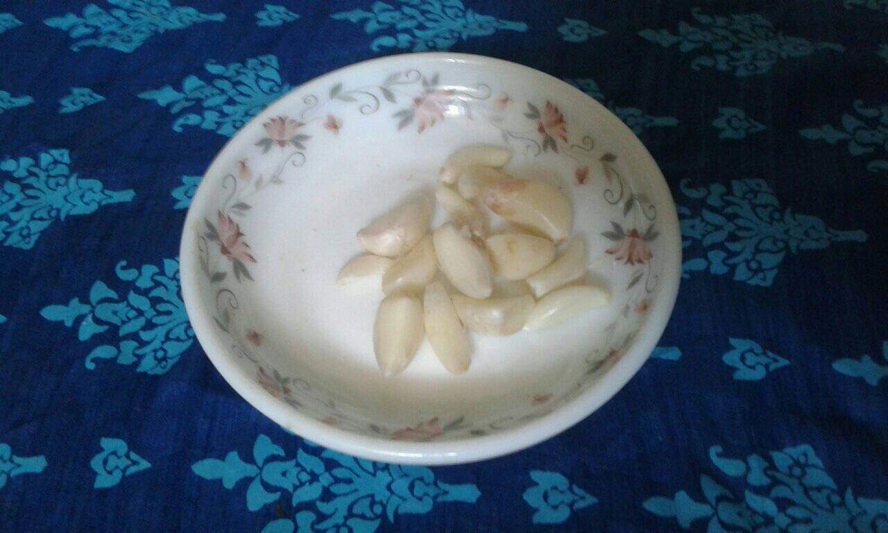রসুনের কোয়া খুলে প্রতিটি কোয়ার ছাল পরিষ্কার করে নিয়েছি রান্নার উপযোগী করে।