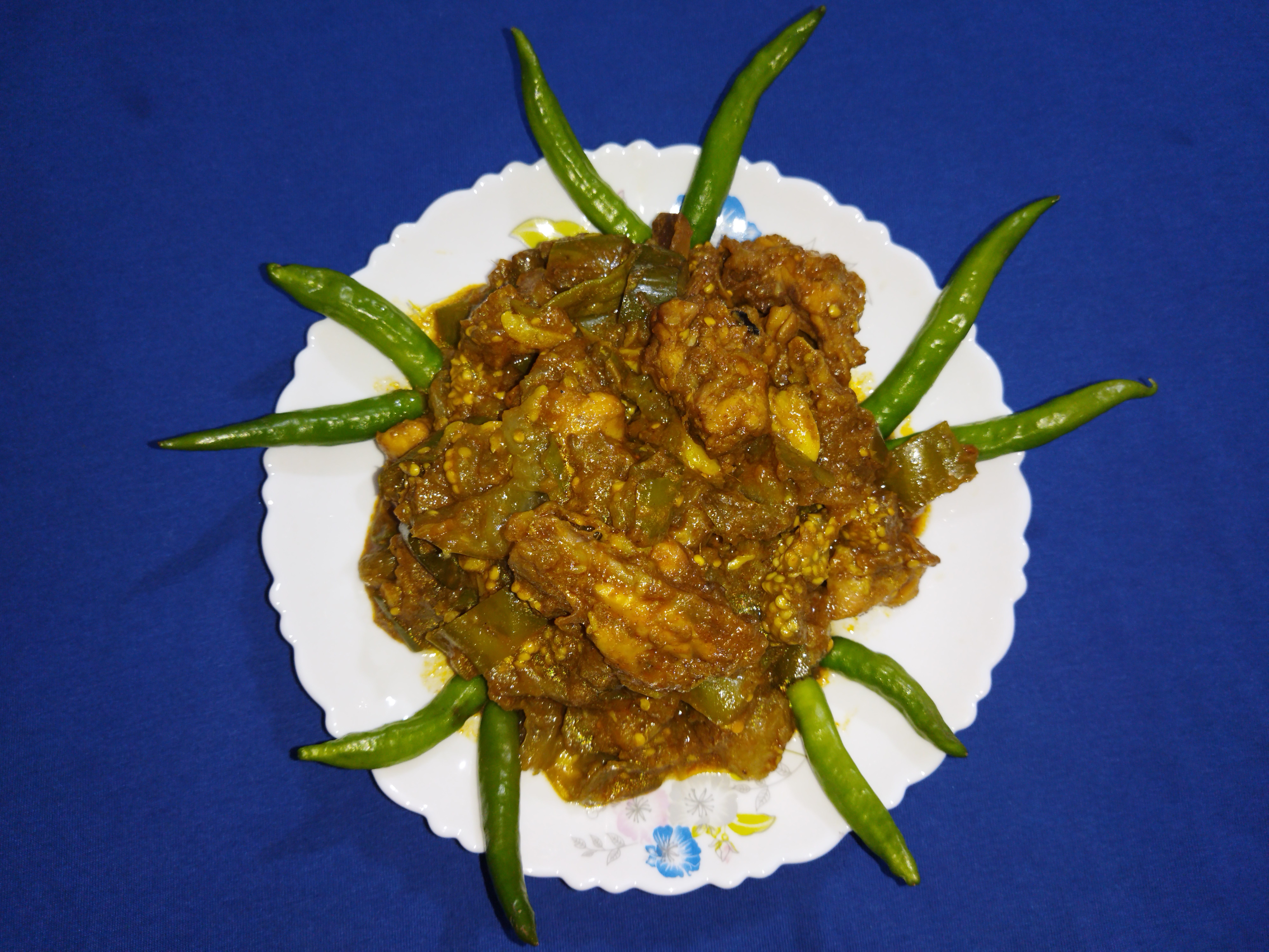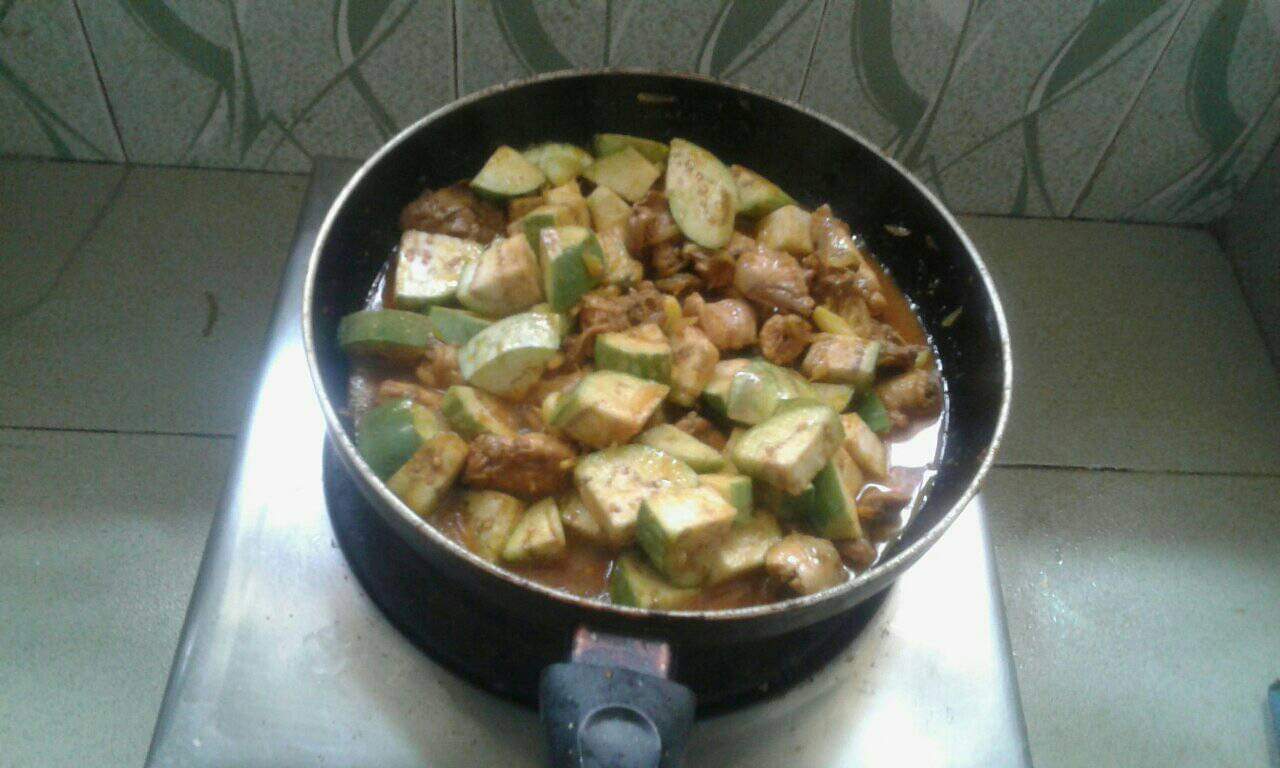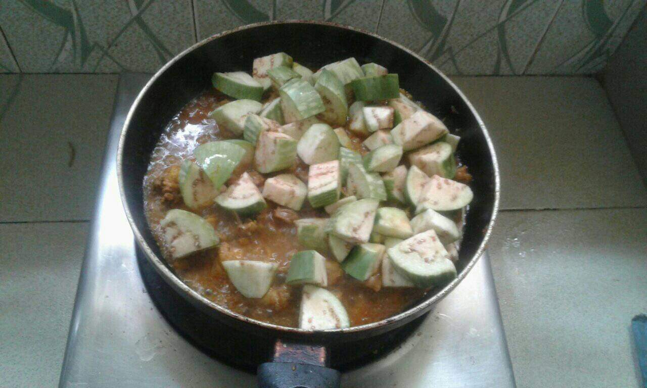 বেগুন ও মুরগির মাংস ভুনা।