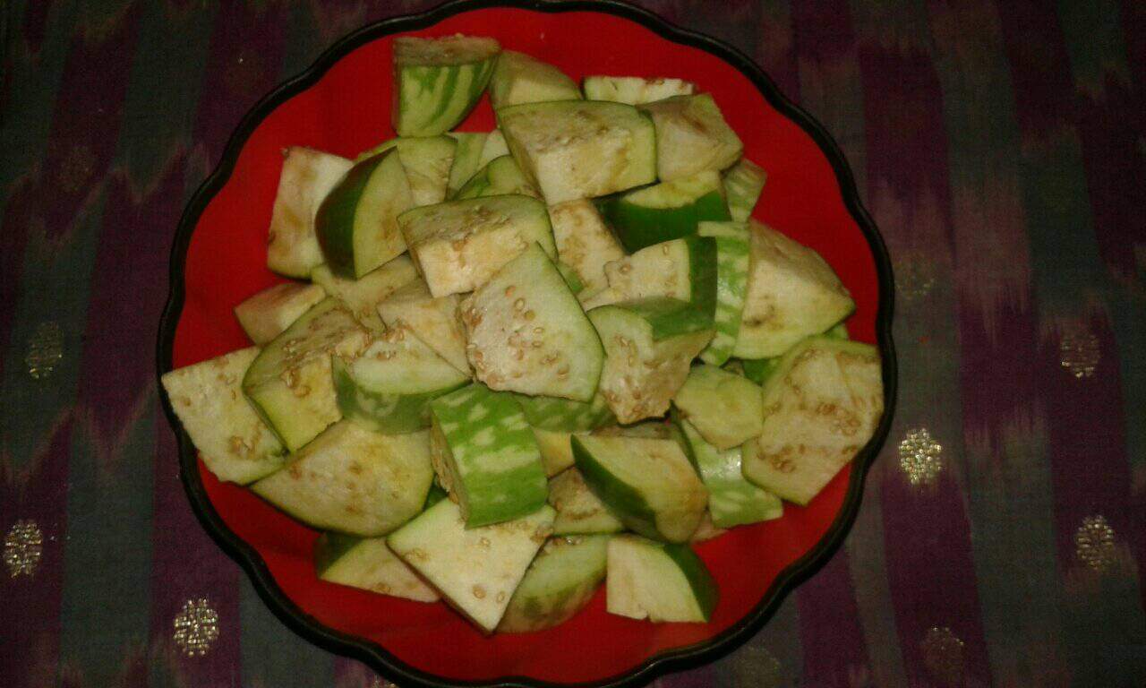বেগুনের বোটা ফেলে পানি দিয়ে পরিষ্কার করে নিয়ে বেগুন গুলো ছোট ছোট টুকরো করে নিয়েছি যাতে রান্নাটি সুন্দর ভাবে করা যায়।