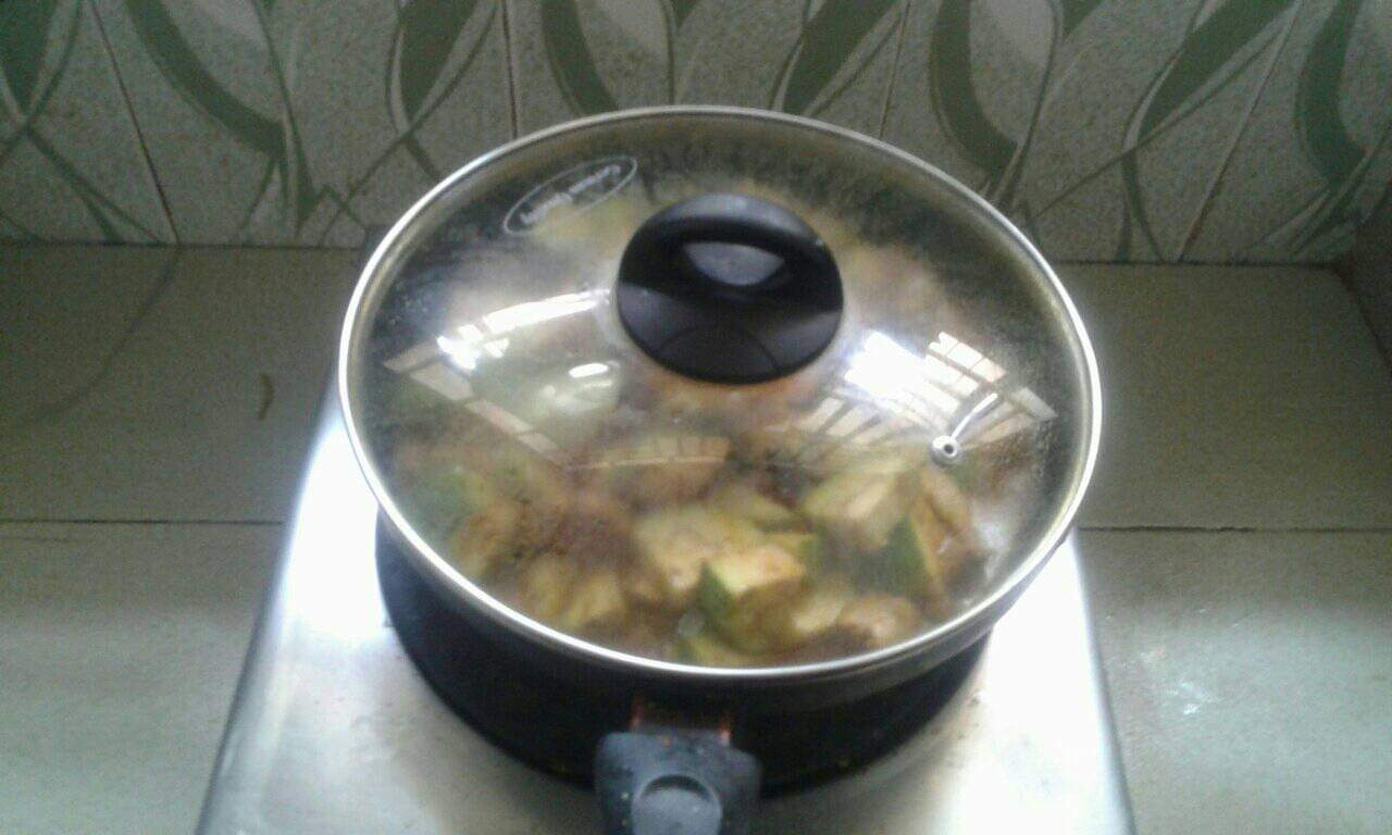 এইবার ঢাকনা খুলে বেগুনের টুকরো গুলো ফ্রাইপেনে দিয়ে একটু নাড়াচাড়া করে আবার ঢাকনা দিয়ে ঢেকে দিয়ে কিছুক্ষন রান্না বসিয়ে দিলাম।