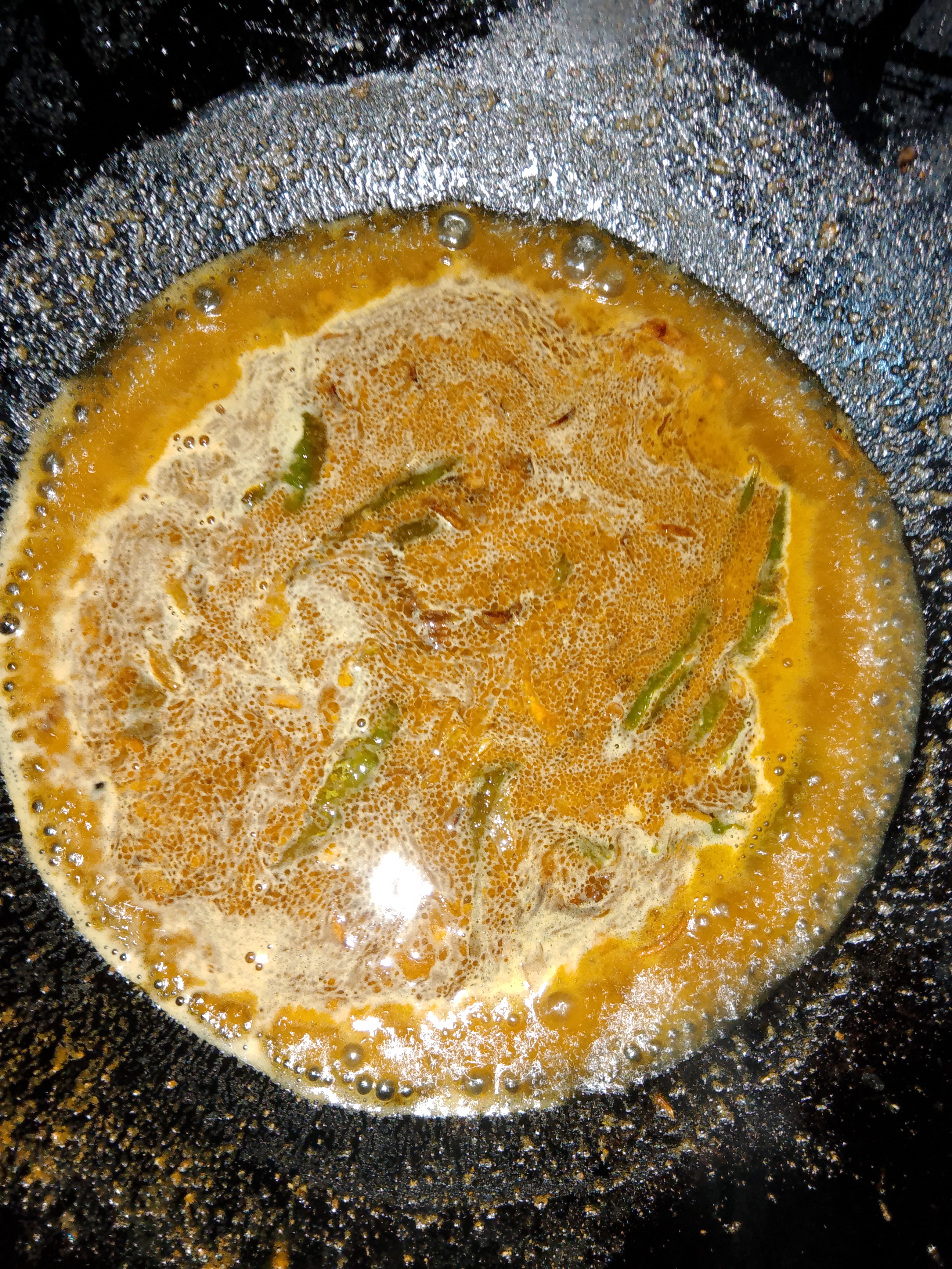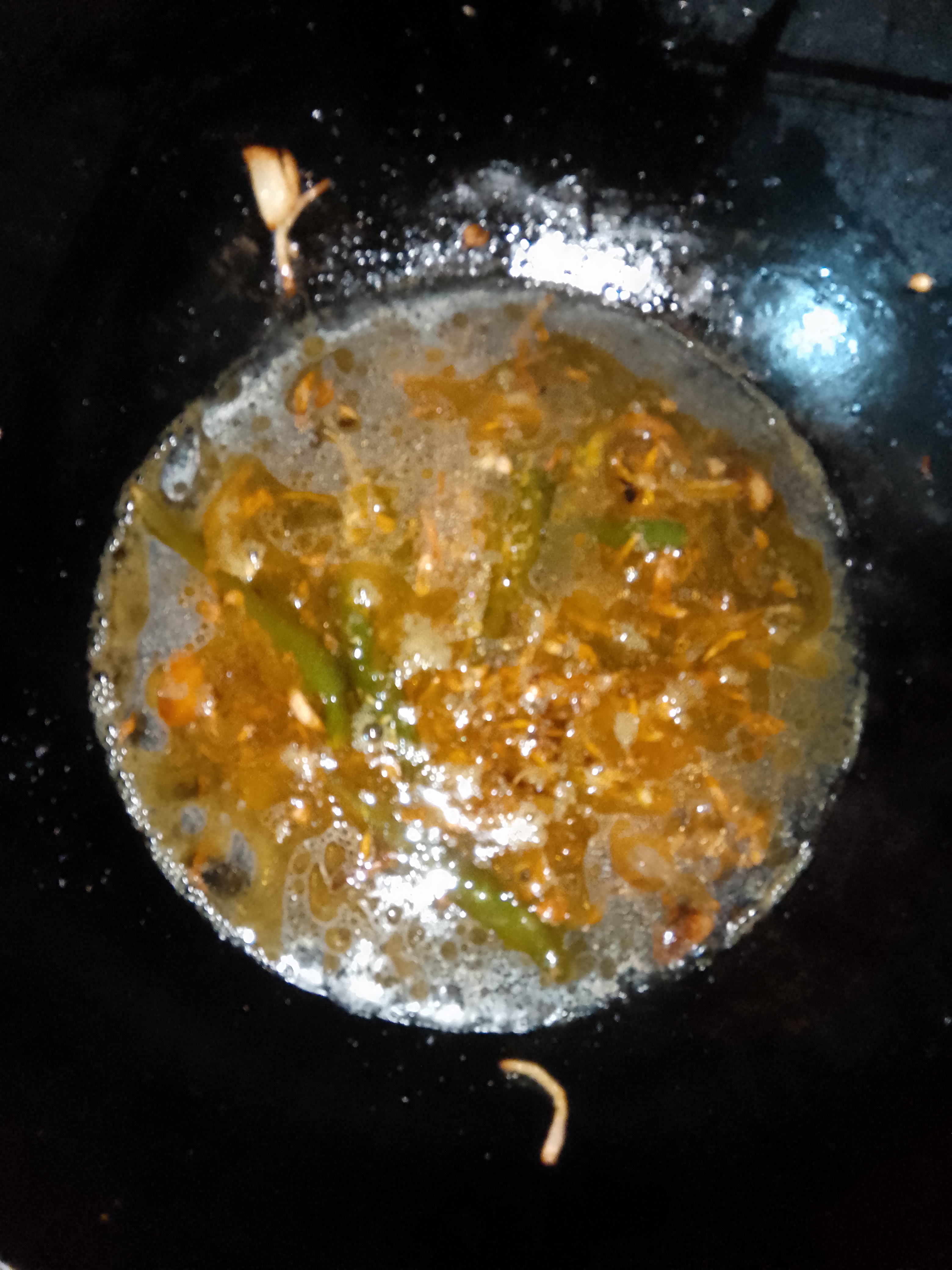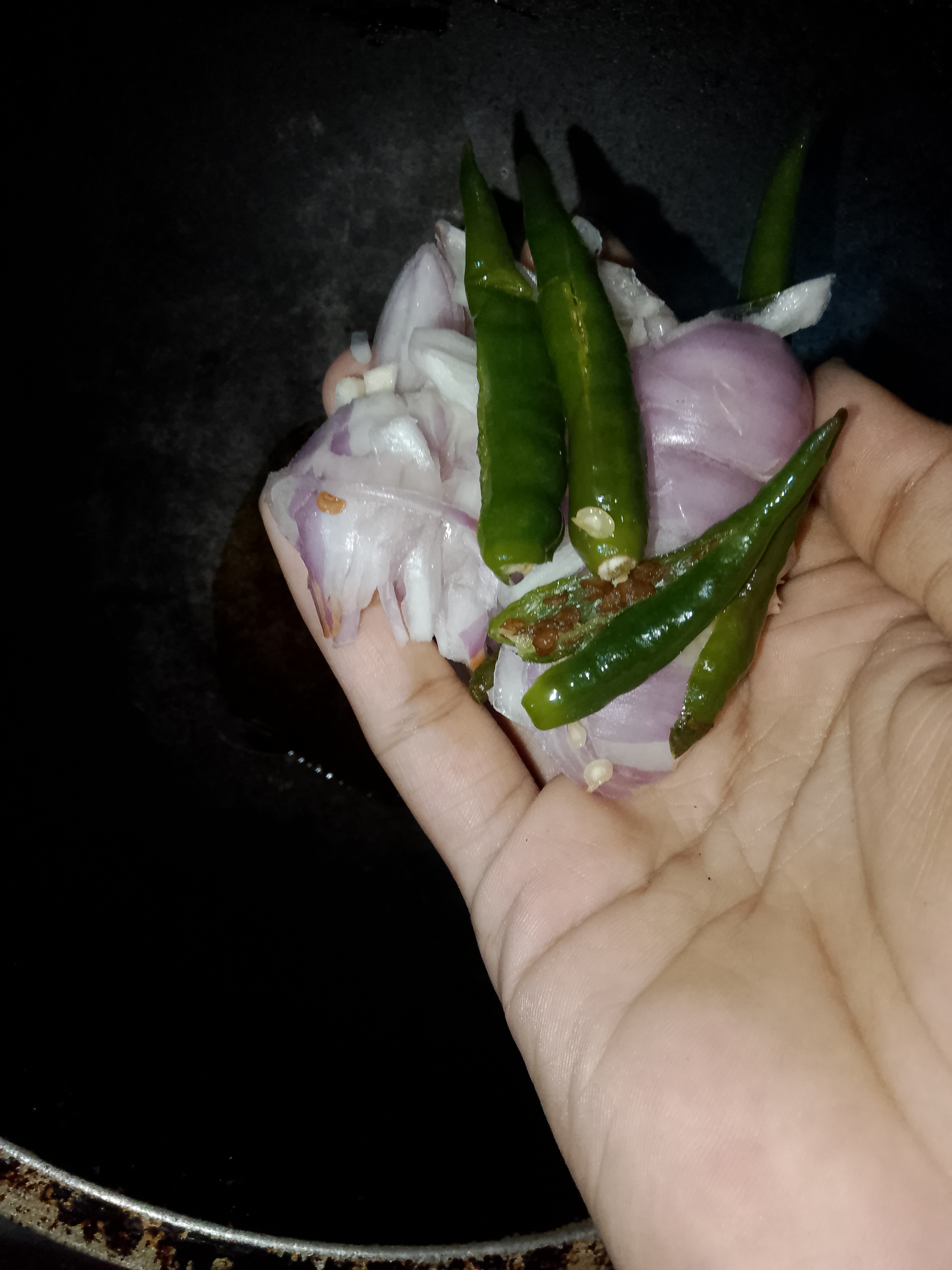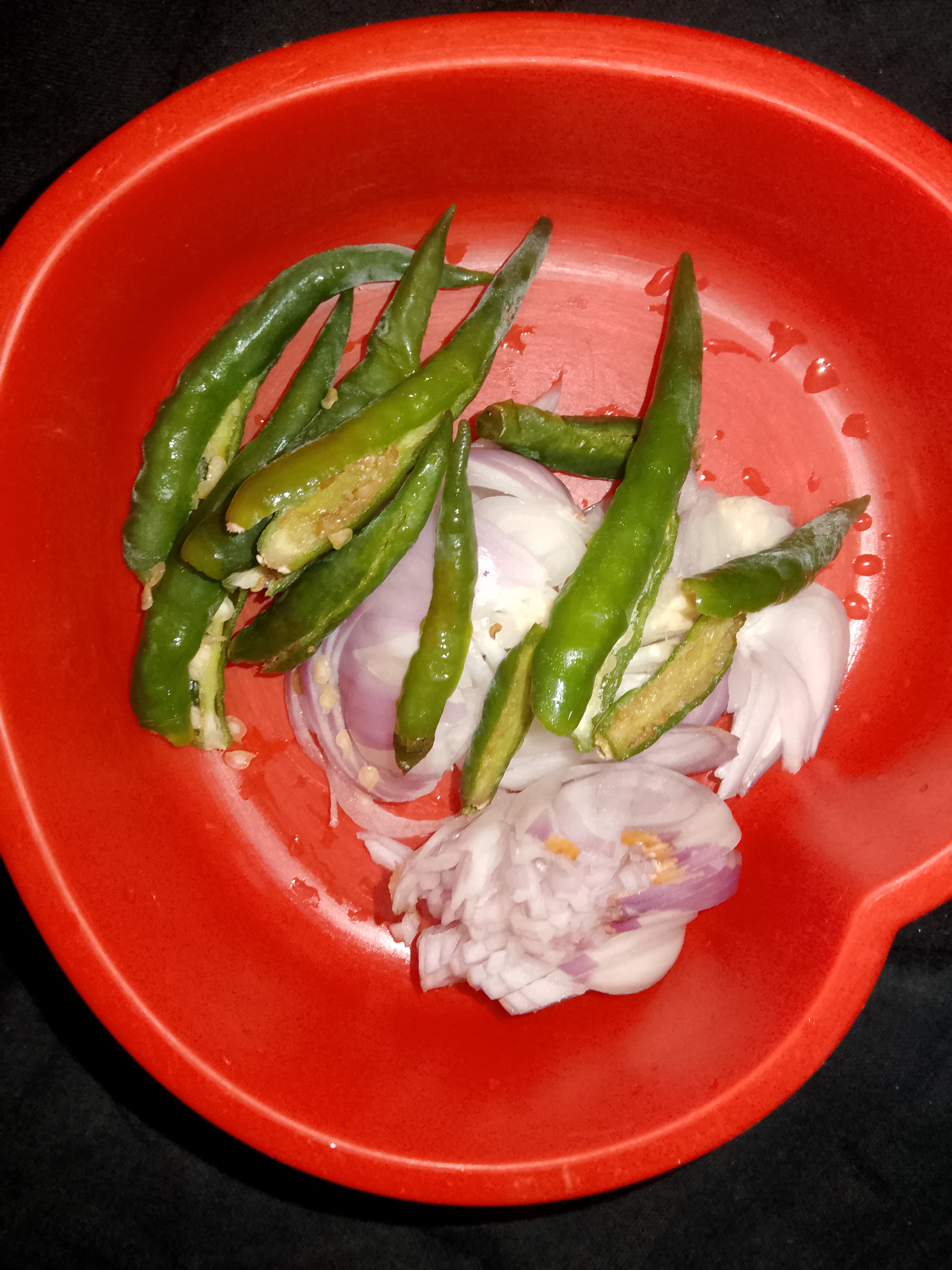 তারপর কড়াইতে পরিমাণ মতো তেল দিয়ে দিই। আমি এখানে সরিষার তেল ব্যবহার করেছি। কারণ আমাদের বাসার সবারই গ্যাস্ট্রিক।সরিষার তেল স্বাস্থ্যের জন্য অনেক ভালো। তেল গরম হওয়ার পর কাঁচা মরিচ এবং পেঁয়াজ দিয়ে দিই।