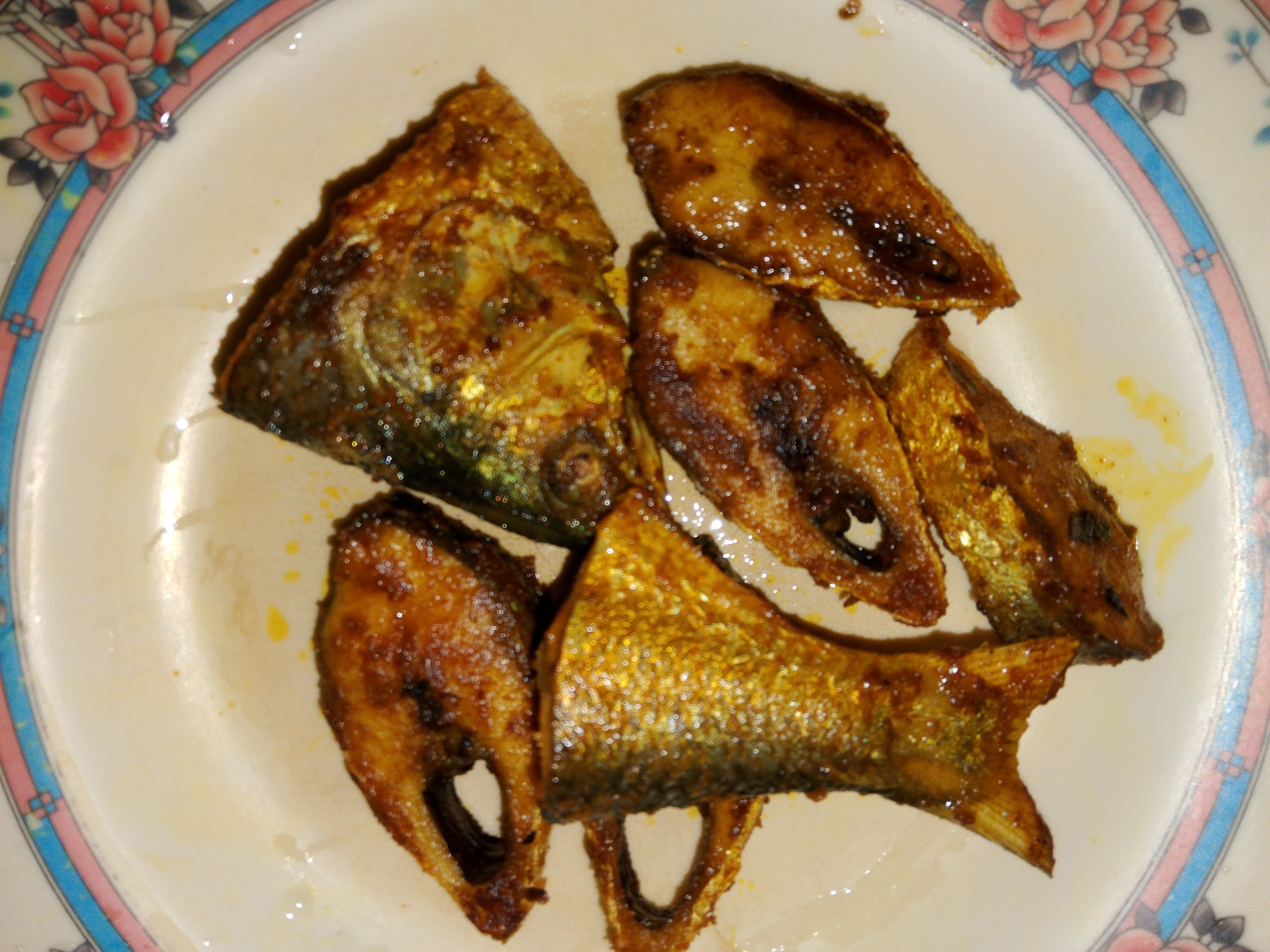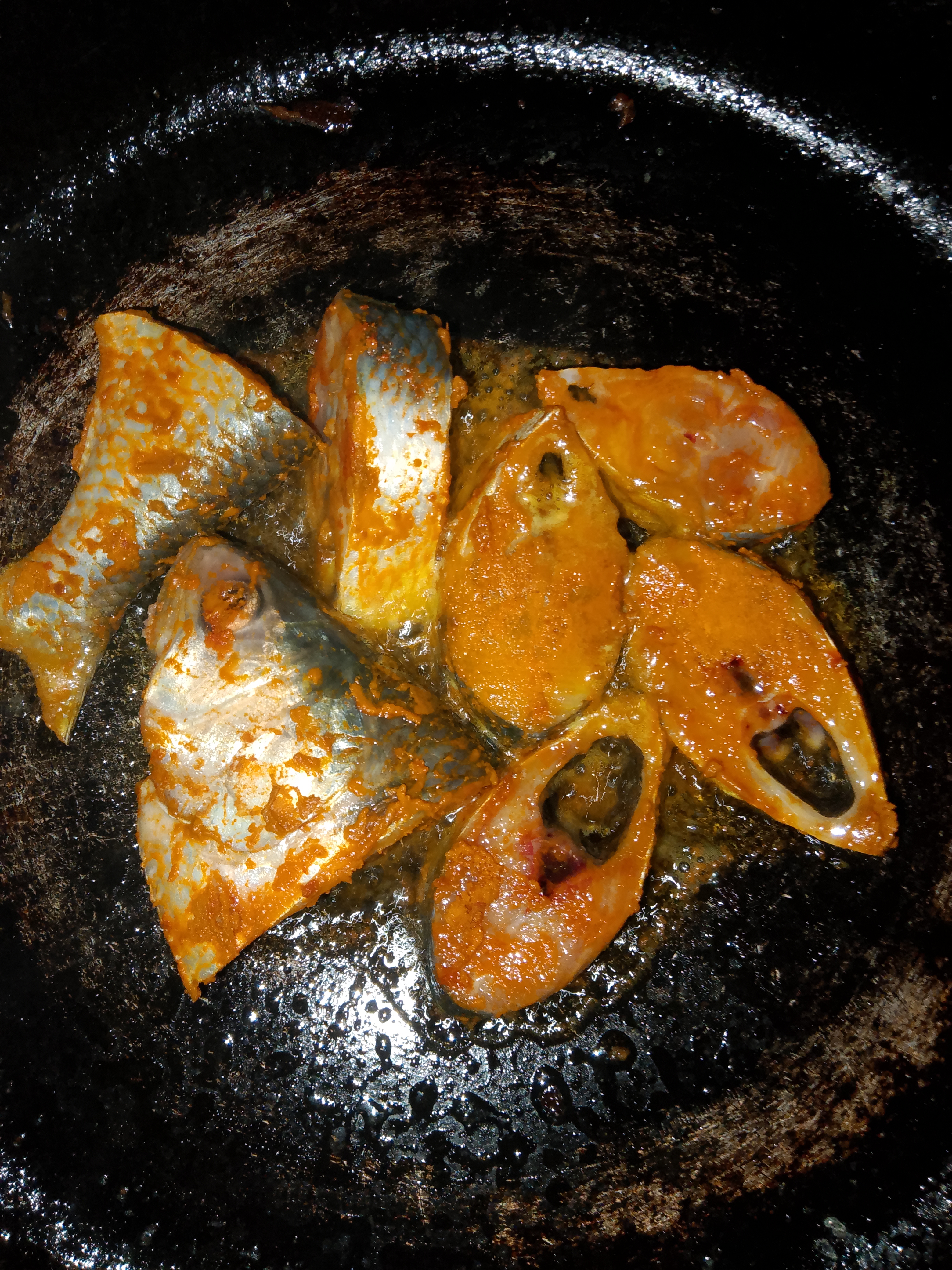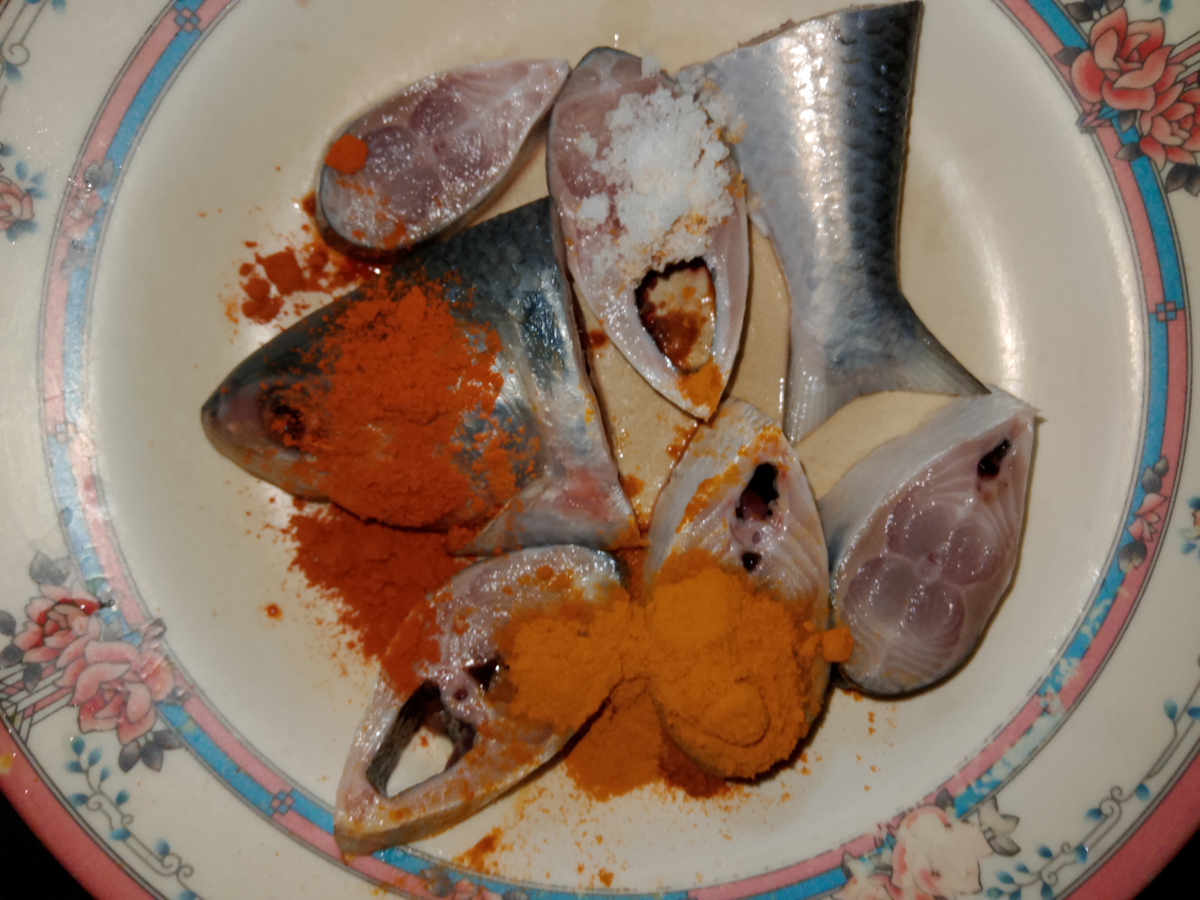 মাছের উপরে আমি হলুদ মরিচ এবং লবণ মাসে কড়াইতে ভাজতে দিই।