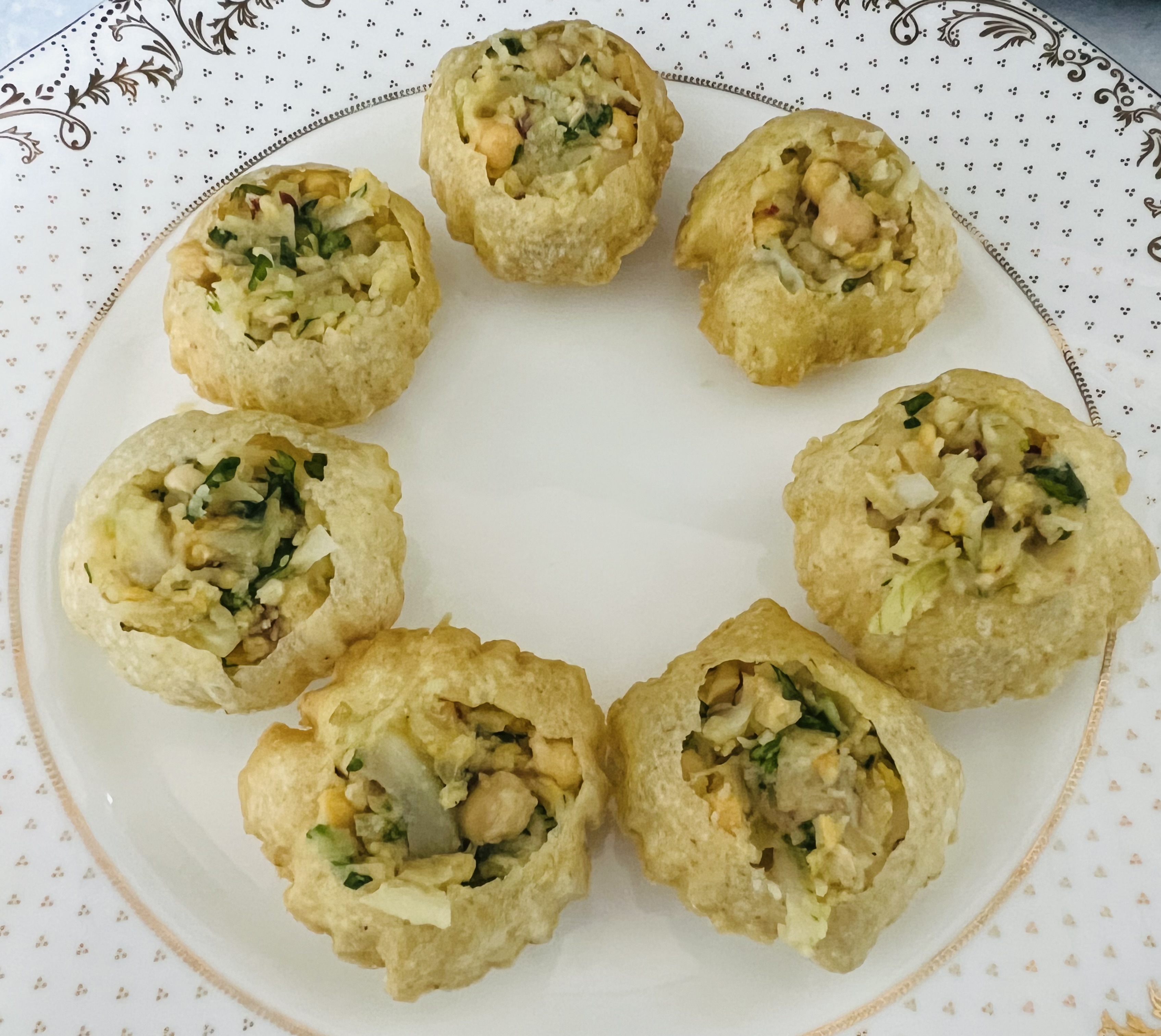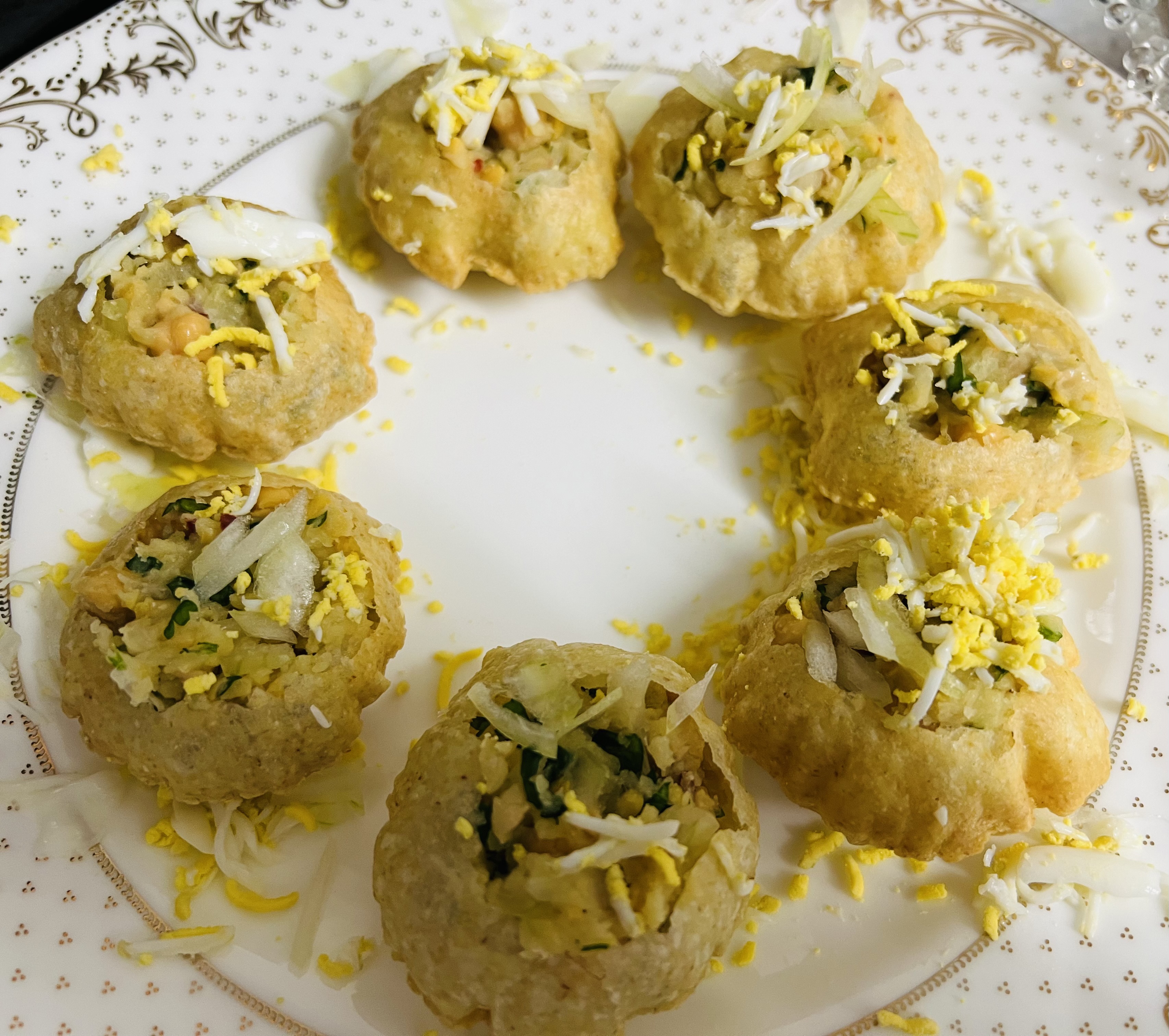 এরপর পুরি গুলোর মাঝখানে ভেঙে একটু করে মাখানো উপকরণগুলো ভরে দিয়ে দিয়েছি। এরপর এর উপর দিয়ে পেঁয়াজ কুচি ছিটিয়ে দিয়েছি।