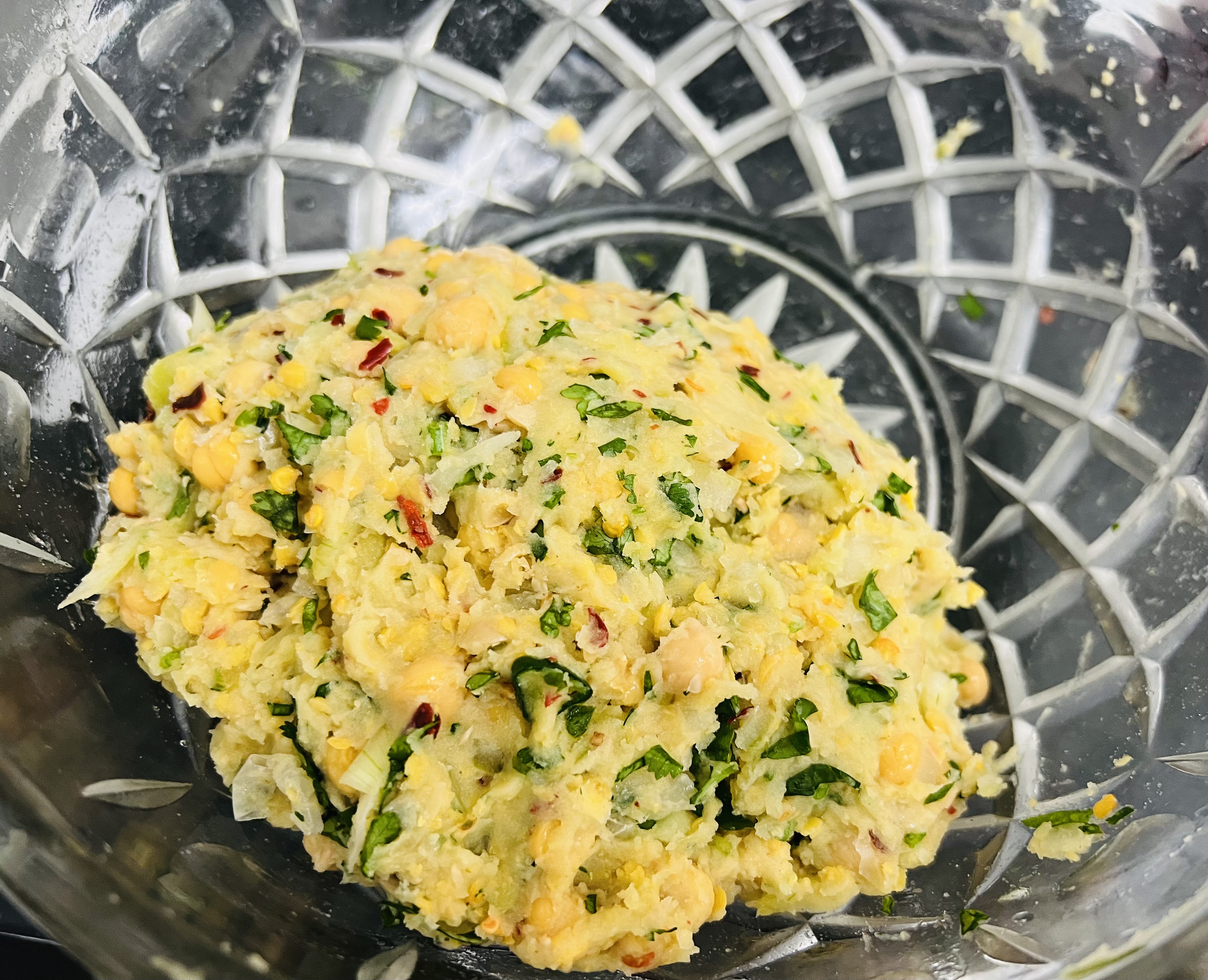 কেনা পুরি। পেঁয়াজ, কাঁচামরিচ ও ধনেপাতা কেটে নিয়েছি।