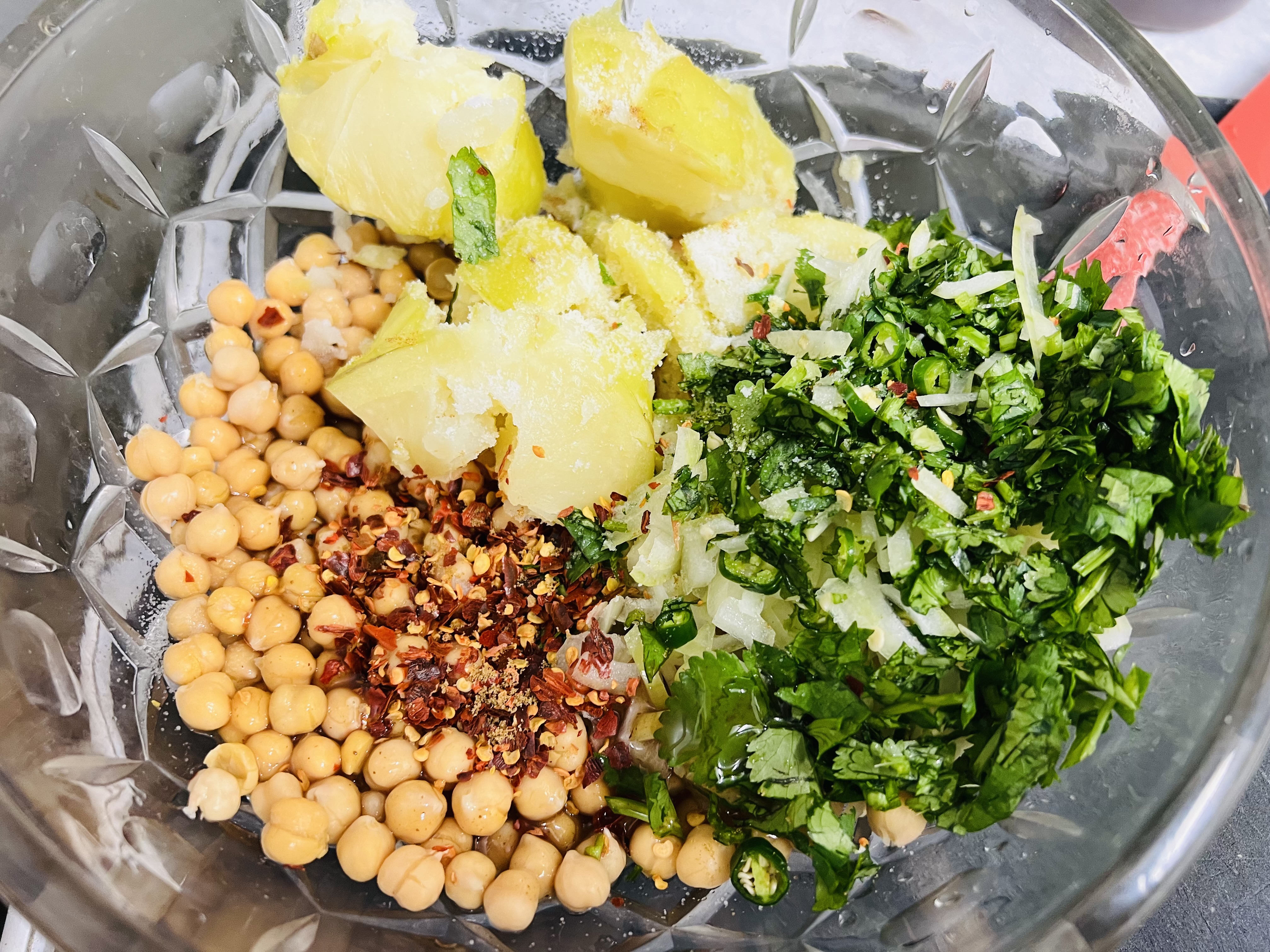 ছোলা গুলো পট থেকে বের করে পানি দিয়ে ভালোভাবে ধুয়ে নিয়েছি। এরপর আলু সিদ্ধ করে নিয়েছি।