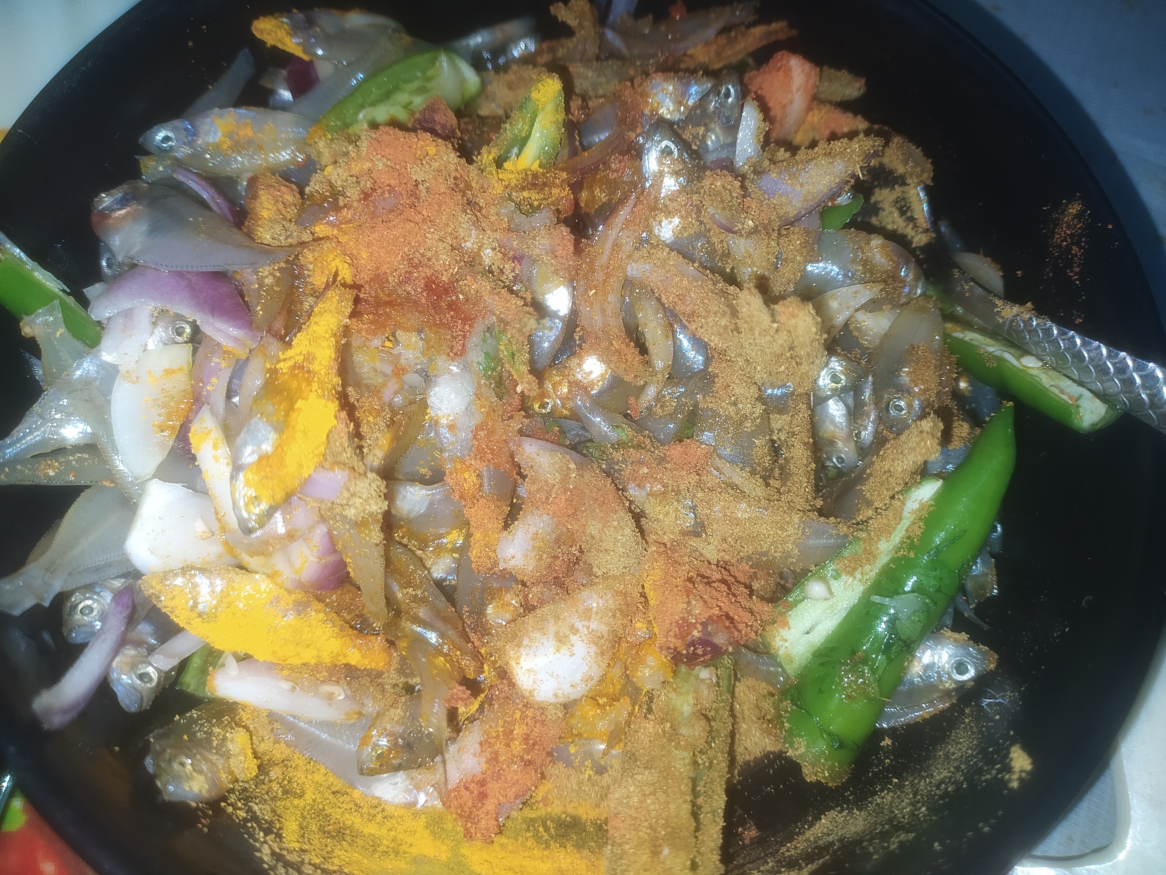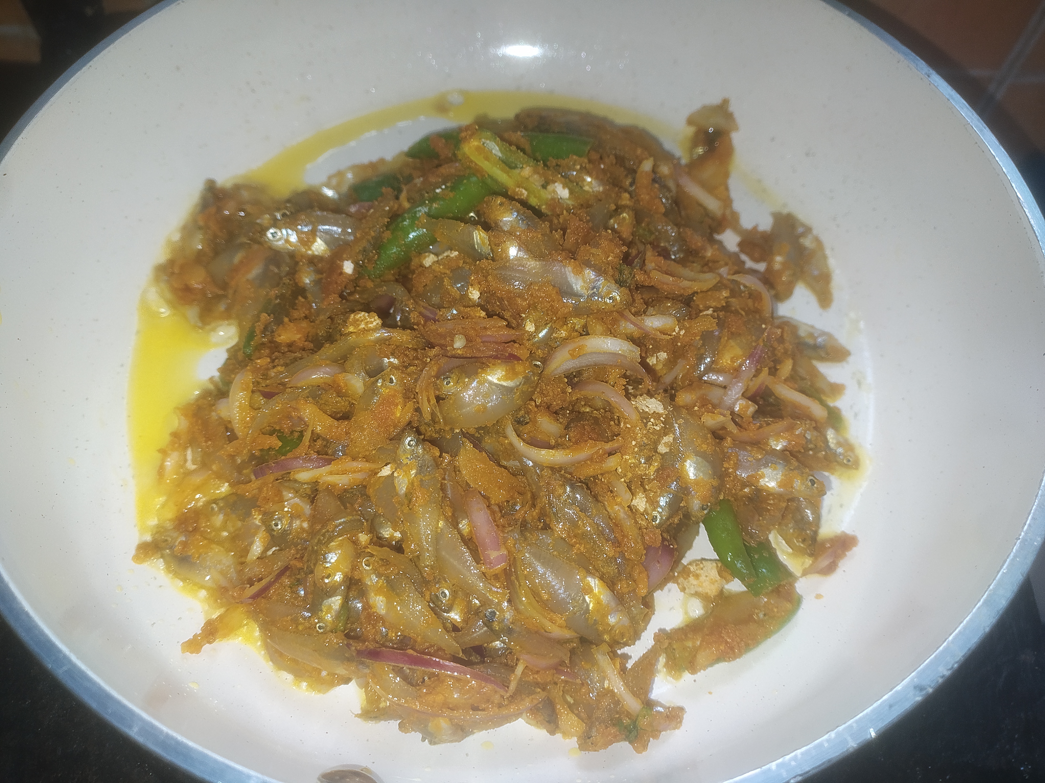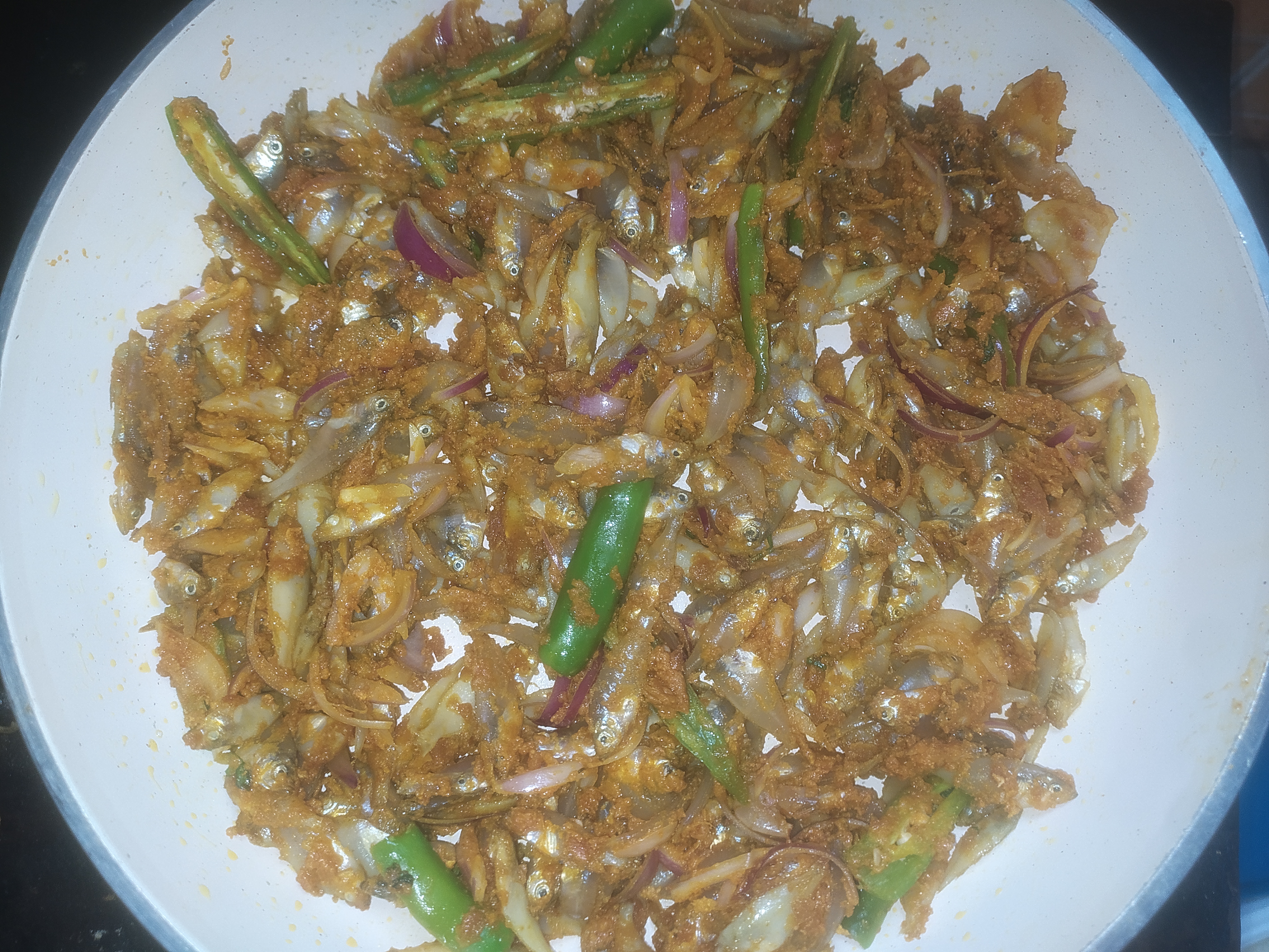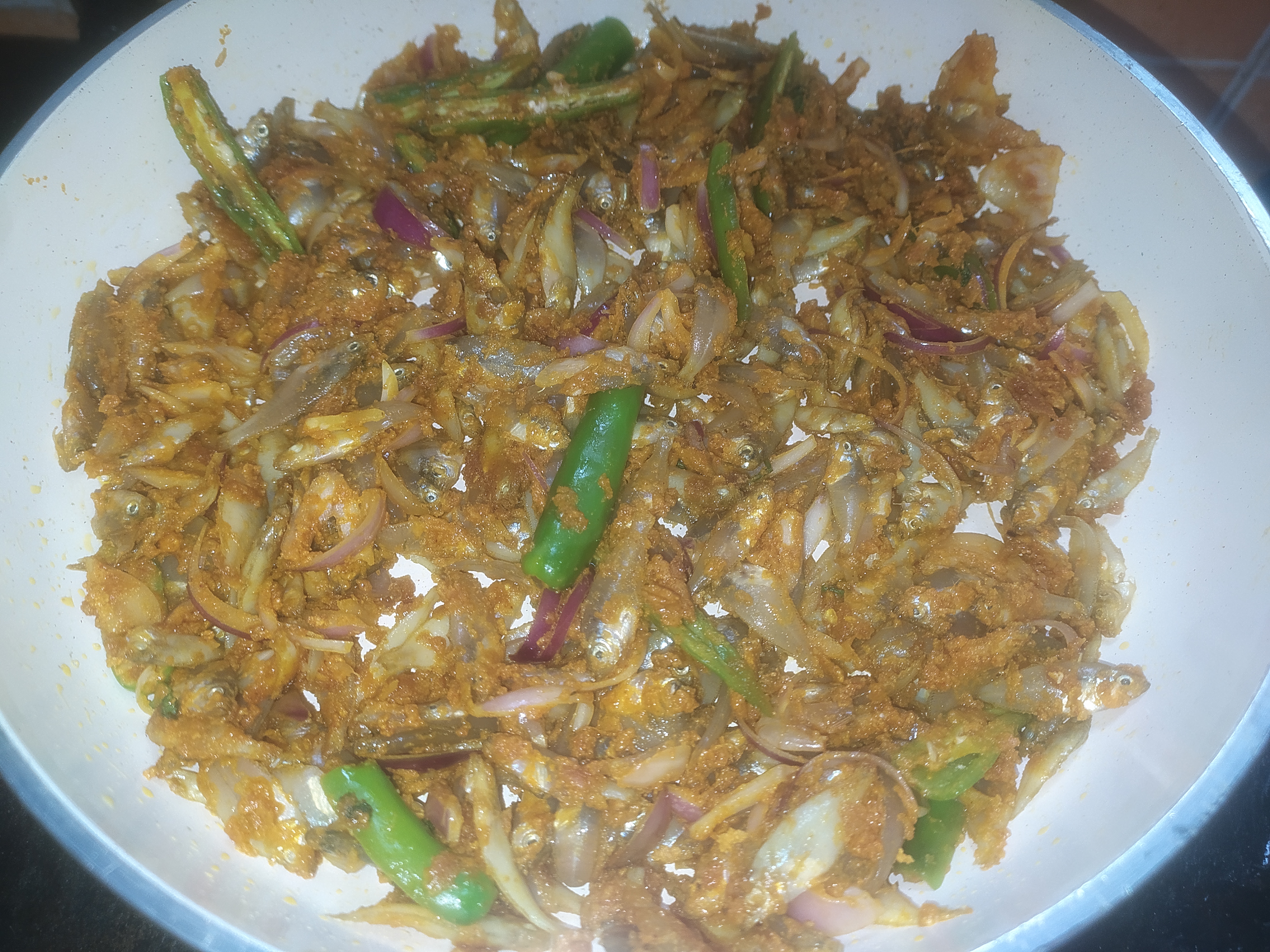 ফ্রাই প্যানে মাছ গুলো দিয়ে দেওয়ার পর সবগুলো সুন্দরভাবে ছড়িয়ে দিলাম। এ পর্যায়ে চুলার তাপটা মিডিয়াম রেখে মাছগুলো ভাজতে হবে। মাছগুলো দেখা যাচ্ছে হালকা হালকা বর্ণ চেঞ্জ করে সিদ্ধ হয়ে যাচ্ছে। এখানে সবগুলো উপকরণ একসাথে দেওয়ার কারণ হলো। মাছ গুলোর সাথে পেঁয়াজগুলো একসাথে ভাজা হয়ে যাবে। আর নয়তো পেয়াজ যদি আগে দেওয়া হতো তাহলে পেঁয়াজগুলো মাছের আগে পুড়ে যেত। তাই সবগুলো উপকরণ একই সাথে মেরিনেট করলে সবগুলো একসাথে সুন্দর করে ভাজা হয়। আর রেসিপিটা খেতেও দারুন হয়।