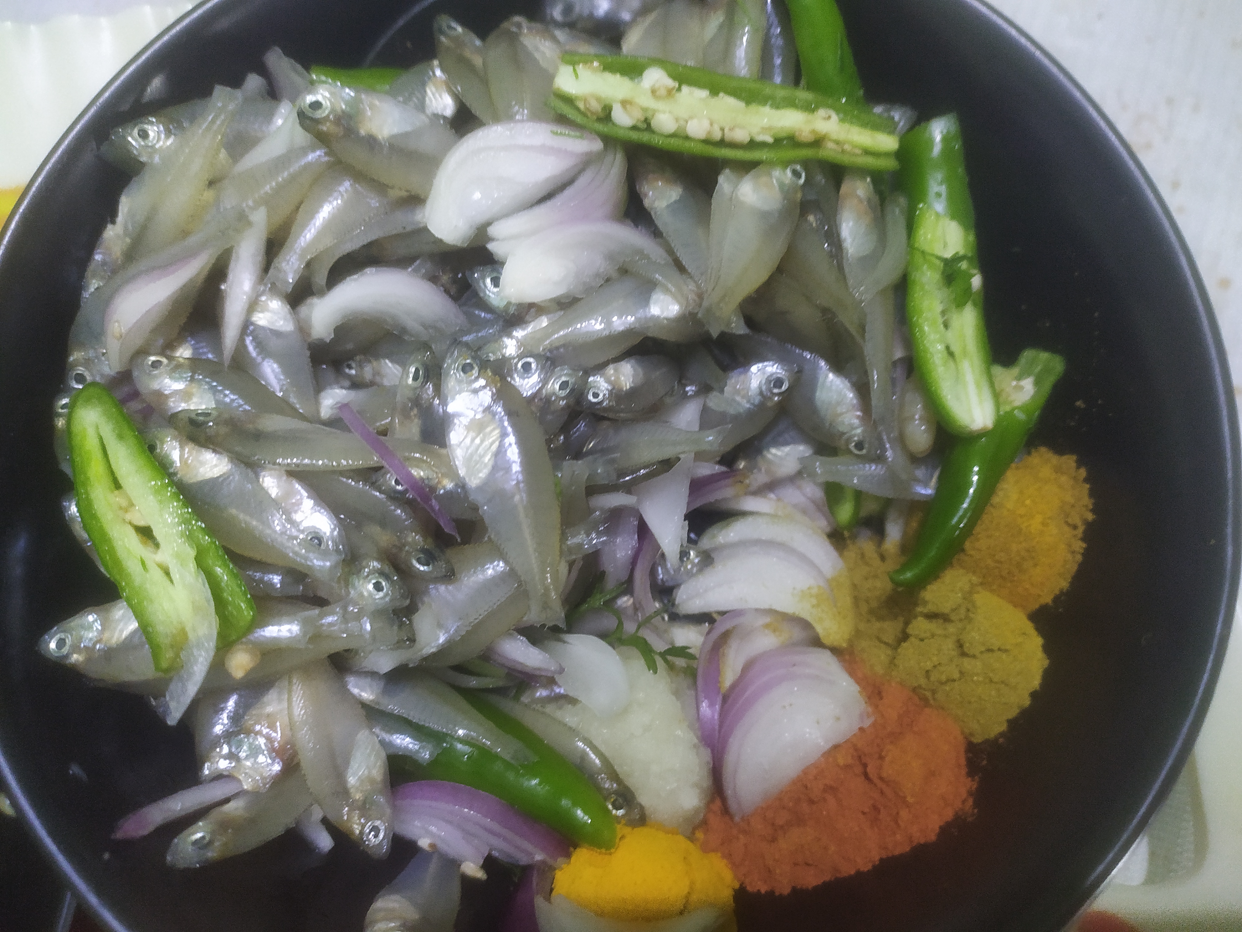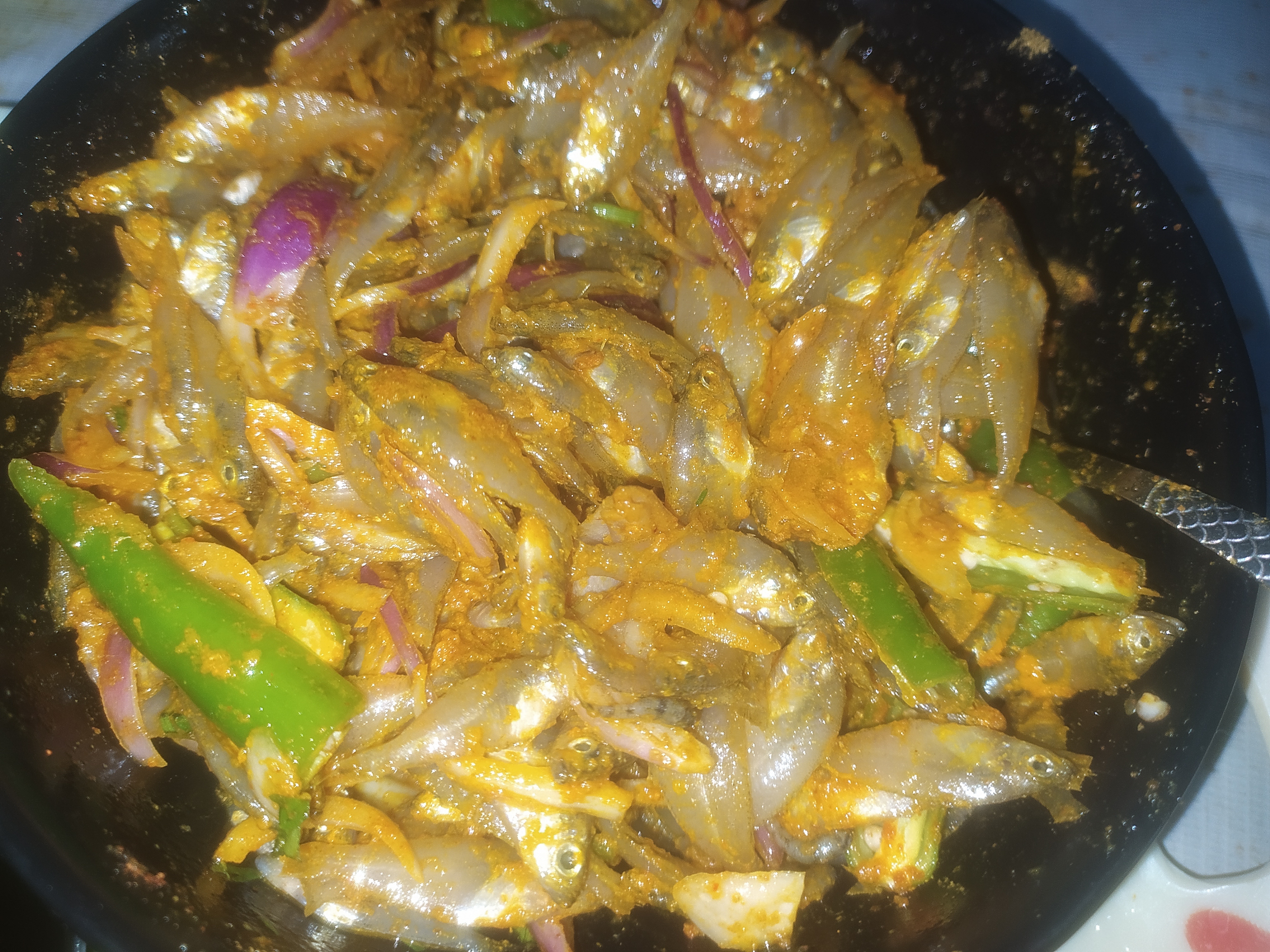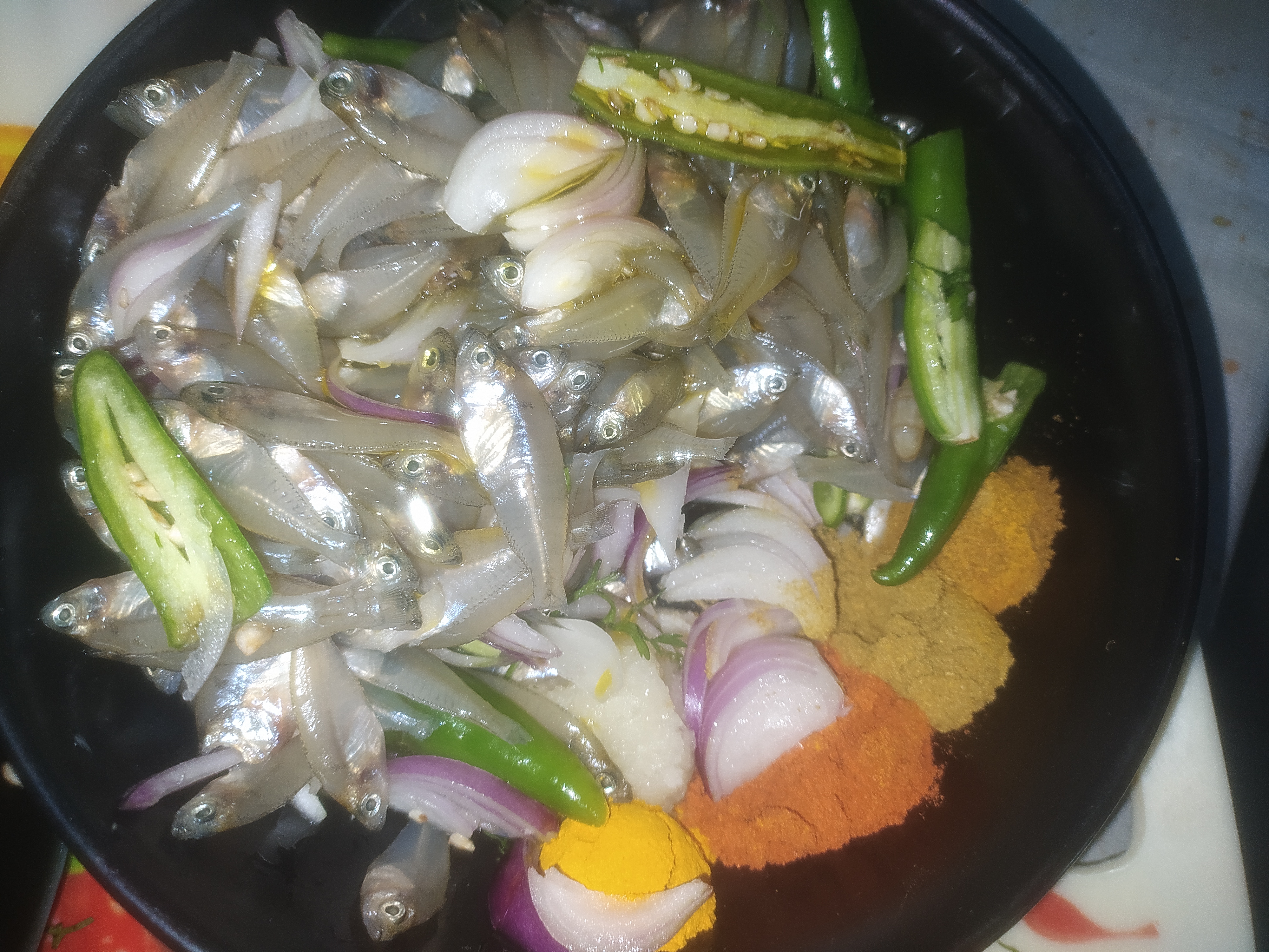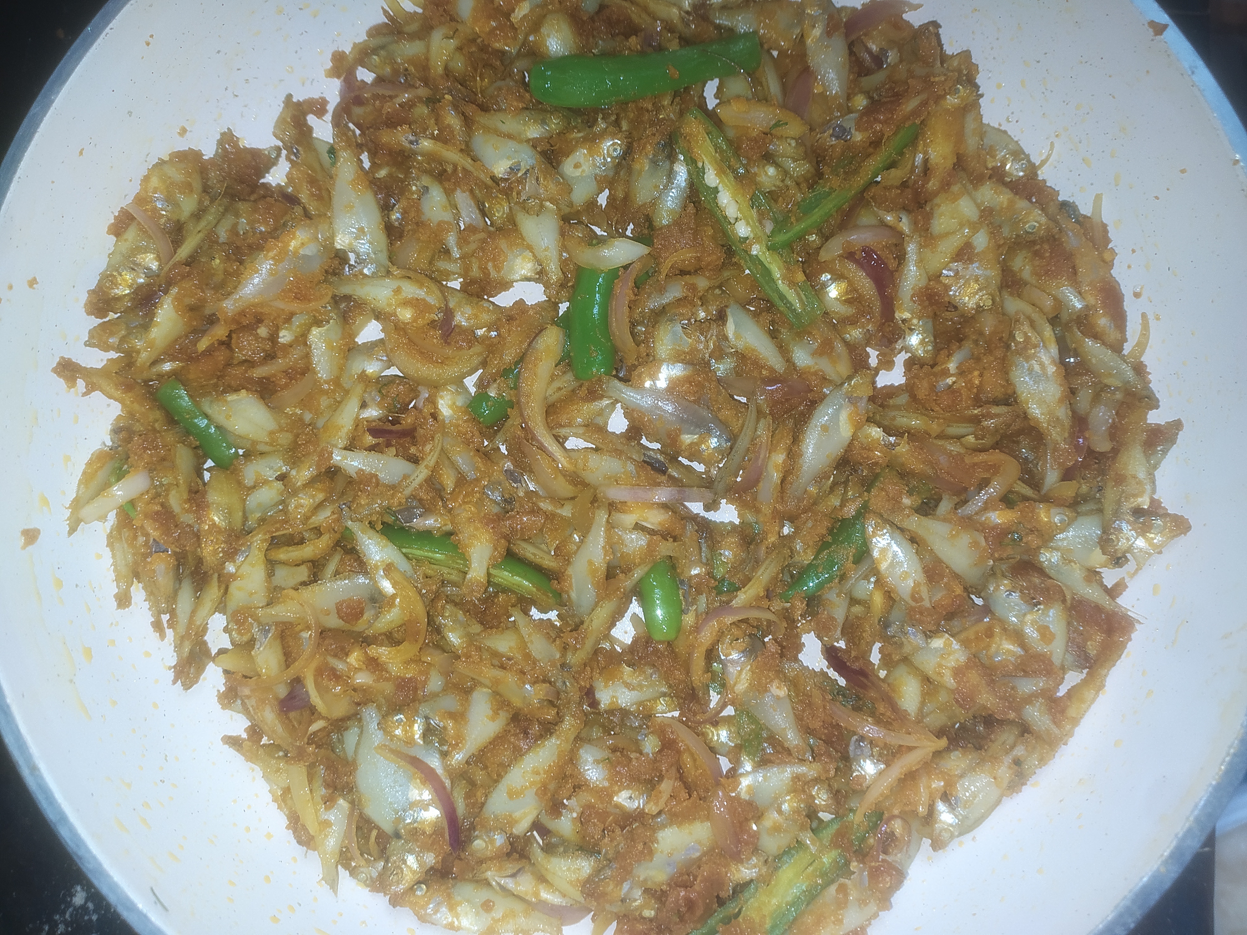 ফ্রাই প্যানে মাছ গুলো দিয়ে দেওয়ার পর সবগুলো সুন্দরভাবে ছড়িয়ে দিলাম। এ পর্যায়ে চুলার তাপটা মিডিয়াম রেখে মাছগুলো ভাজতে হবে। মাছগুলো দেখা যাচ্ছে হালকা হালকা বর্ণ চেঞ্জ করে সিদ্ধ হয়ে যাচ্ছে। এখানে সবগুলো উপকরণ একসাথে দেওয়ার কারণ হলো। মাছ গুলোর সাথে পেঁয়াজগুলো একসাথে ভাজা হয়ে যাবে। আর নয়তো পেয়াজ যদি আগে দেওয়া হতো তাহলে পেঁয়াজগুলো মাছের আগে পুড়ে যেত। তাই সবগুলো উপকরণ একই সাথে মেরিনেট করলে সবগুলো একসাথে সুন্দর করে ভাজা হয়। আর রেসিপিটা খেতেও দারুন হয়।