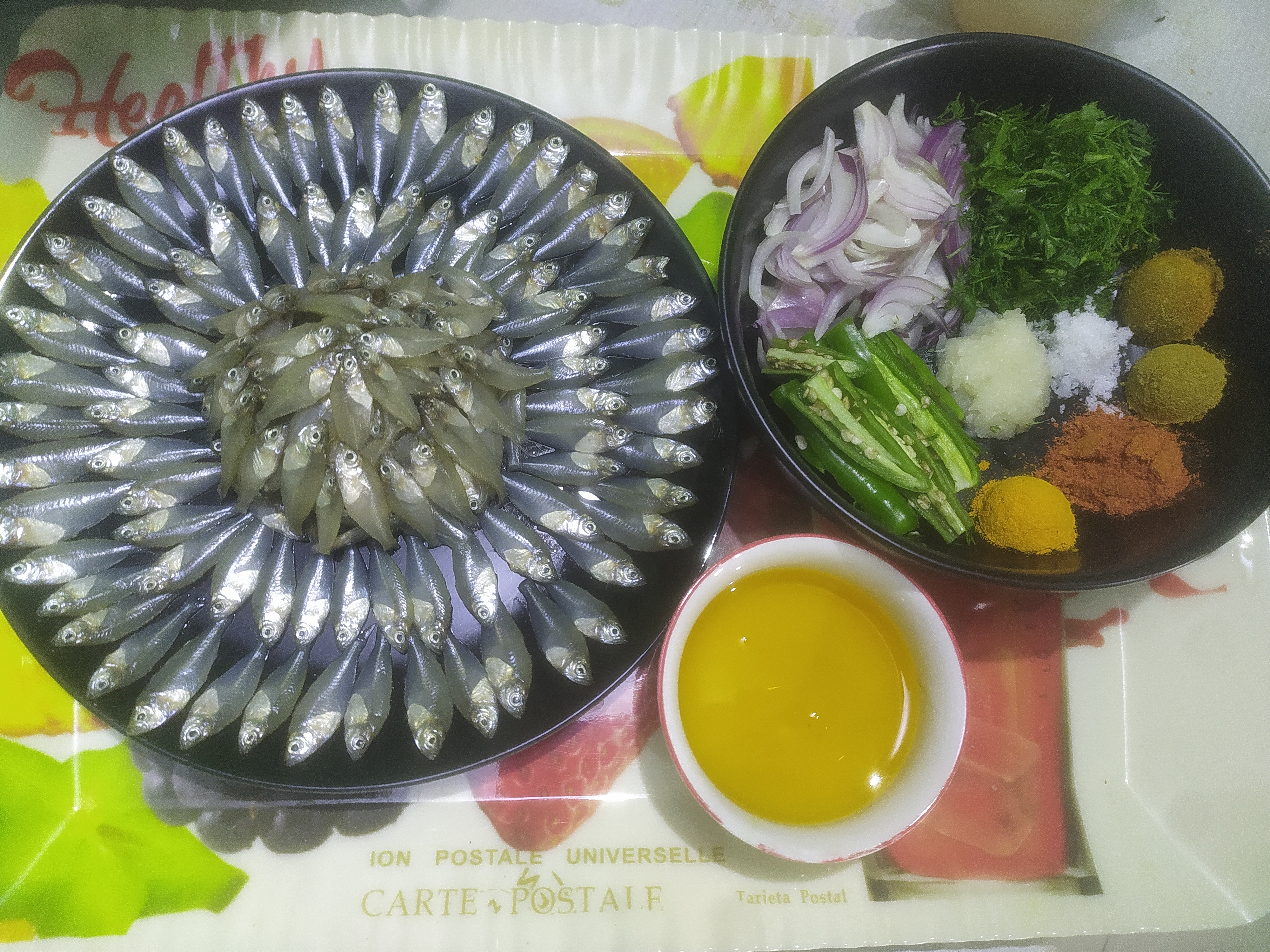 এ পর্যায়ে প্রথমে সবগুলো উপকরণ একটি বাটিতে রেখে দিলাম। তারপর তাতে অল্প পরিমাণে সরিষার তেল ঢেলে দিলাম। তারপর সবগুলো উপকরণ একসাথে চামচ দিয়ে মাখিয়ে নিলাম।