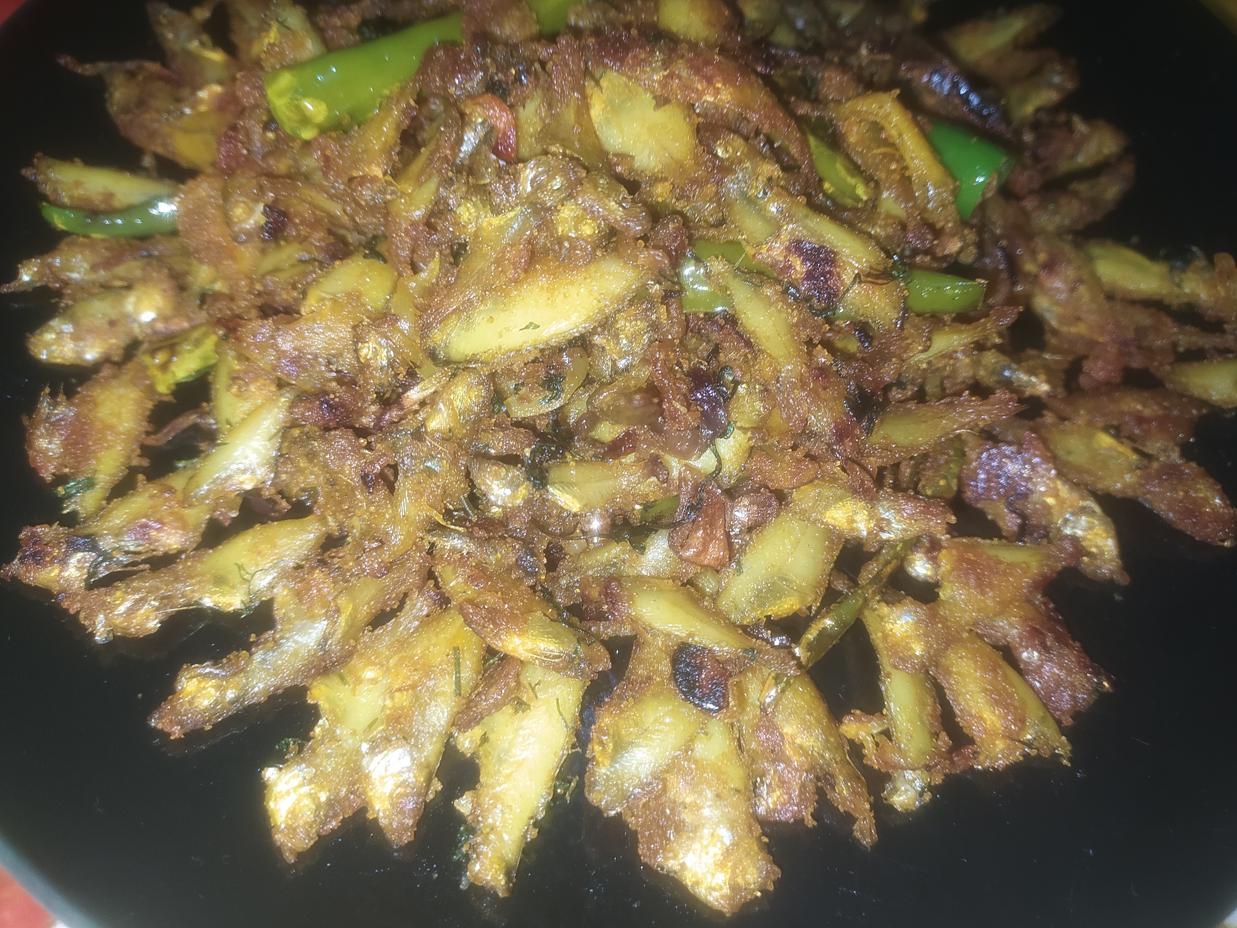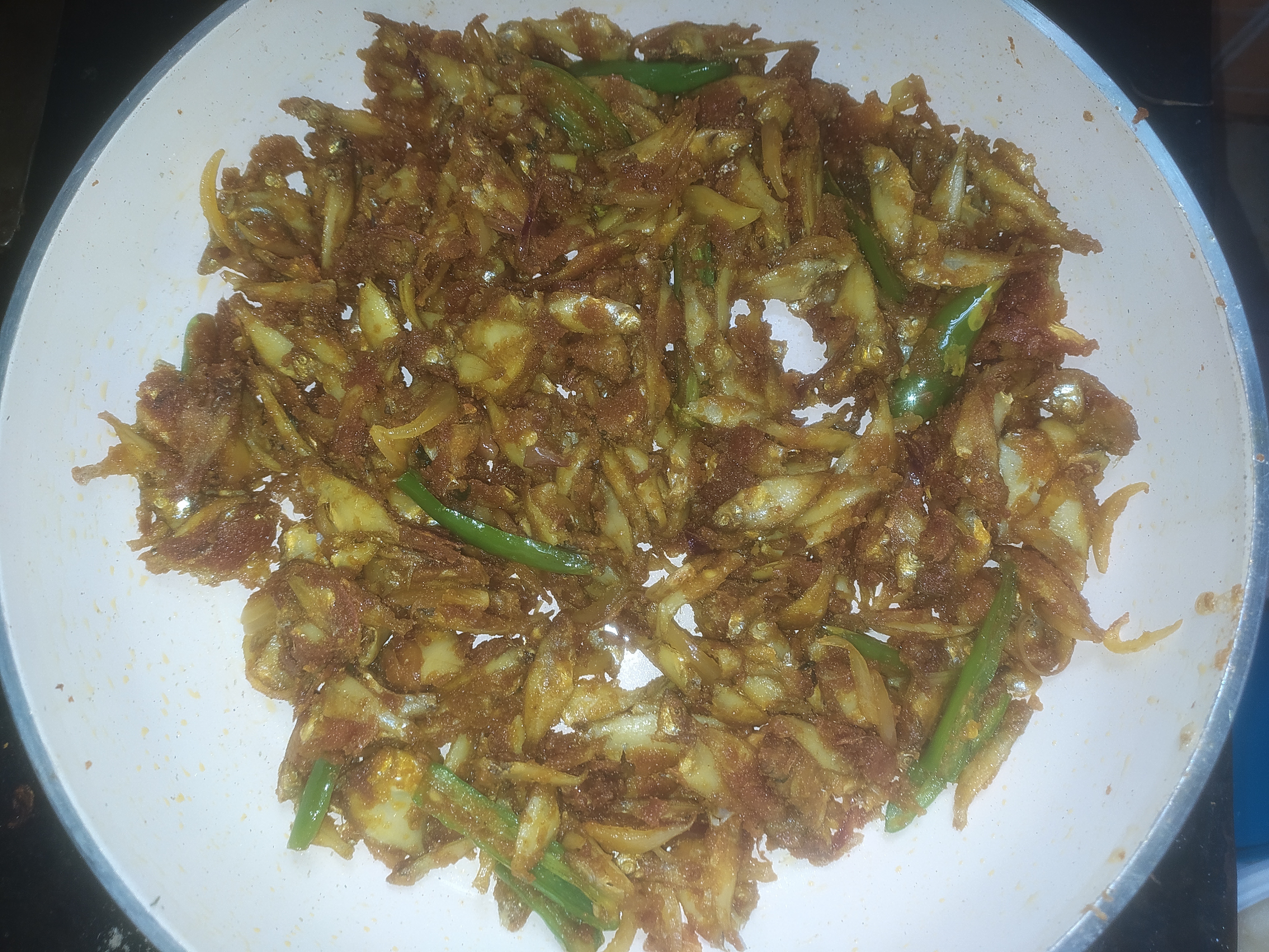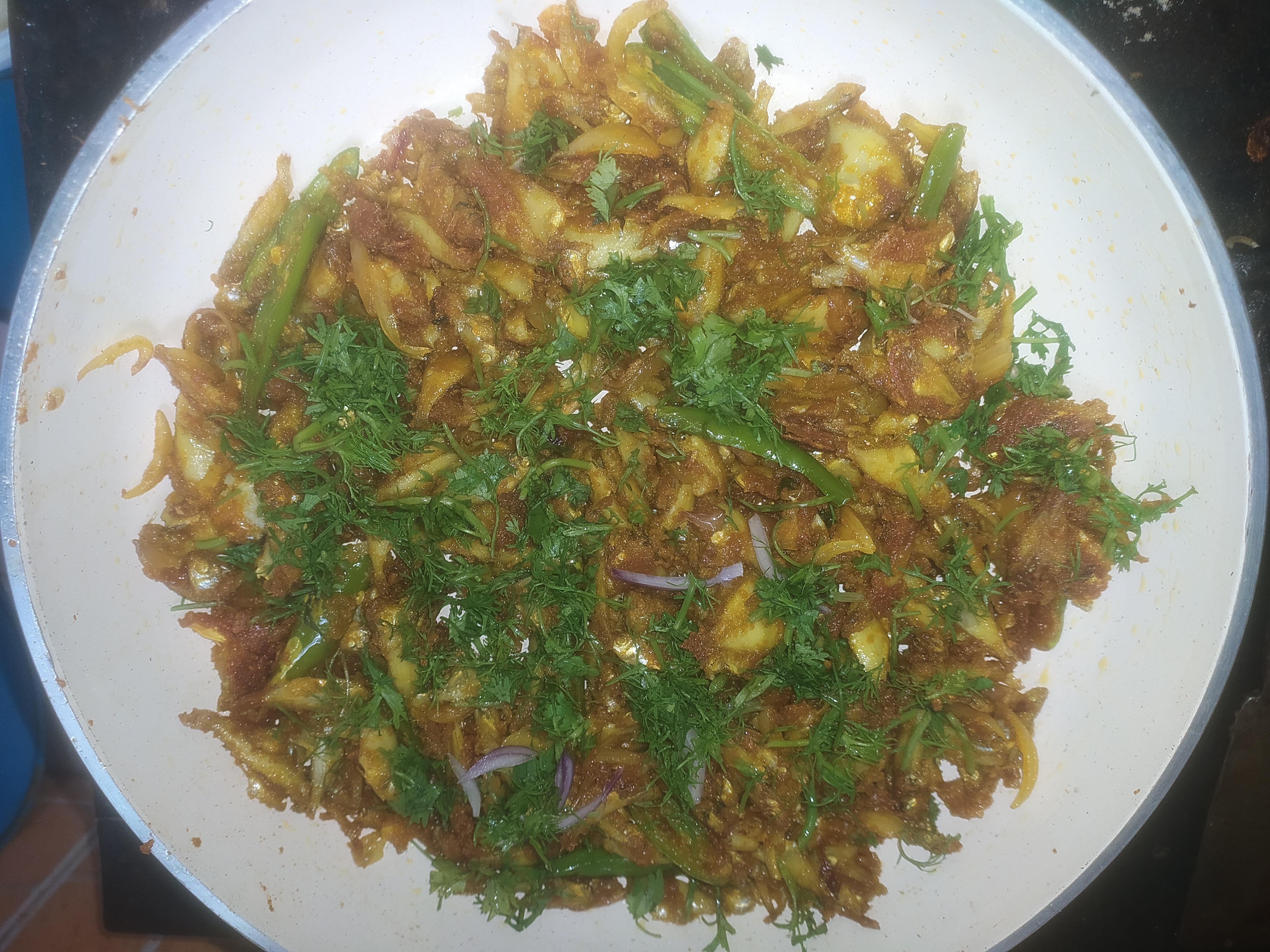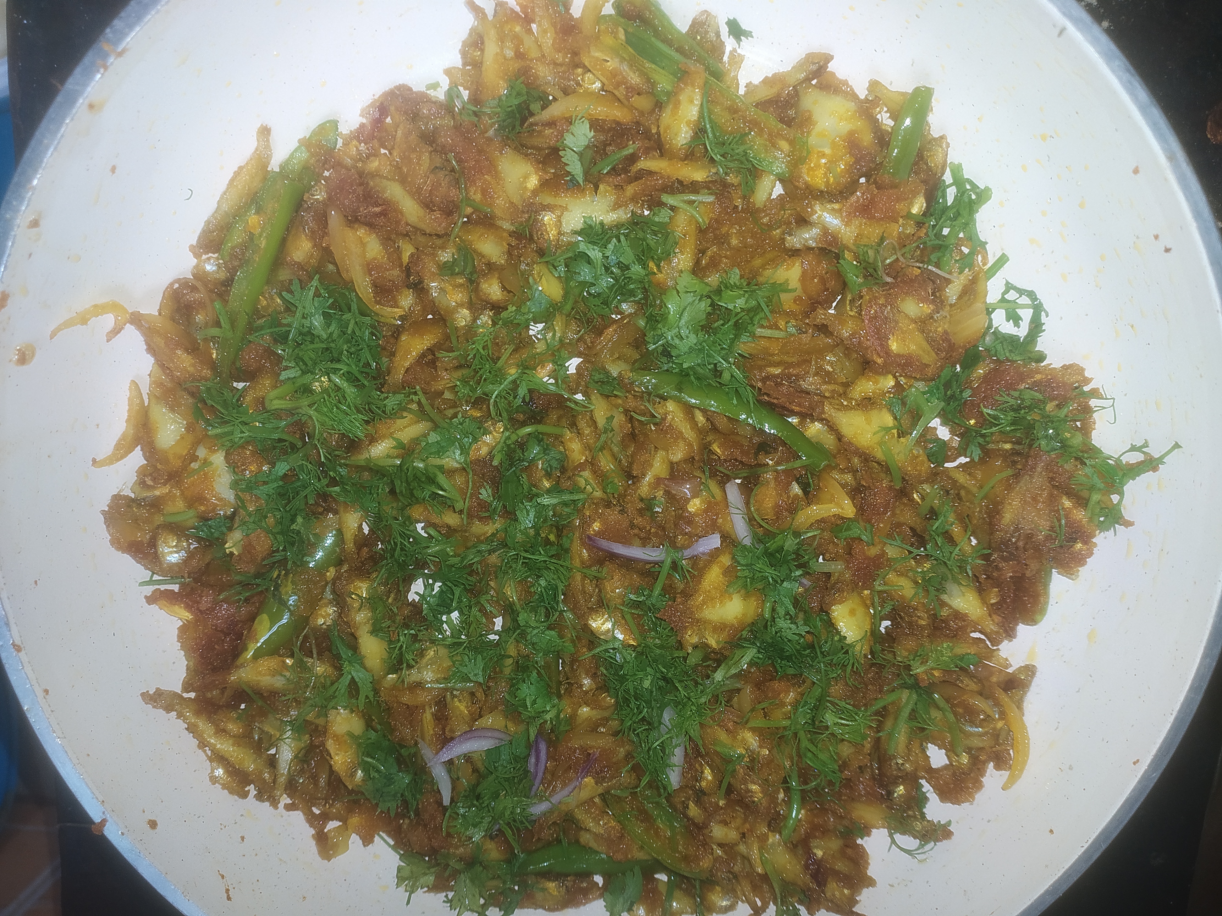 মাছগুলো অনেকক্ষণ দাঁড়িয়ে থেকে আস্তে আস্তে নাড়াচাড়া করে ভেজে নিলাম। মাছ গুলো ভালভাবে ভাজা হয়ে আসার পর। তাতে দিয়ে দিলাম ধনিয়া পাতা। তারপর আবার অনেকক্ষণ নাড়াচাড়া করলাম। যখন মাছগুলো একদম কড়া ভাজা হয়ে যায়। তখন মাছগুলো চুলা থেকে নামিয়ে নিলাম।