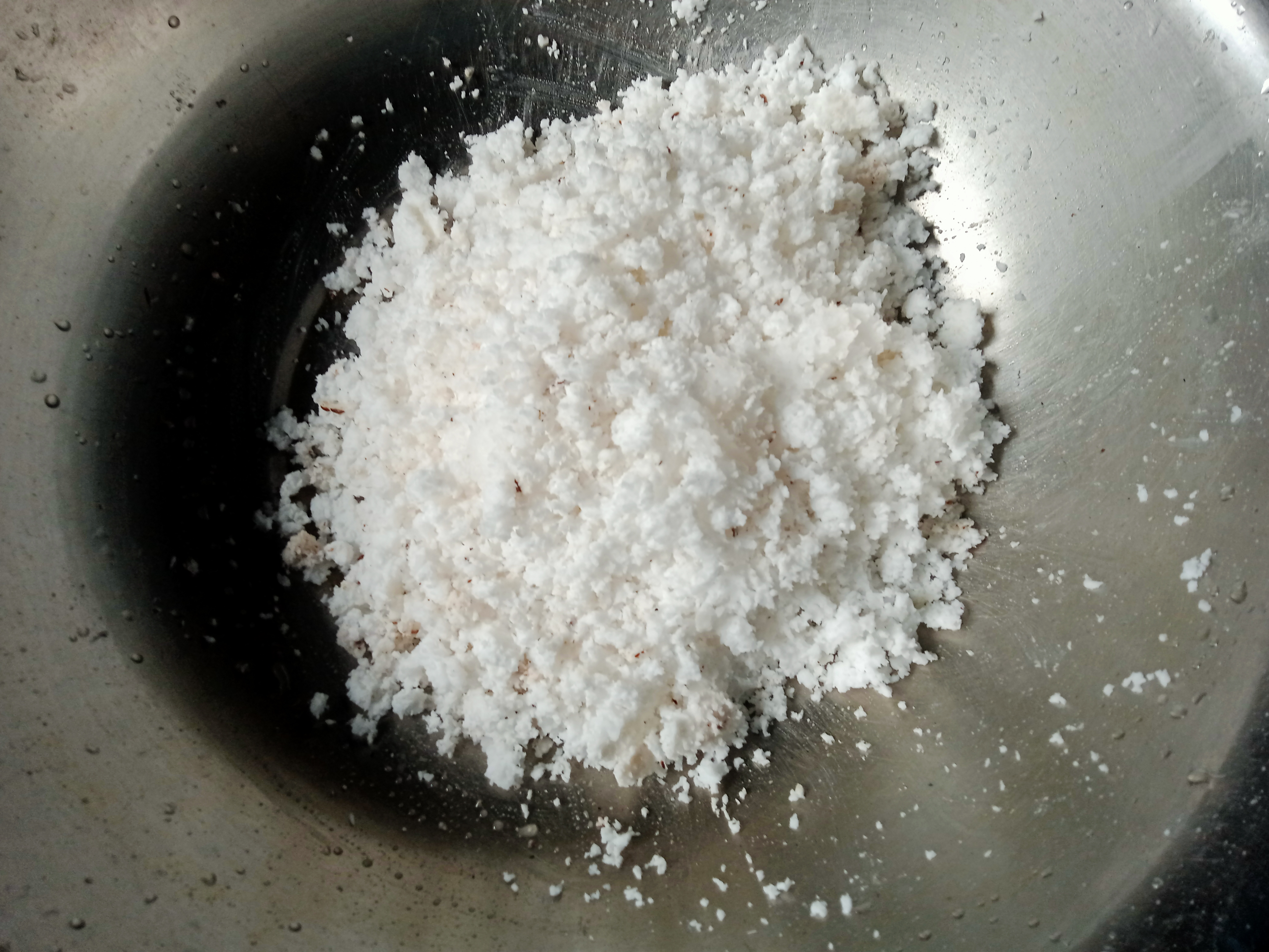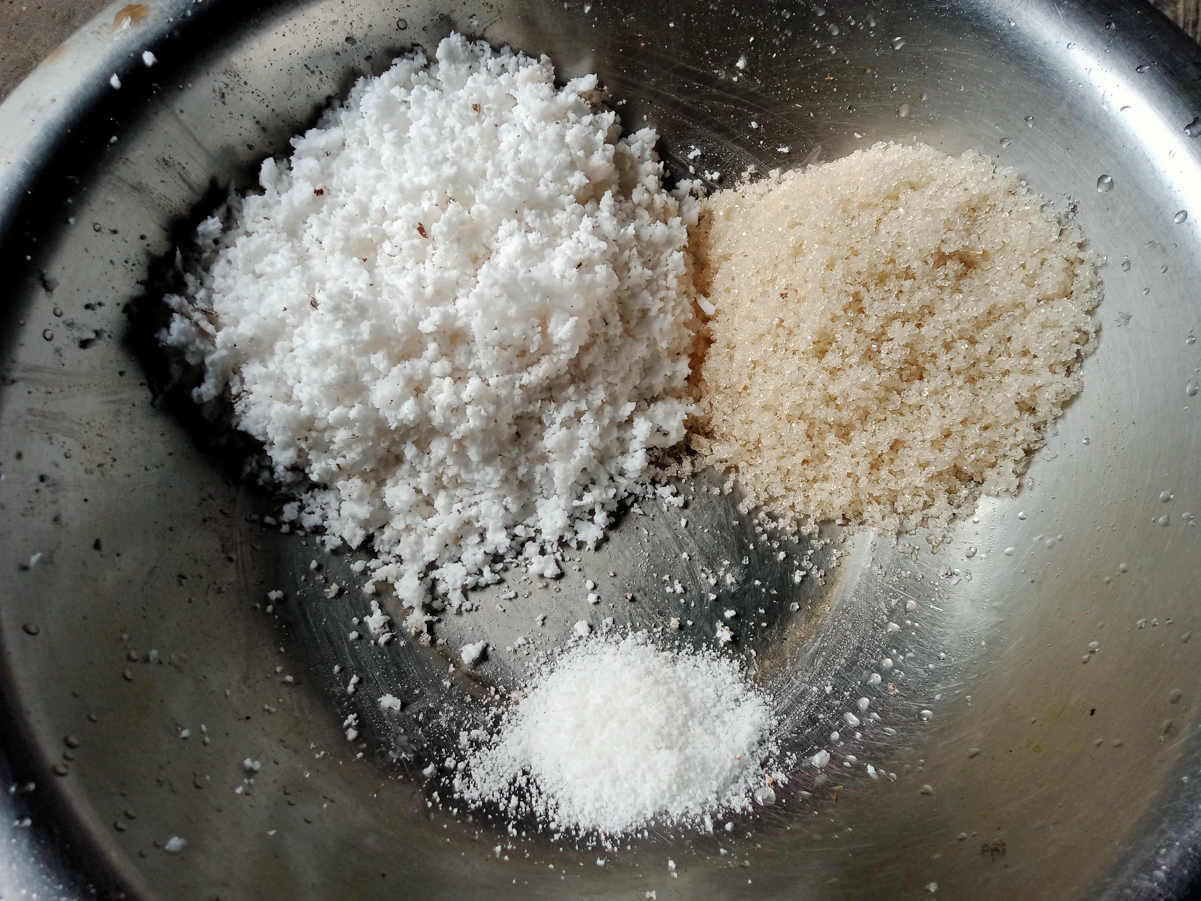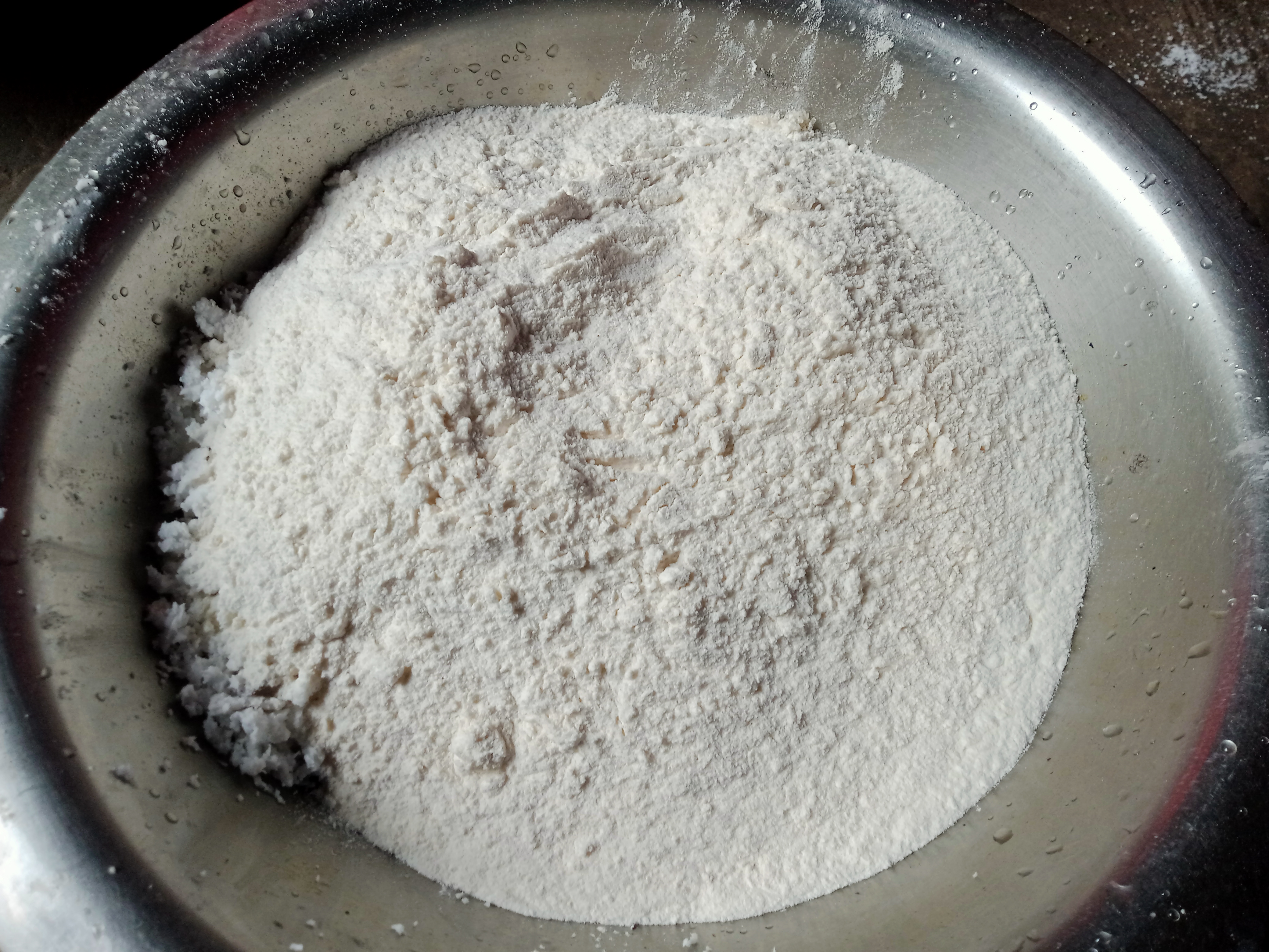 | তারপর চিনি,লবণ,নারিকেলসহ ময়দা ও চালের গুড়ো মিশিয়ে নিলাম।