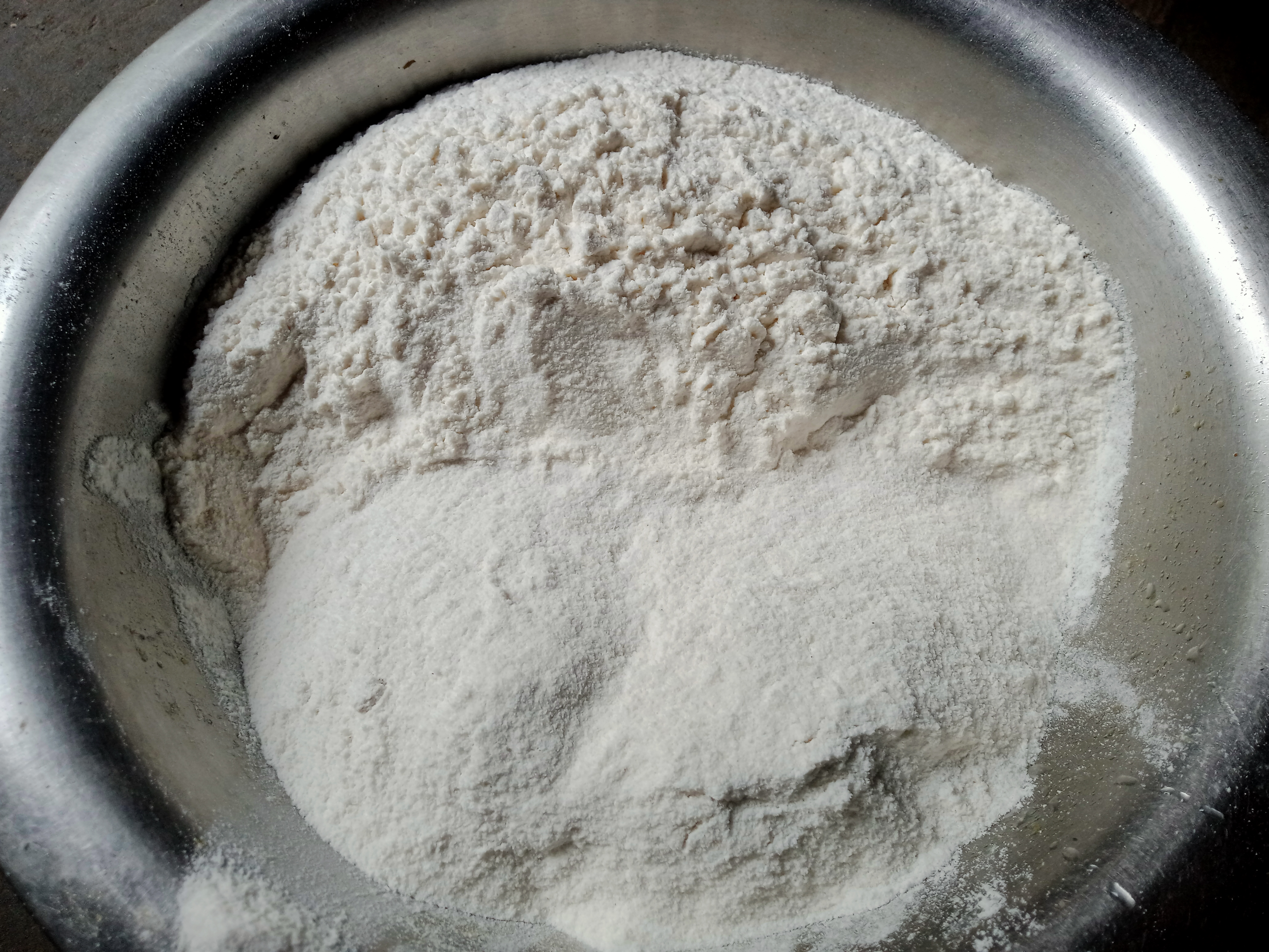 | তারপর আরেকটি পাত্র ময়দা আর চালের গুড়ো নিয়ে নিলাম |