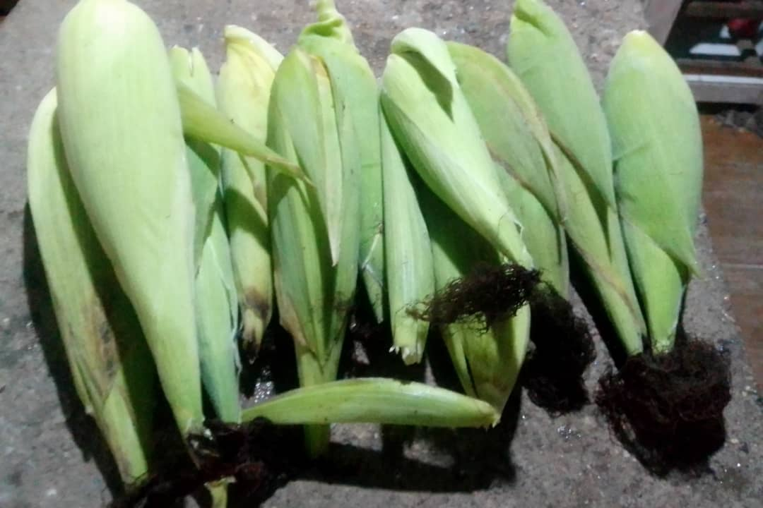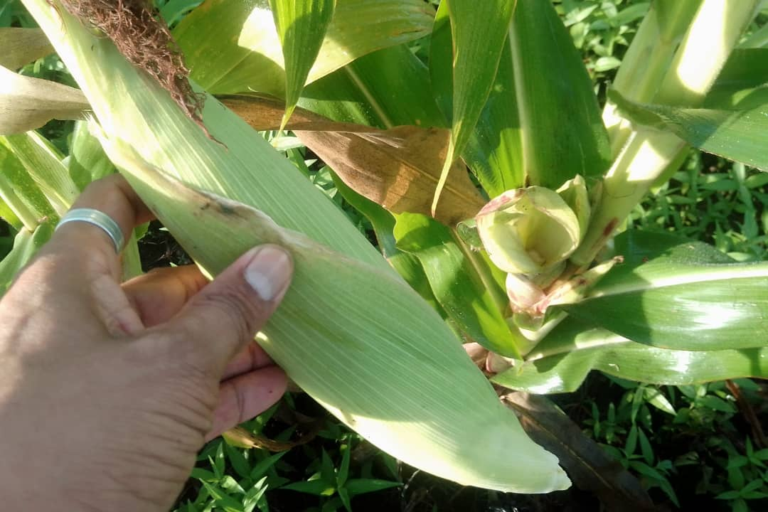 Al llegar a la parcela tome una mazorca de una de las matas y note que ya están listas para ser recogidas y si se quiere preparar alguna comida con jojoto o maíz tierno . Una característica de que ya esta listo es su barba seca. Afortunadamente como había llovido no tenia que regar las plantas ya que la naturaleza había hecho su trabajo.