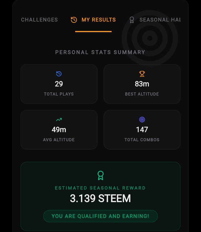 If you look at my game status, you'll see that I've played a total of 29 times so far. My highest score is 83 meters and my average score is 49 meters. And the best thing is that I've earned 3.139 Steam as a seasonal reward while playing. It's really great to get such a reward while playing.