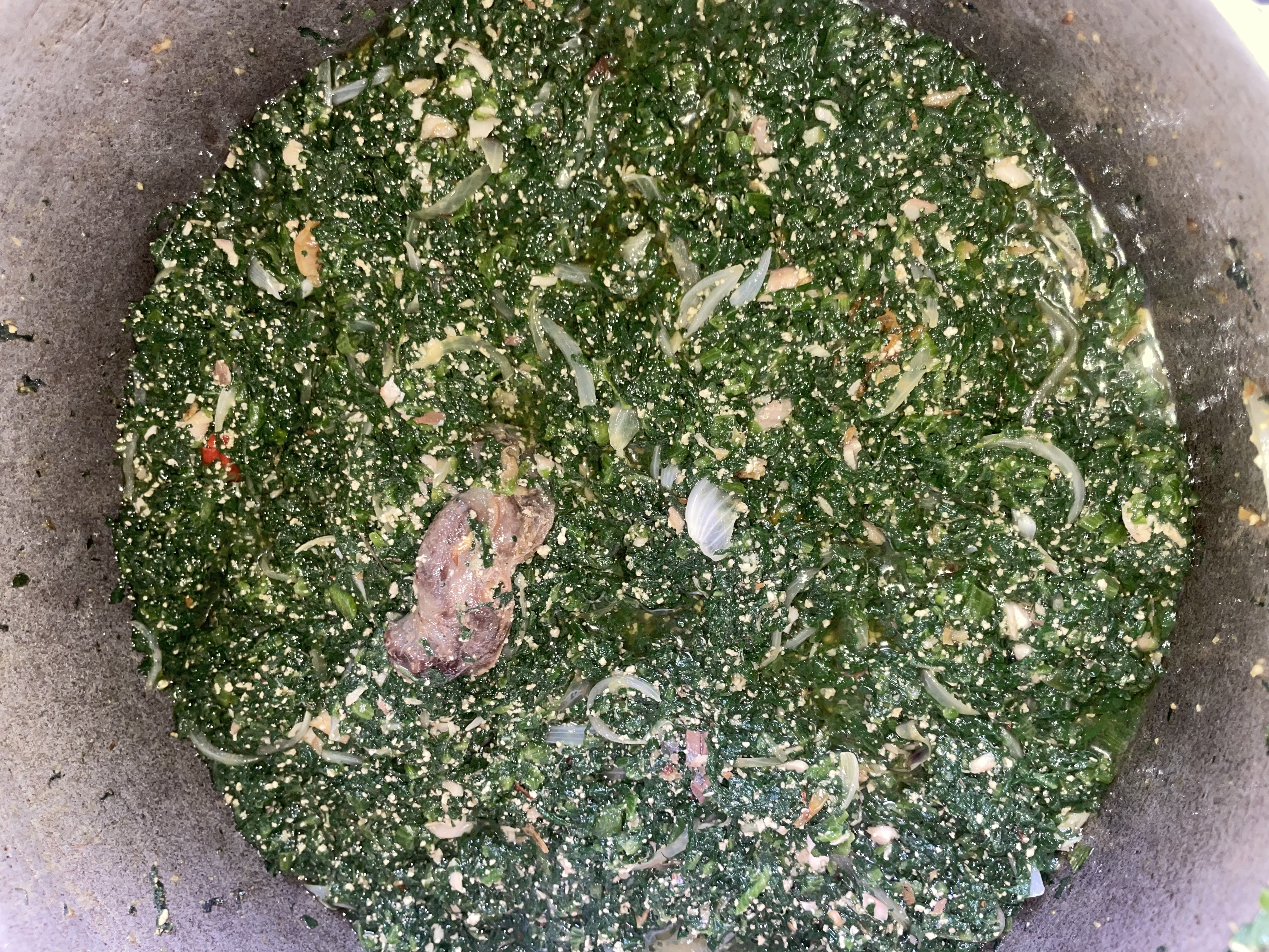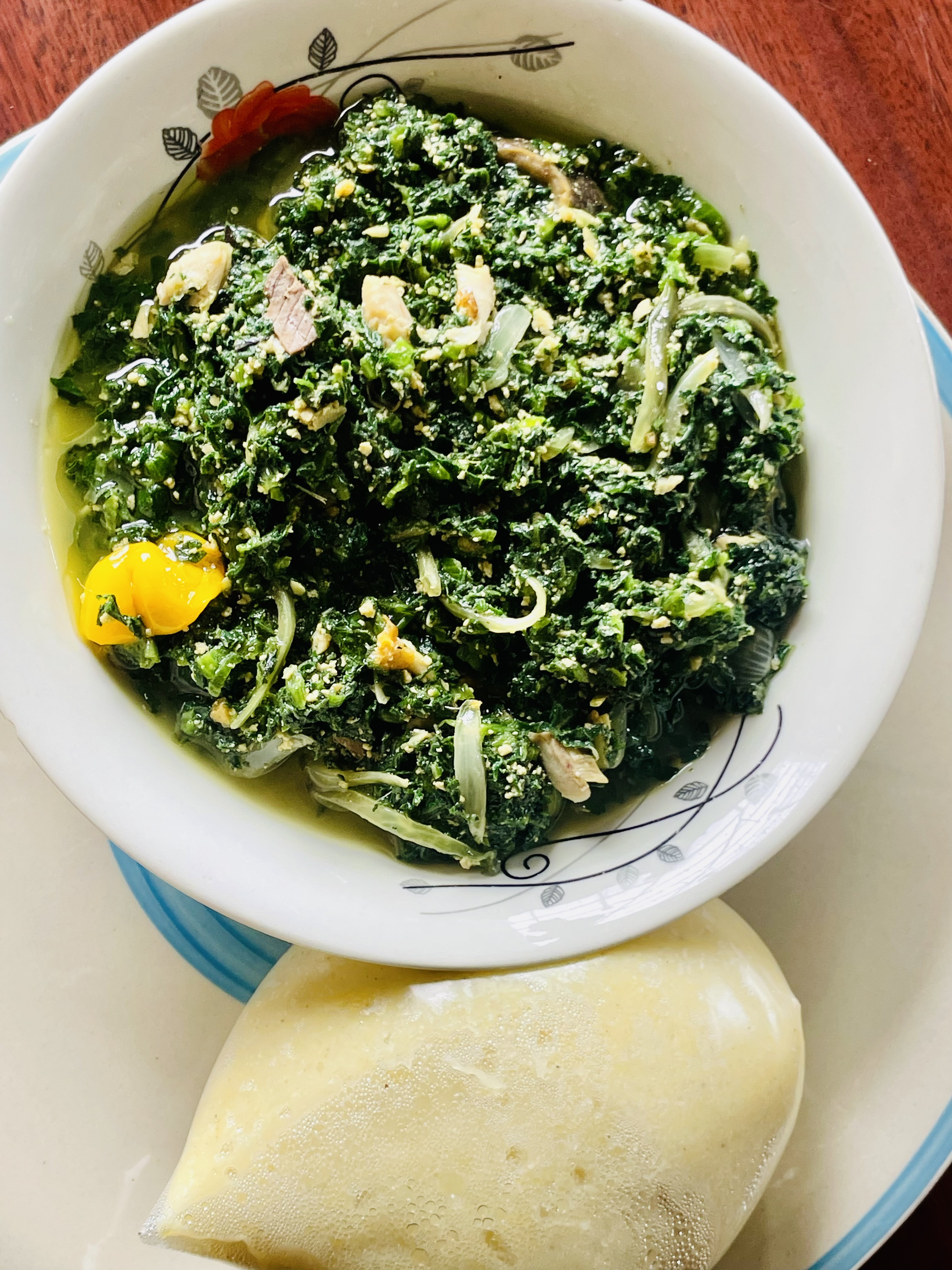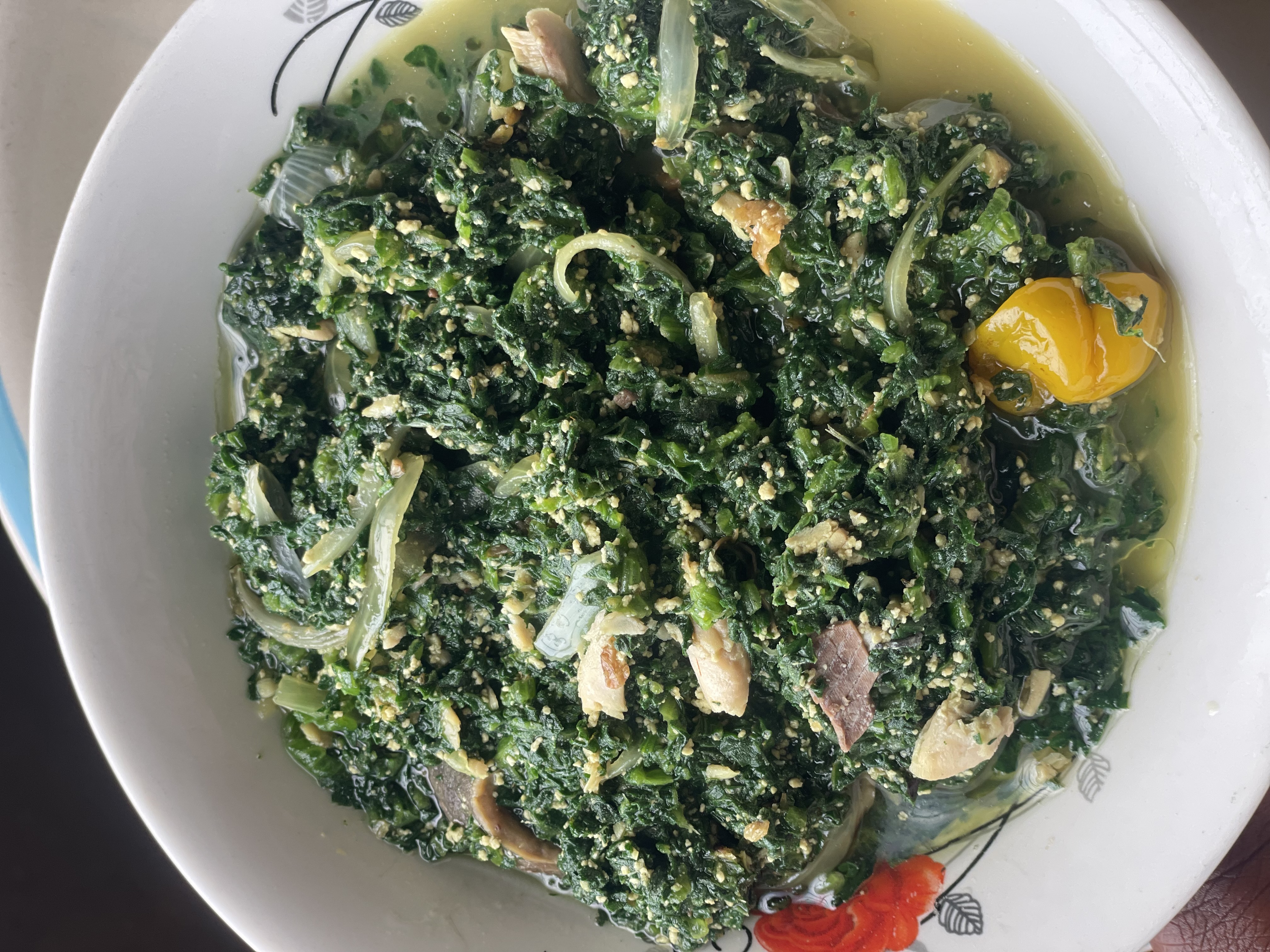 I have planned to prepare this delicious pumpkin leaves and eat it with fufucorn . This pumpkin leaves goes well fufucorn . I had my fresh fish , cryfish ,grind Egussi ,magi and salt .In less than no time the meal was ready to be consumed .