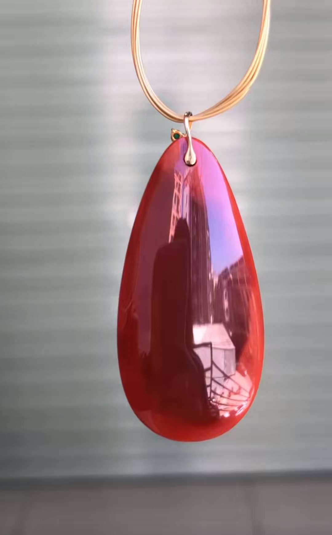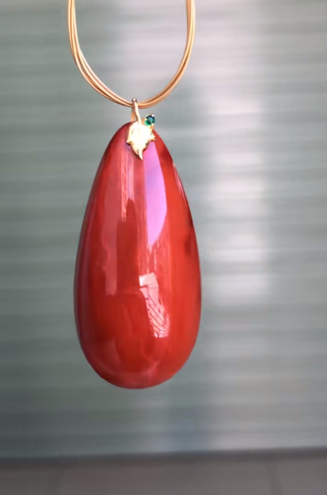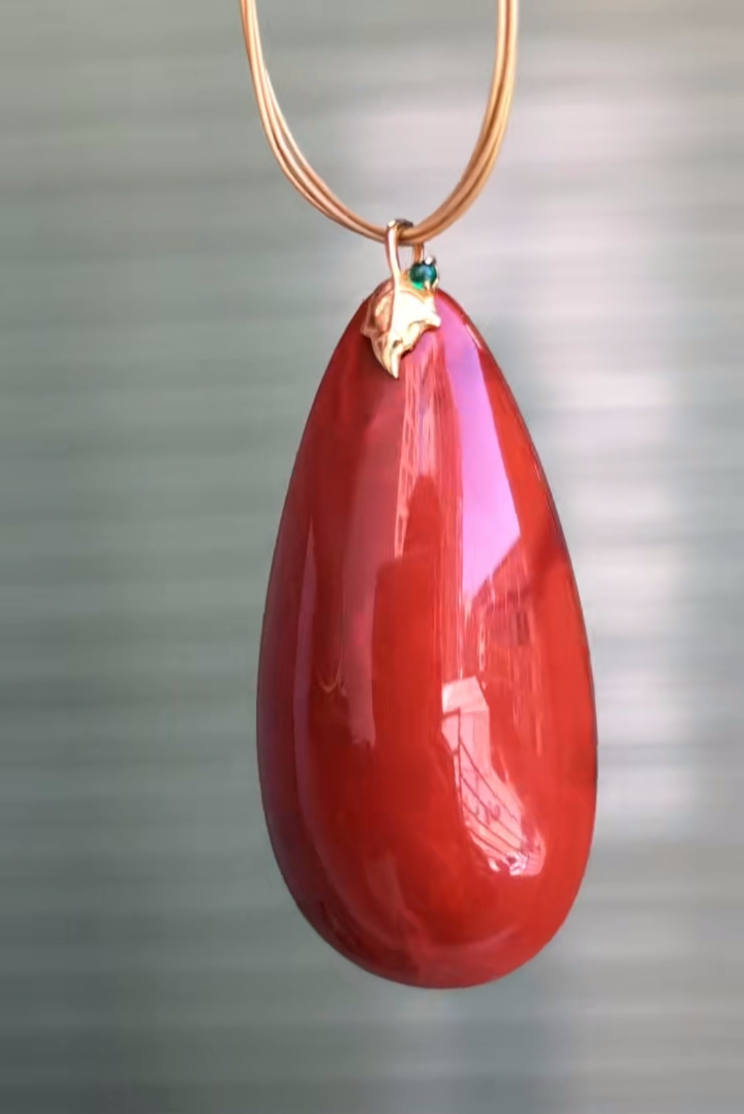 Southern Red Agate Teardrop Pendant, Wasi Old Material, Flame Red (Inlaid with 18k Gold). Original ore, free of impurities and cracks, full color and texture, clean and free of flaws. Vibrant red color, top-quality texture. Hand-polished. Dimensions: 40.2/19.2/12.5mm. Weight: 12.6 grams.