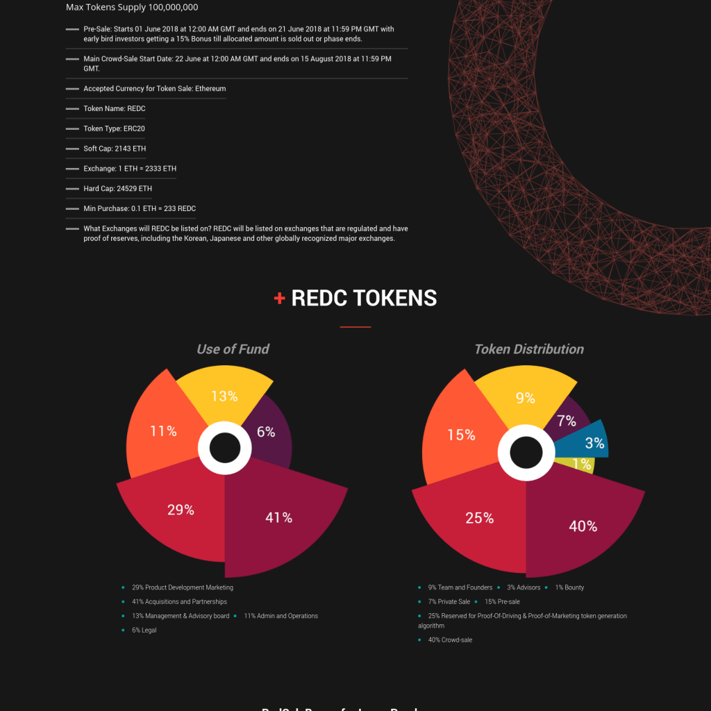 ICO and the sale of RedCab tokens are necessary to move from a centralized business model to a decentralized business model. In total, 62% of the 100,000,000 released tokens are allocated for sale.