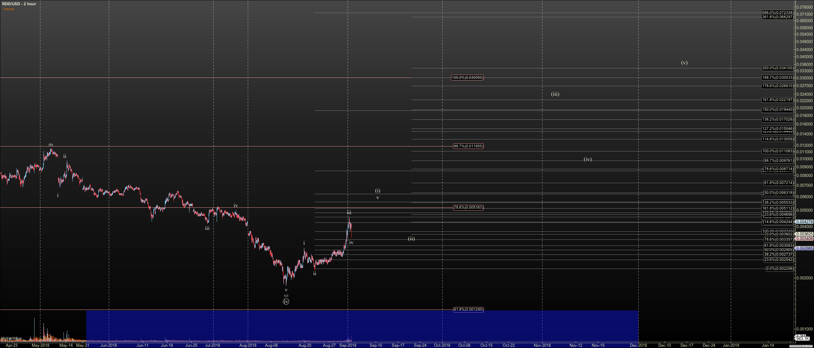Redd is taking a shot though. If you look at my fib levels on my chart the .0001295 level in pink and the blue zone, has always been key. We have hovered over it without entering this area. Further, I have a hard time making out the iv in wave C. While these two facts remain an issue- that is downside may be incomplete and it needs a clearer fourth, I now have an early break of resistance proceeding form a 5 wave diagonal in wave 1. Now, it is key for us to hold near today's low, and not breach .003. If we do, this is not impulsive. I'll watch for a diagonal to form, or for it to break down into the long term support zone.