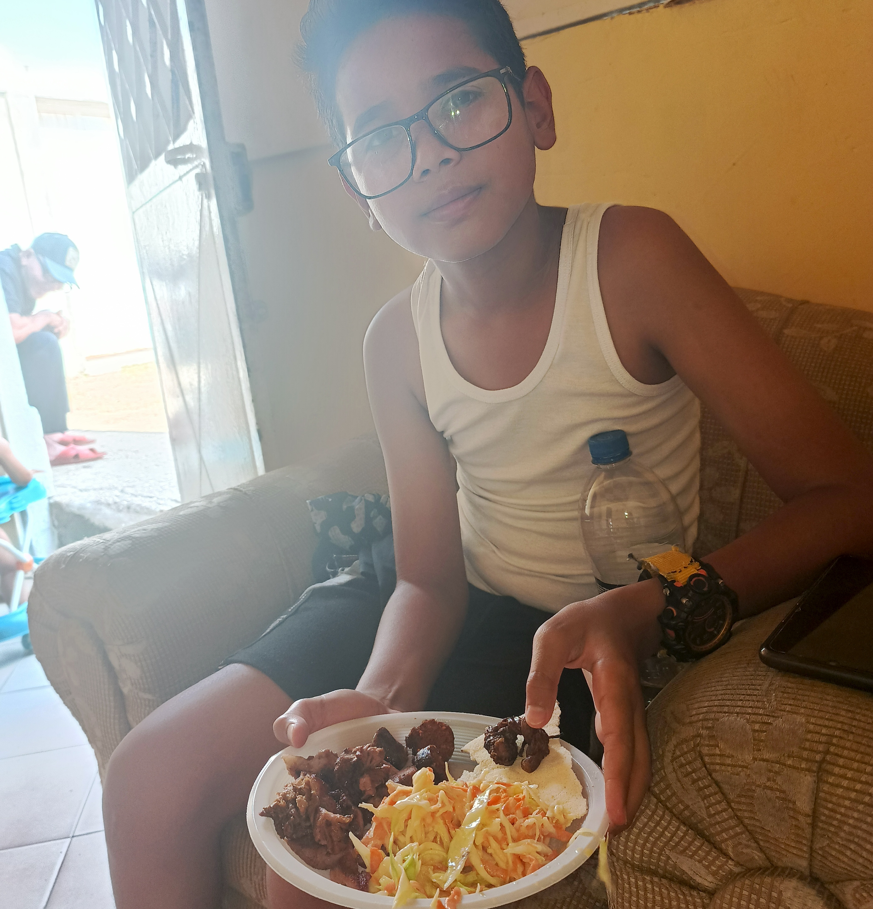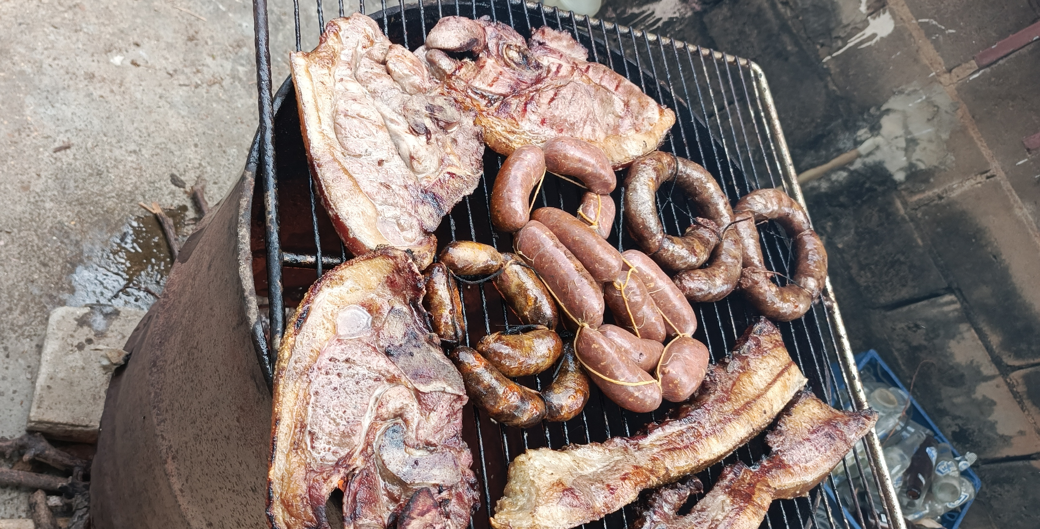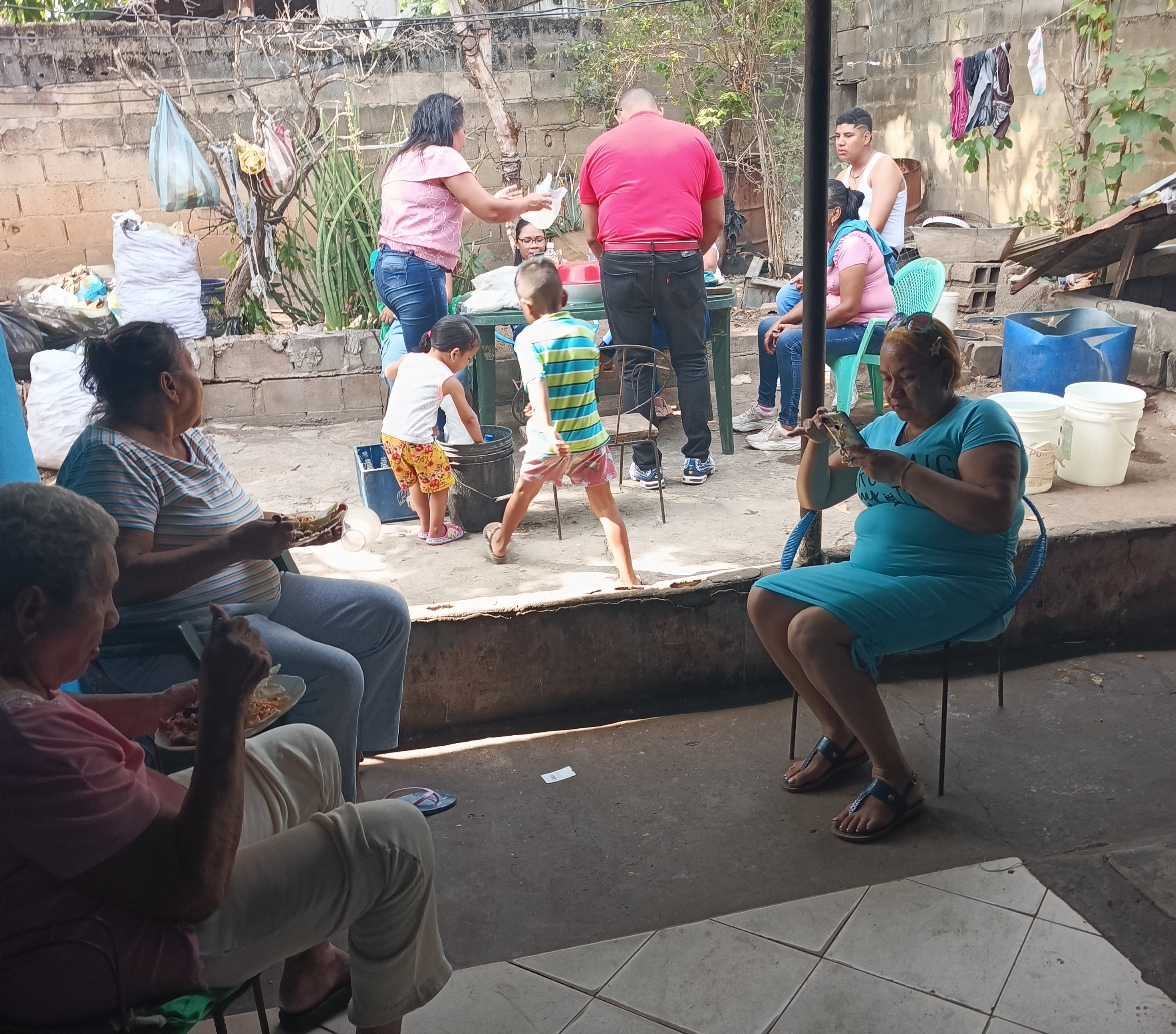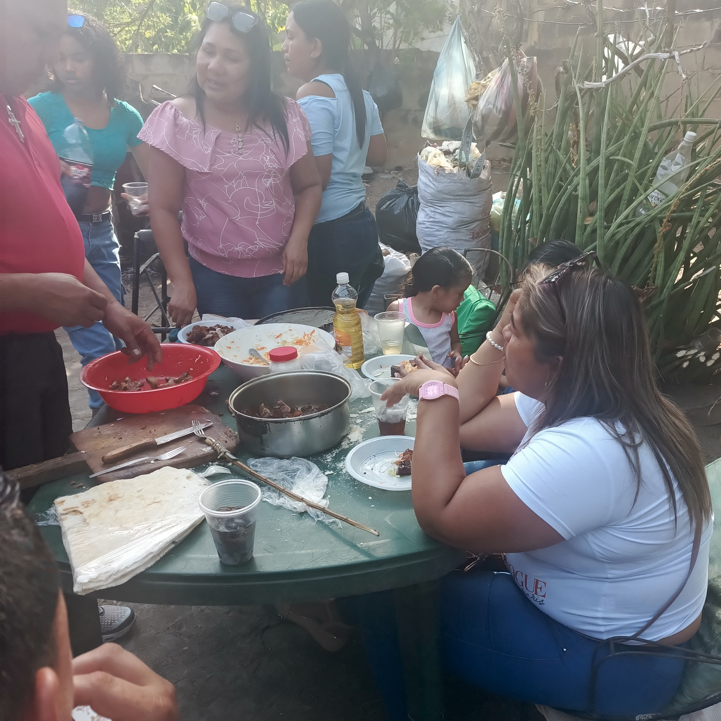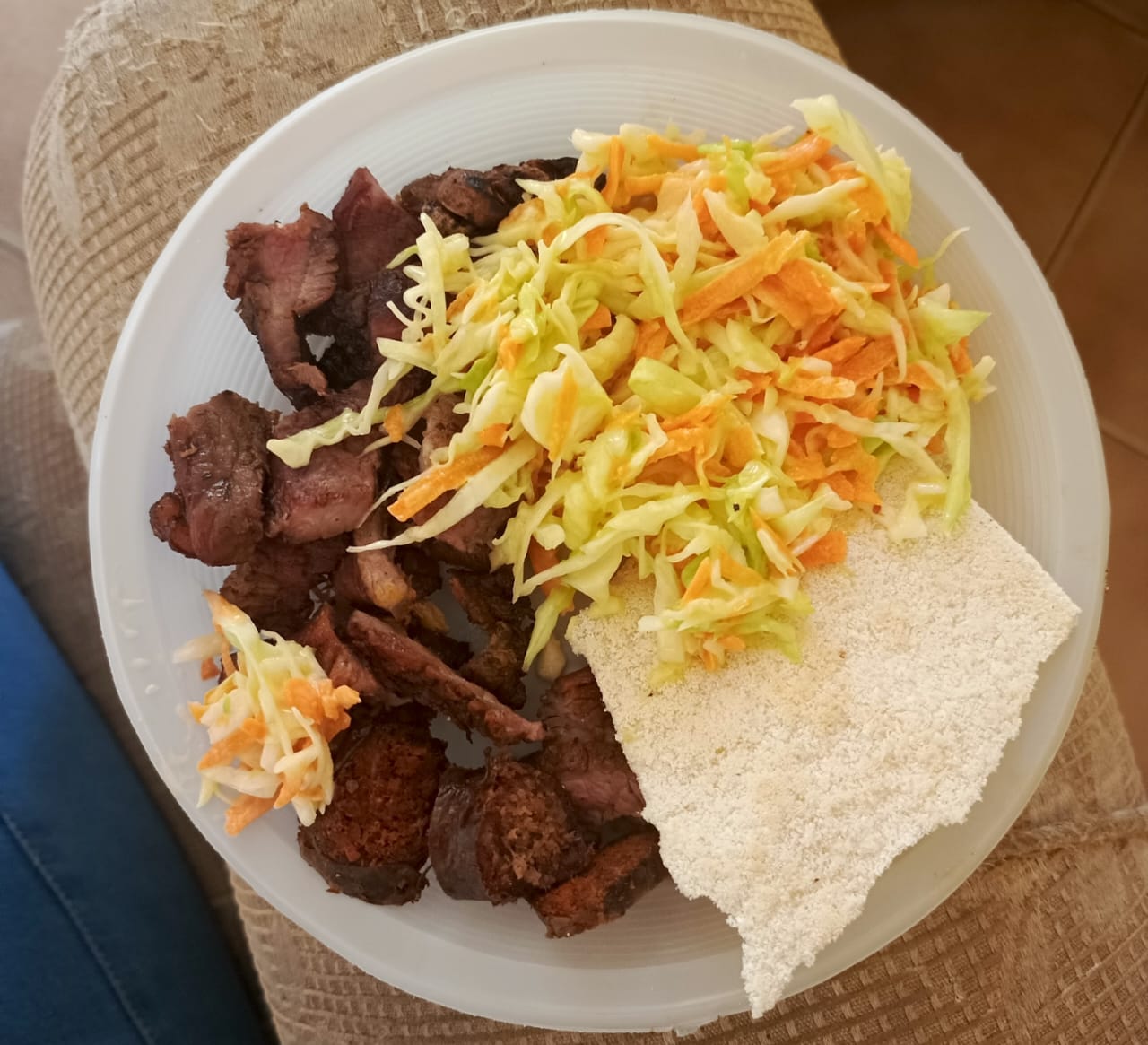 Cuando estuvo lista la comida sirvieron y comimos todos, estaba delicioso, carne, chorizo casabe y ensalada, alcanzó para todos