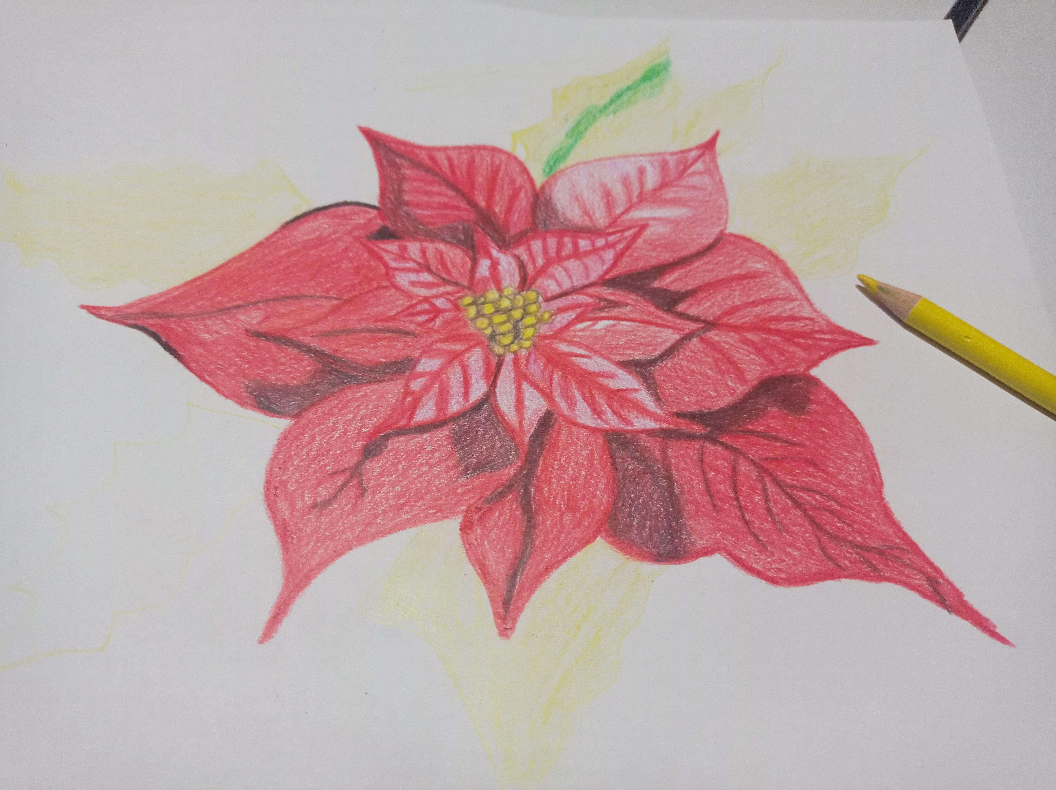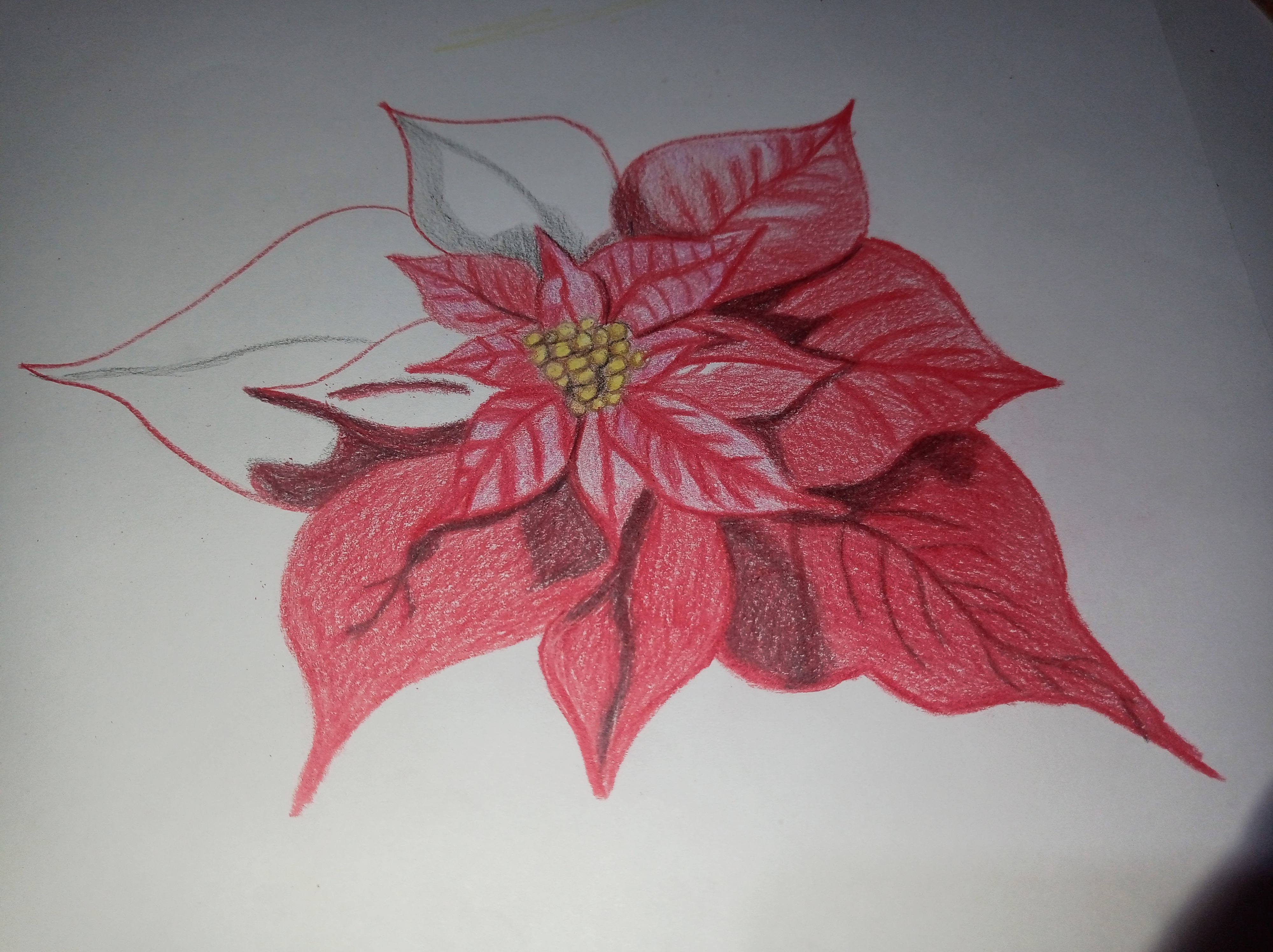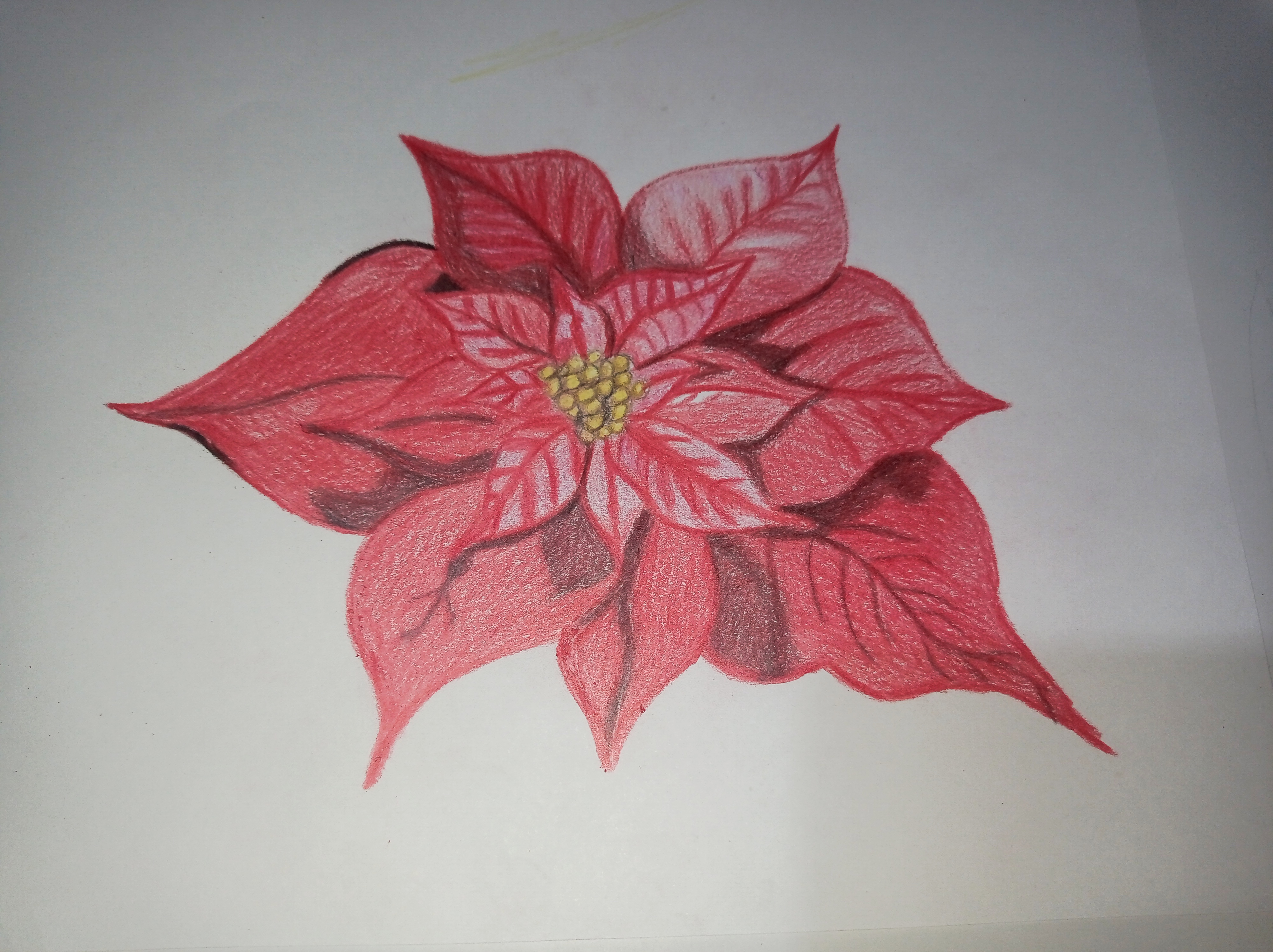 Dibuje usando lápices de colores la flor de navidad la cual es típica para esta temporada y su color rojo le hace llamativa. La verdad que es una hermosa flor que me gustaría tener en mi hogar,por lo pronto entonces la dibujare y reservaré este trabajo con mucho aprecio. Inicio mi trabajo dibujando el boceto de la flor con un color marrón y sin remarcar para poder guiarme luego con el color rojo que usaré pues esta flor es roja. Uso el color rojo para delinear la forma de la flor. Completo todo el boceto en este paso. Seguidamente estaré usando dos tonos para darle la iluminación a mi dibujo. En este caso he usado un tono rosado claro para dibujar las zonas de los pétalos más pequeños en el centro de la flor y algunos hacia sus extremos. Este efecto le dará más realismo a mi dibujo Dibujé los pétalos en el tono rosado claro y dibuje también con el color rojo Dibuja el centro de la flor en en color amarillo retocando con el color blanco sobre este color para darle una tonalidad más suave. También un retoqué con el color marrón en los espacios entre los tonos amarillos del centro de la flor. Es importante darle los efectos de sombra a mi dibujo por ello usé el color negro para colocar las sombras en espacios necesarios de la flor. Continúe dibujando los pétalos y delineando con el rojo más fuerte cada pétalo y también dibujando con este mismo color sobre el color negro para que se note en el tono de la sombra del dibujo. Continúe dibujando los pétalos de la flor en el mismo color rojo que estoy utilizando. Me gusta como desde ya se ven los efectos de sombras y luz sobre mi dibujo dándome un buen acabado en cada pétalo que voy dibujando. A cada pétalo de la flor le hice sus venitas en el centro ya que es típico en esta flor poseer esta característica en cada pétalo para ello usé el mismo color rojo y lo remarqué un poco para que se note con el color más intenso. Para continuar dibujando mi flor de Navidad le tracé con el color amarillo unas hojas que serán parte del detalle para mi dibujo. Use el color verde amarillo y blanco para ir dibujando las hojas en estos tonos. Con el blanco puedo reducir un poco la intensidad del color amarillo para los bordes de la hoja y así me va quedando. Dibujé una variedad de hojas alrededor de mi flor de Navidad para darle más vida con estos tonos verdes amarillos. También dibujé una semillas redonda en color rojo para darle detalles y sea como una aplicación para mi dibujo Nuevamente Me encantó el resultado de mi dibujo así que lo di por concluido. Es una flor muy linda está de navidad que sirve para la temporada y decorar muchos espacios en nuestro hogar, ciudad siendo muy hermosa. Bueno mi apreciado @victornavarro me encanto participar en este hermoso espacio, hoy con el tema dibujo de flor de navidad. Espero te guste y a todos mis amigos por su apoyo. Invito a participar a mis amigos @miguelito80 @elinav @pandora2010 @karianaporras @dexsyluz @inspiracion
