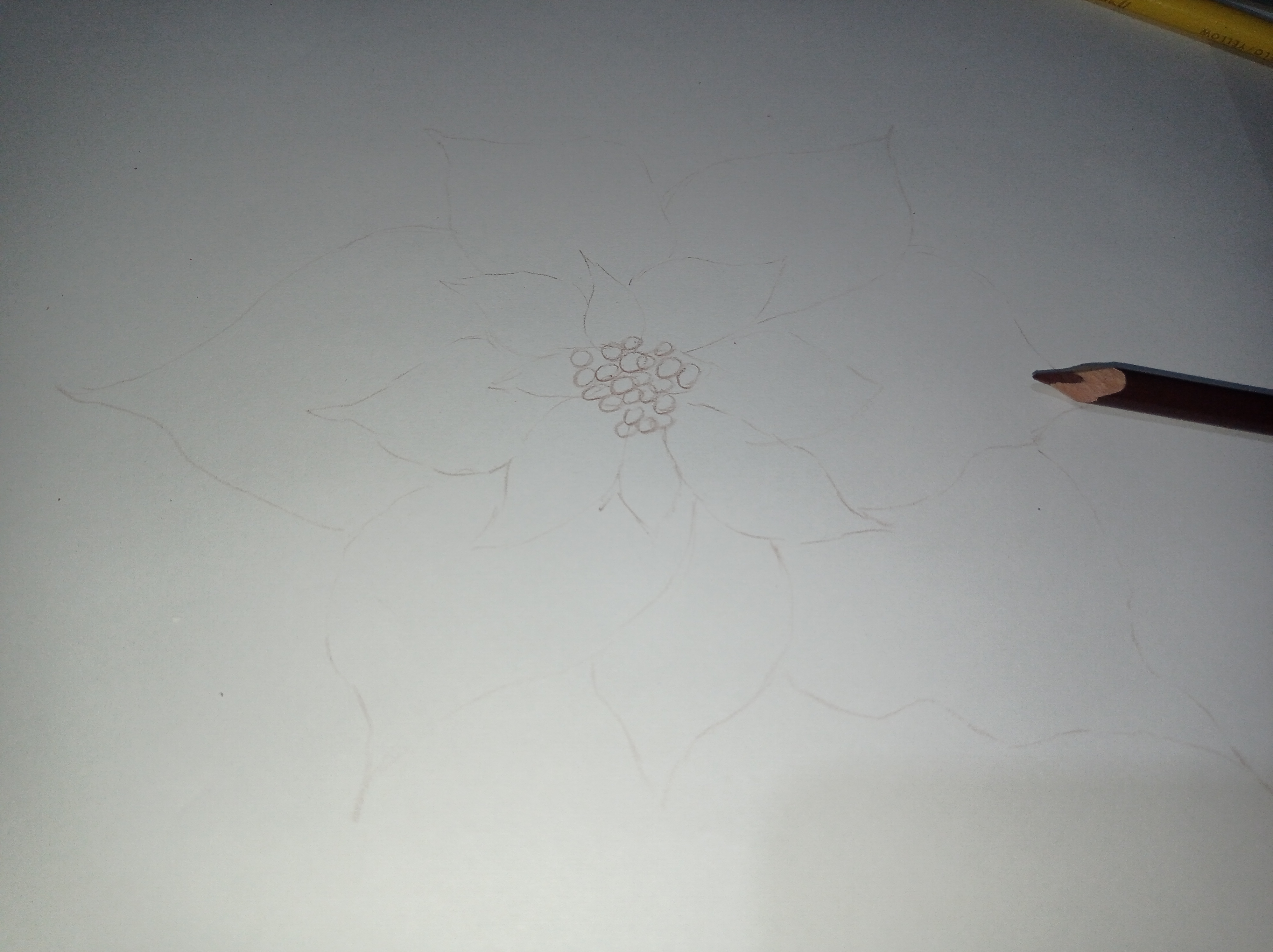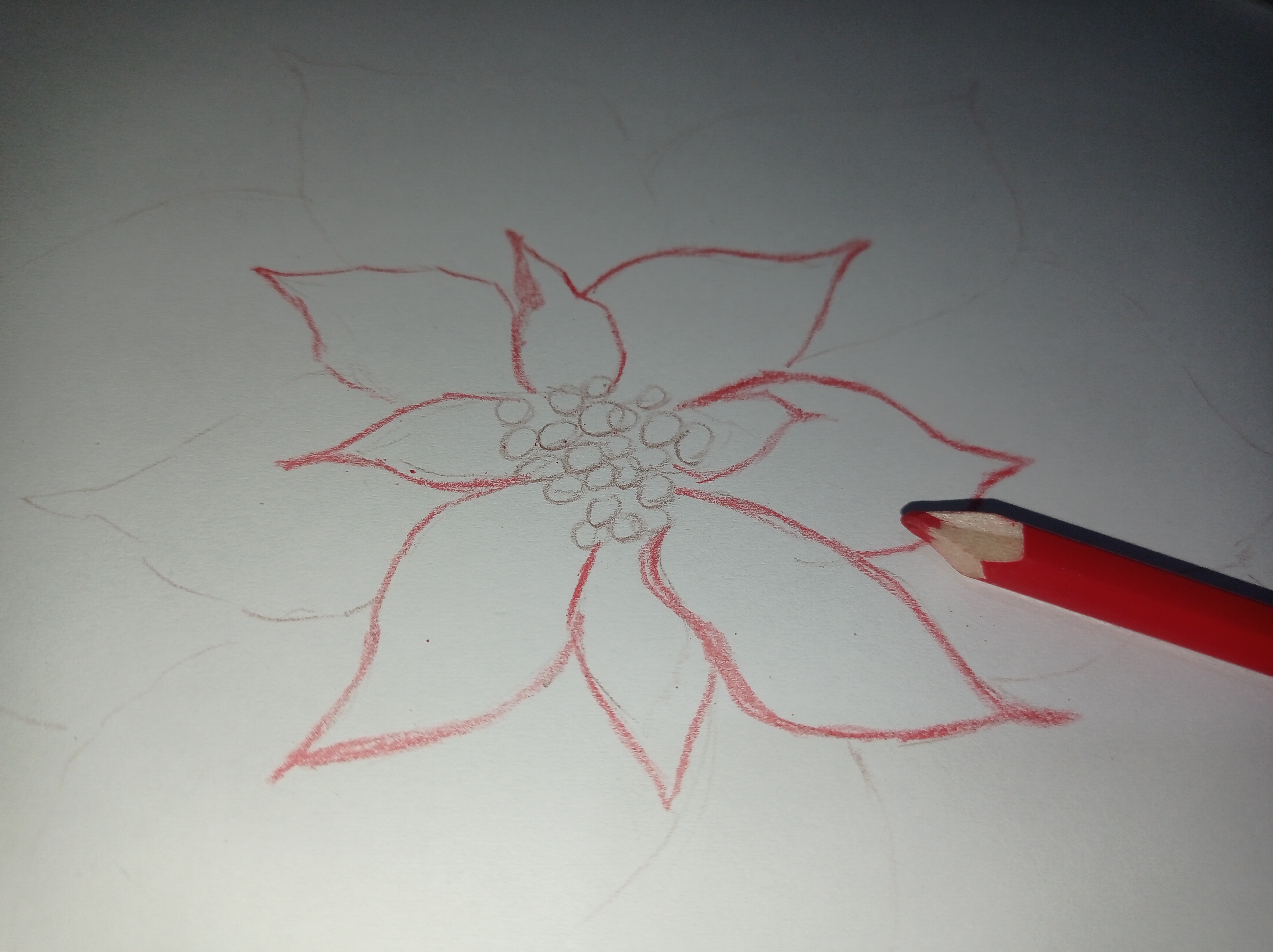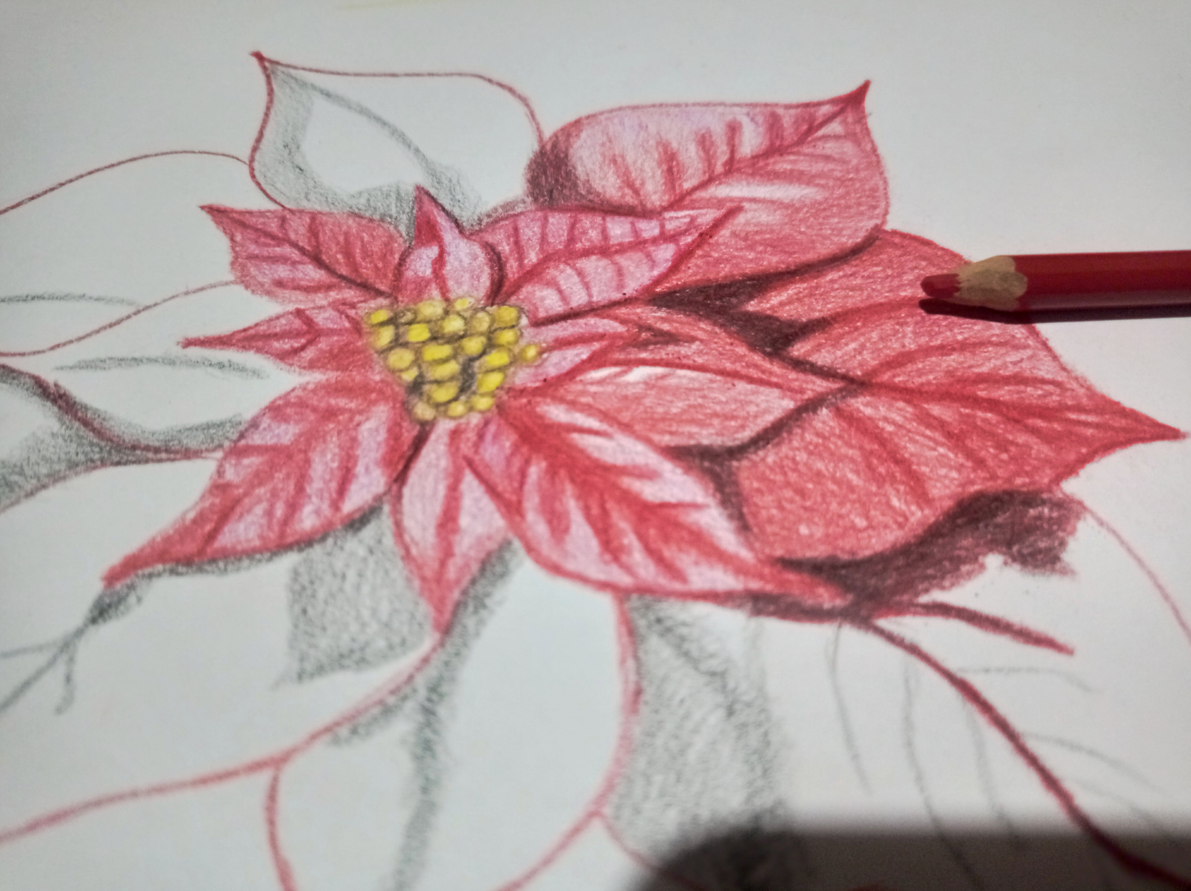 Dibuje usando lápices de colores la flor de navidad la cual es típica para esta temporada y su color rojo le hace llamativa. La verdad que es una hermosa flor que me gustaría tener en mi hogar,por lo pronto entonces la dibujare y reservaré este trabajo con mucho aprecio. Inicio mi trabajo dibujando el boceto de la flor con un color marrón y sin remarcar para poder guiarme luego con el color rojo que usaré pues esta flor es roja. Uso el color rojo para delinear la forma de la flor. Completo todo el boceto en este paso. Seguidamente estaré usando dos tonos para darle la iluminación a mi dibujo. En este caso he usado un tono rosado claro para dibujar las zonas de los pétalos más pequeños en el centro de la flor y algunos hacia sus extremos. Este efecto le dará más realismo a mi dibujo Dibujé los pétalos en el tono rosado claro y dibuje también con el color rojo Dibuja el centro de la flor en en color amarillo retocando con el color blanco sobre este color para darle una tonalidad más suave. También un retoqué con el color marrón en los espacios entre los tonos amarillos del centro de la flor. Es importante darle los efectos de sombra a mi dibujo por ello usé el color negro para colocar las sombras en espacios necesarios de la flor. Continúe dibujando los pétalos y delineando con el rojo más fuerte cada pétalo y también dibujando con este mismo color sobre el color negro para que se note en el tono de la sombra del dibujo. Continúe dibujando los pétalos de la flor en el mismo color rojo que estoy utilizando. Me gusta como desde ya se ven los efectos de sombras y luz sobre mi dibujo dándome un buen acabado en cada pétalo que voy dibujando. A cada pétalo de la flor le hice sus venitas en el centro ya que es típico en esta flor poseer esta característica en cada pétalo para ello usé el mismo color rojo y lo remarqué un poco para que se note con el color más intenso. Para continuar dibujando mi flor de Navidad le tracé con el color amarillo unas hojas que serán parte del detalle para mi dibujo. Use el color verde amarillo y blanco para ir dibujando las hojas en estos tonos. Con el blanco puedo reducir un poco la intensidad del color amarillo para los bordes de la hoja y así me va quedando. Dibujé una variedad de hojas alrededor de mi flor de Navidad para darle más vida con estos tonos verdes amarillos. También dibujé una semillas redonda en color rojo para darle detalles y sea como una aplicación para mi dibujo Nuevamente Me encantó el resultado de mi dibujo así que lo di por concluido. Es una flor muy linda está de navidad que sirve para la temporada y decorar muchos espacios en nuestro hogar, ciudad siendo muy hermosa. Bueno mi apreciado @victornavarro me encanto participar en este hermoso espacio, hoy con el tema dibujo de flor de navidad. Espero te guste y a todos mis amigos por su apoyo. Invito a participar a mis amigos @miguelito80 @elinav @pandora2010 @karianaporras @dexsyluz @inspiracion